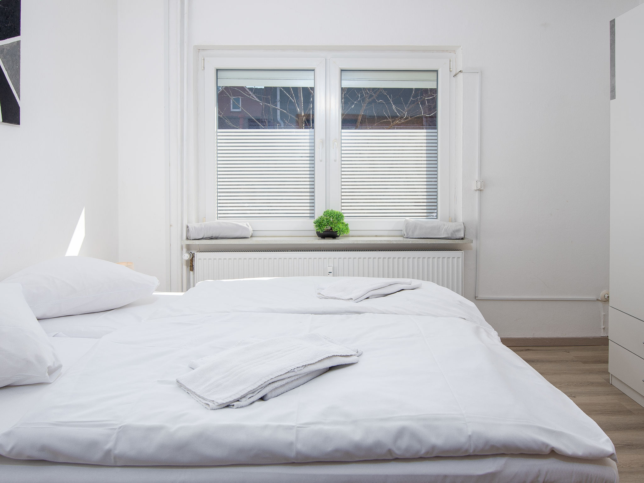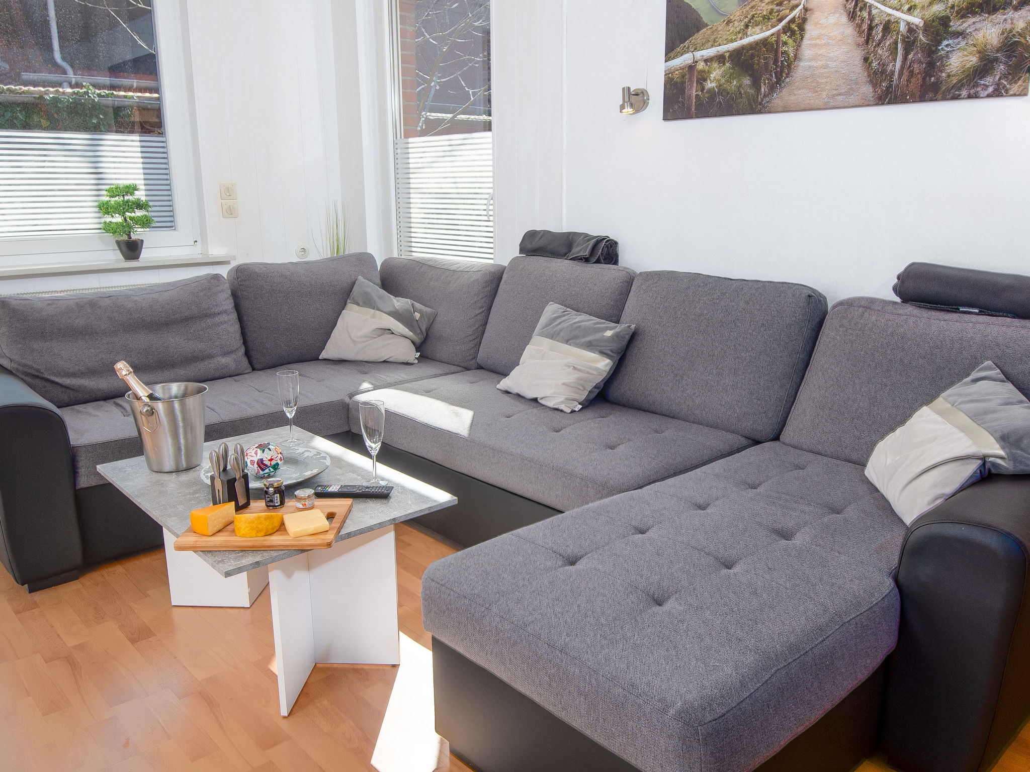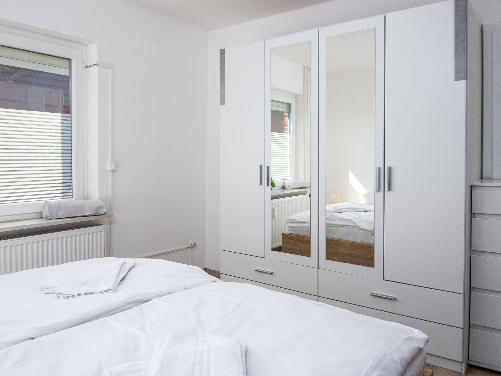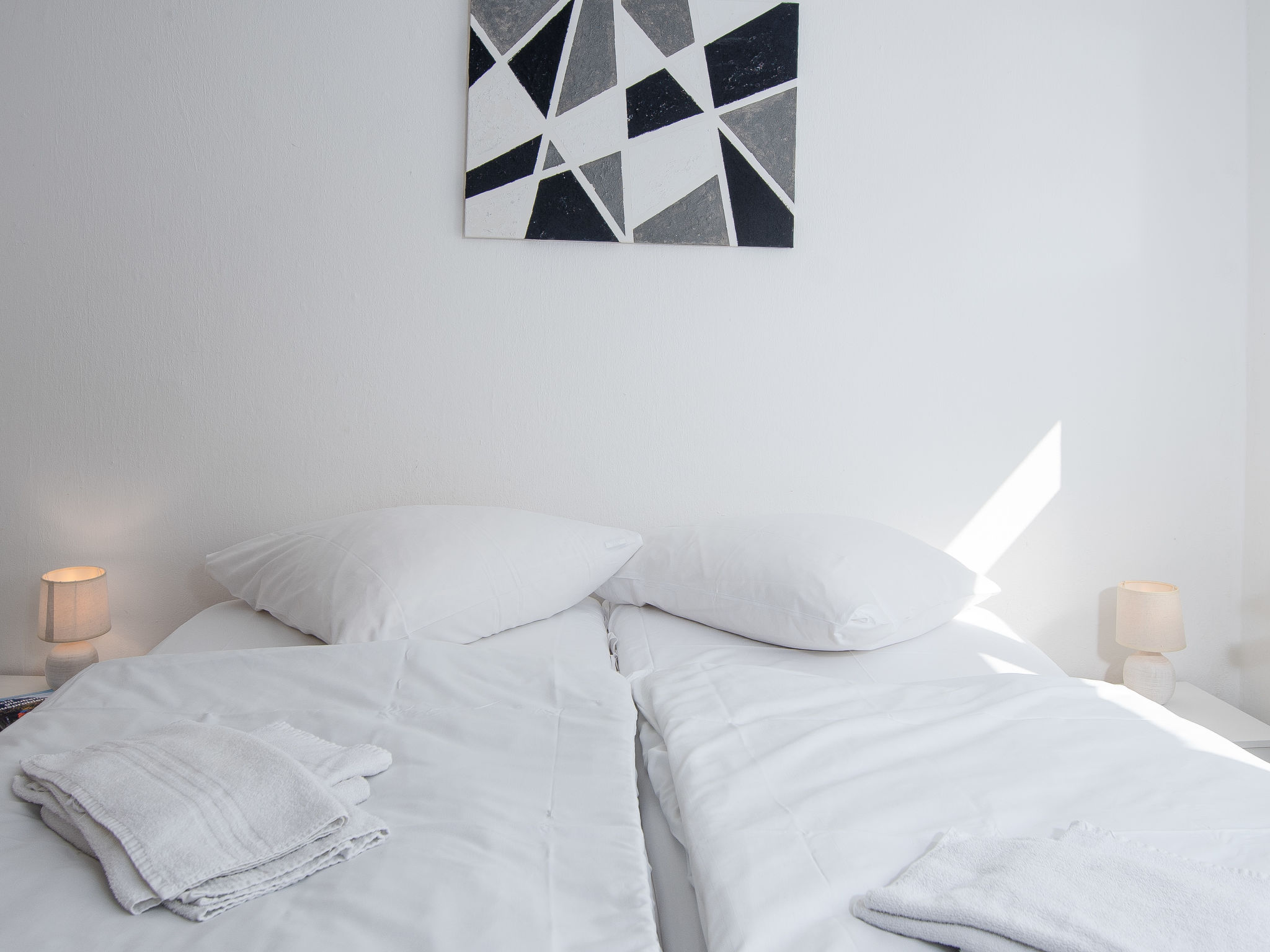 3-Zimmer-Wohnung 80 m2, im Erdgeschoss. Gemütlich eingerichtet: Wohnzimmer mit Sat-TV (Flachbildschirm). 1 Zimmer mit 1 Doppelbett (2 x 90 cm, Länge 200 cm). 1 Zimmer mit 1 Ausziehbett (2 Pers. 2 x 90 cm, Länge 200 cm). Küche (Backofen, Geschirrspüler, 4 Glaskeramikherd Platten, Toaster, Wasserkocher, Mikrowelle, elektrische Kaffeemaschine) mit Esstisch. Bad/Dusche/WC. Terrasse überdacht. Terrassenmöbel. Zur Verfügung: Kinderhochstuhl (extra). Internet (Wireless LAN, gratis). Bitte beachten: Rauchmelder. Rauchen erlaubt.
