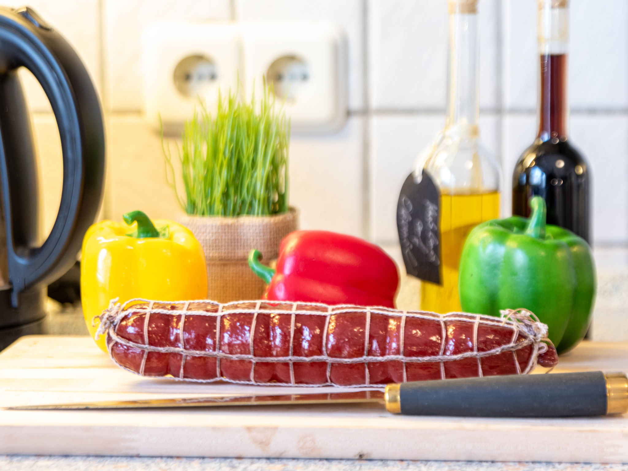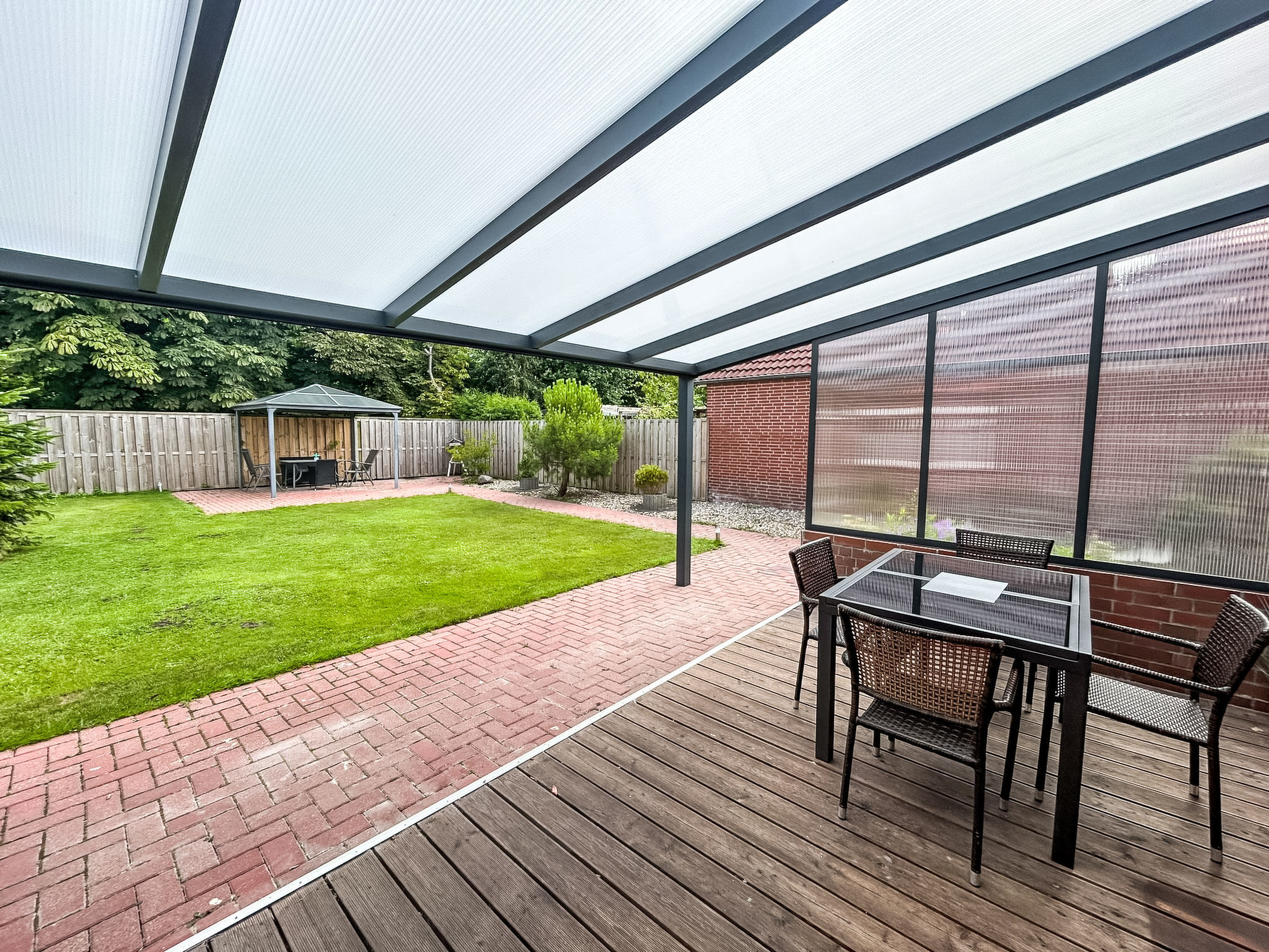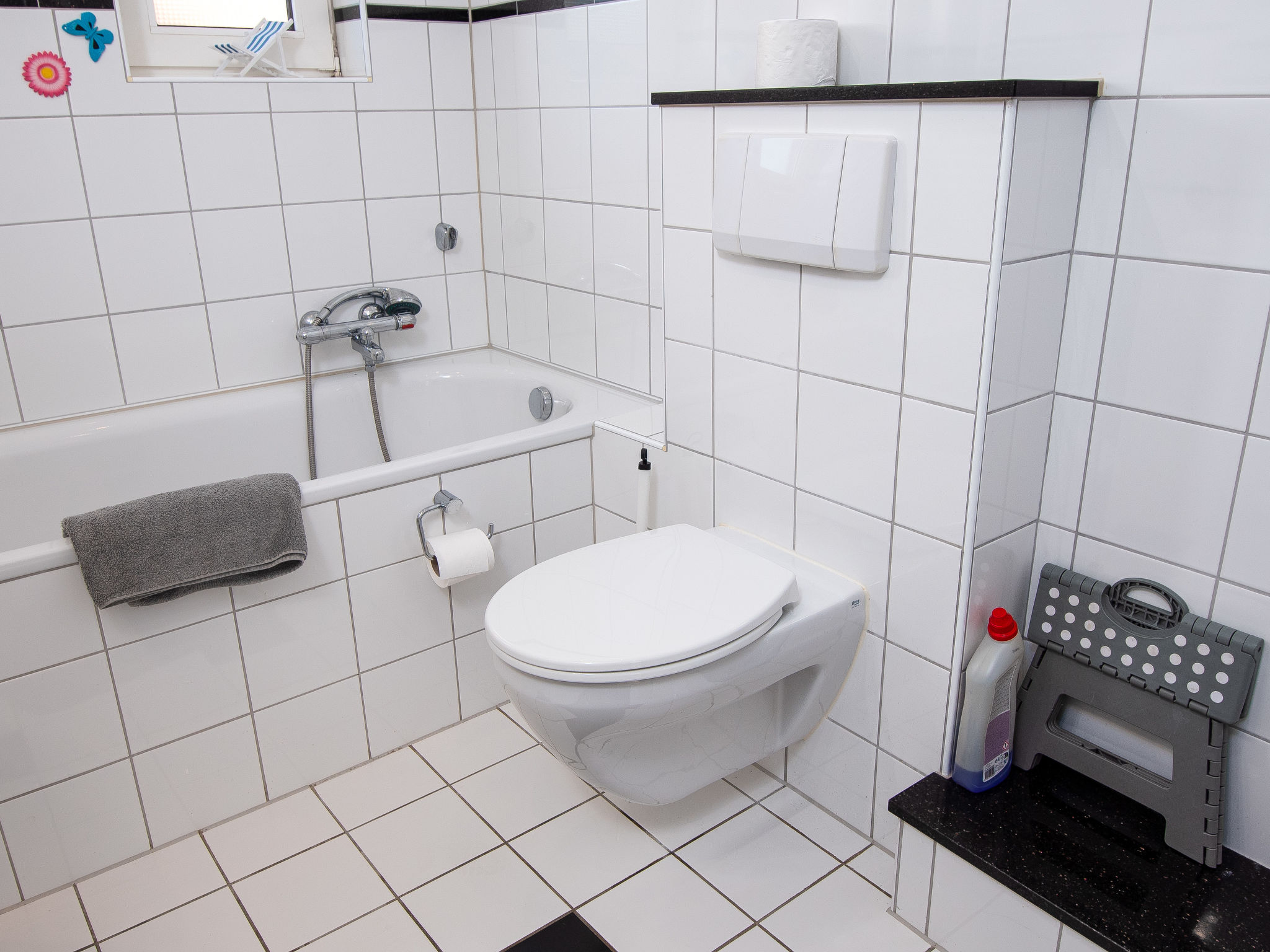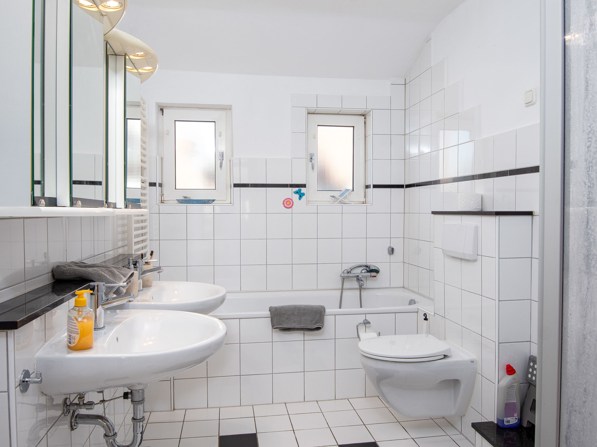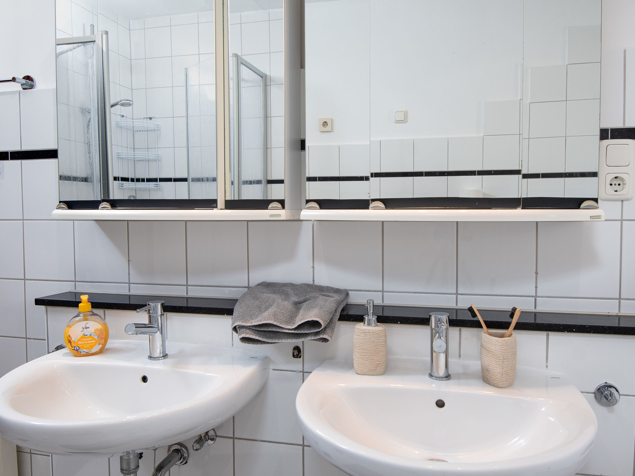 3-Zimmer-Wohnung 80 m2, im Erdgeschoss. Gemütlich eingerichtet: Wohnzimmer mit Sat-TV (Flachbildschirm). 1 Zimmer mit 1 Doppelbett (2 x 90 cm, Länge 200 cm). 1 Zimmer mit 1 Ausziehbett (2 Pers. 2 x 90 cm, Länge 200 cm). Küche (Backofen, Geschirrspüler, 4 Glaskeramikherd Platten, Toaster, Wasserkocher, Mikrowelle, elektrische Kaffeemaschine) mit Esstisch. Bad/Dusche/WC. Terrasse überdacht. Terrassenmöbel. Zur Verfügung: Kinderhochstuhl (extra). Internet (Wireless LAN, gratis). Bitte beachten: Rauchmelder. Rauchen erlaubt.