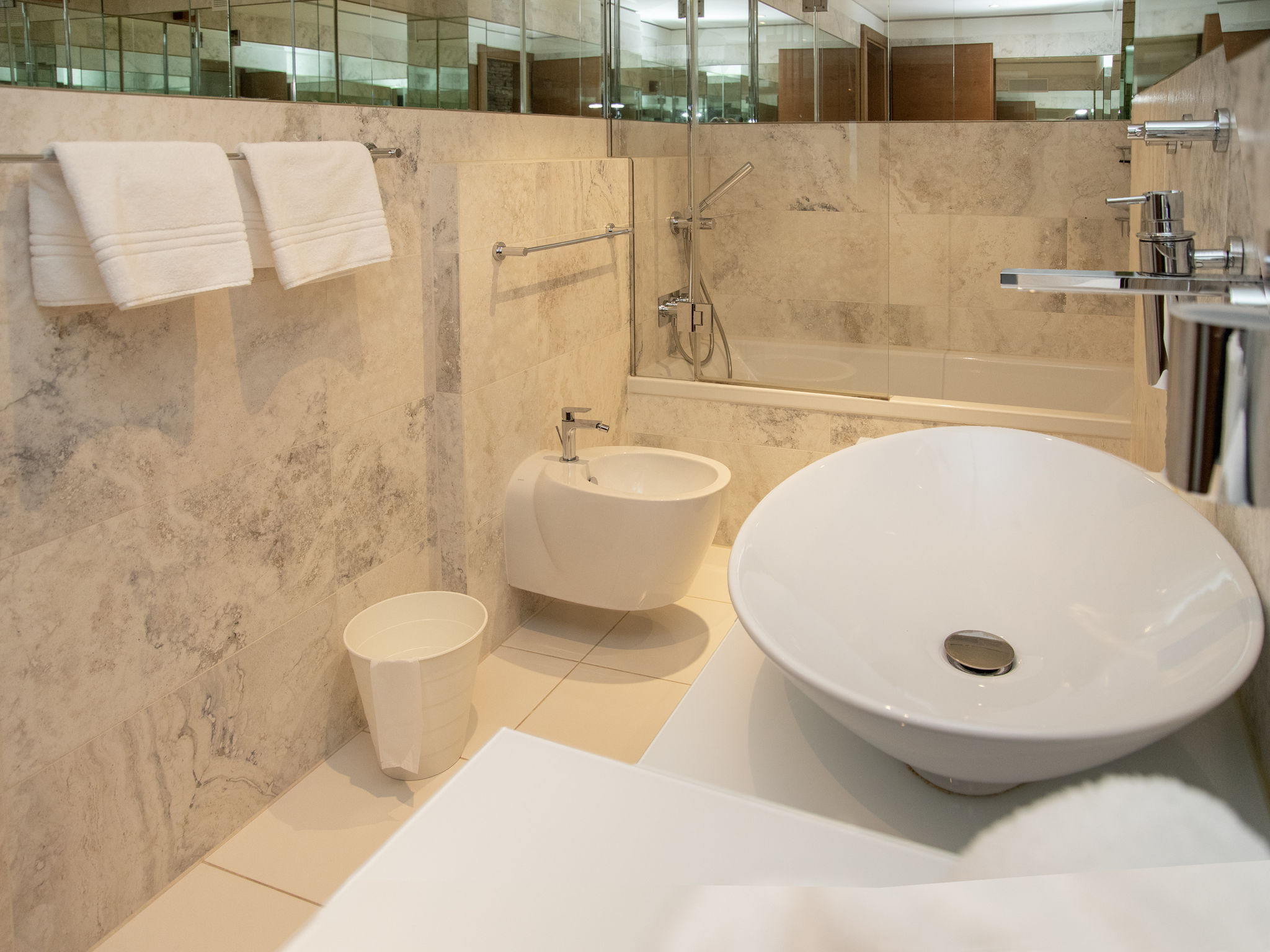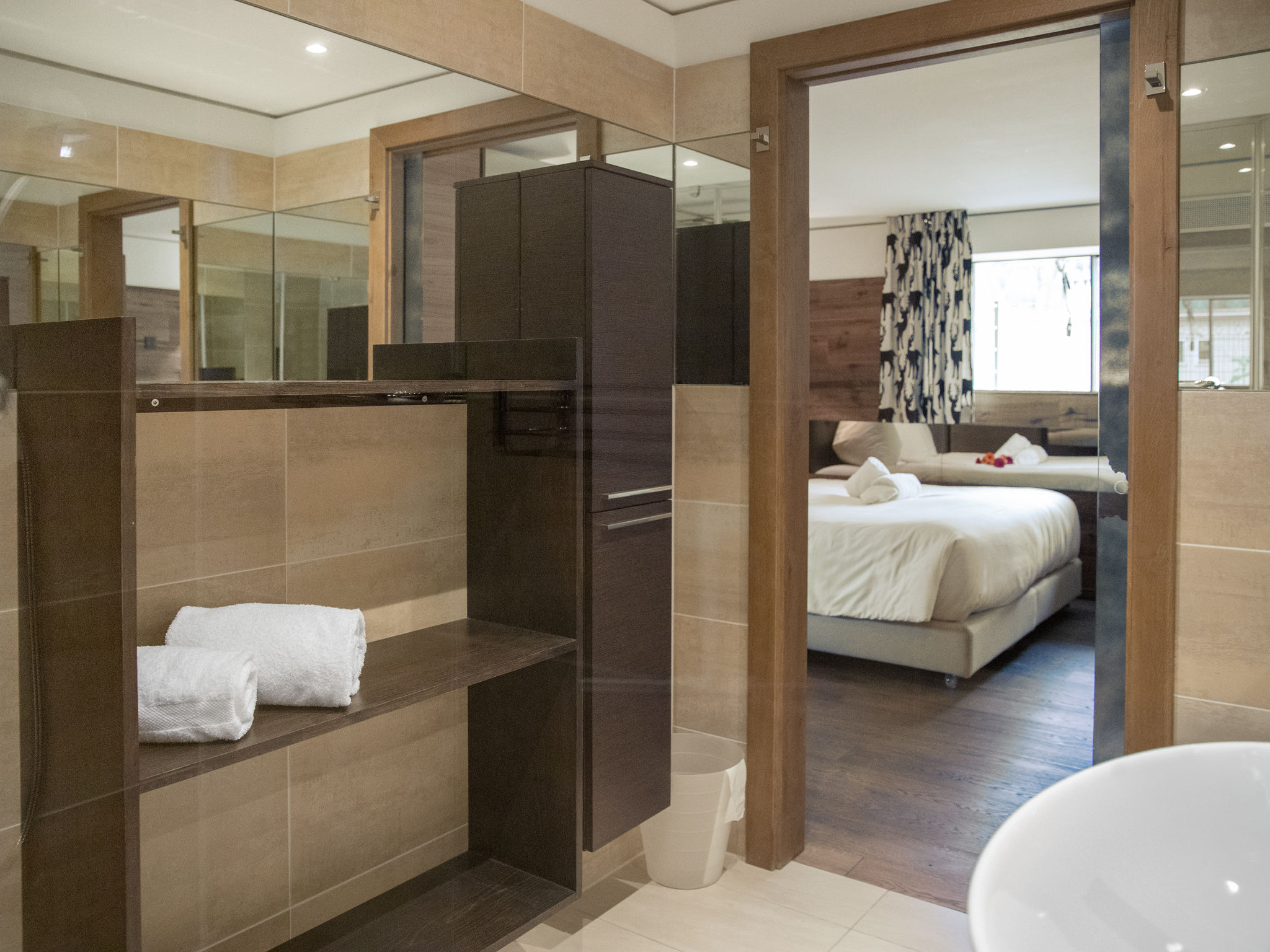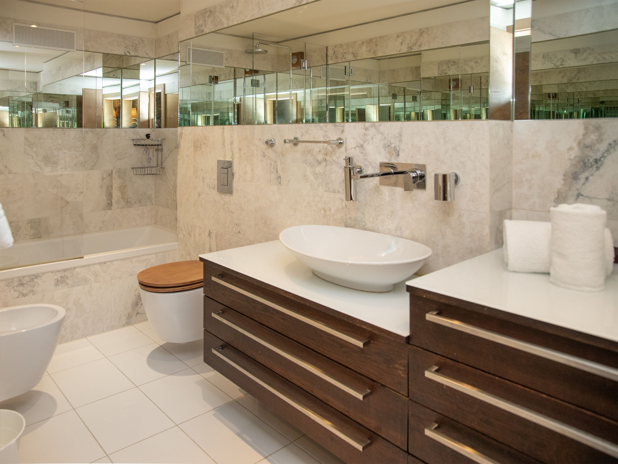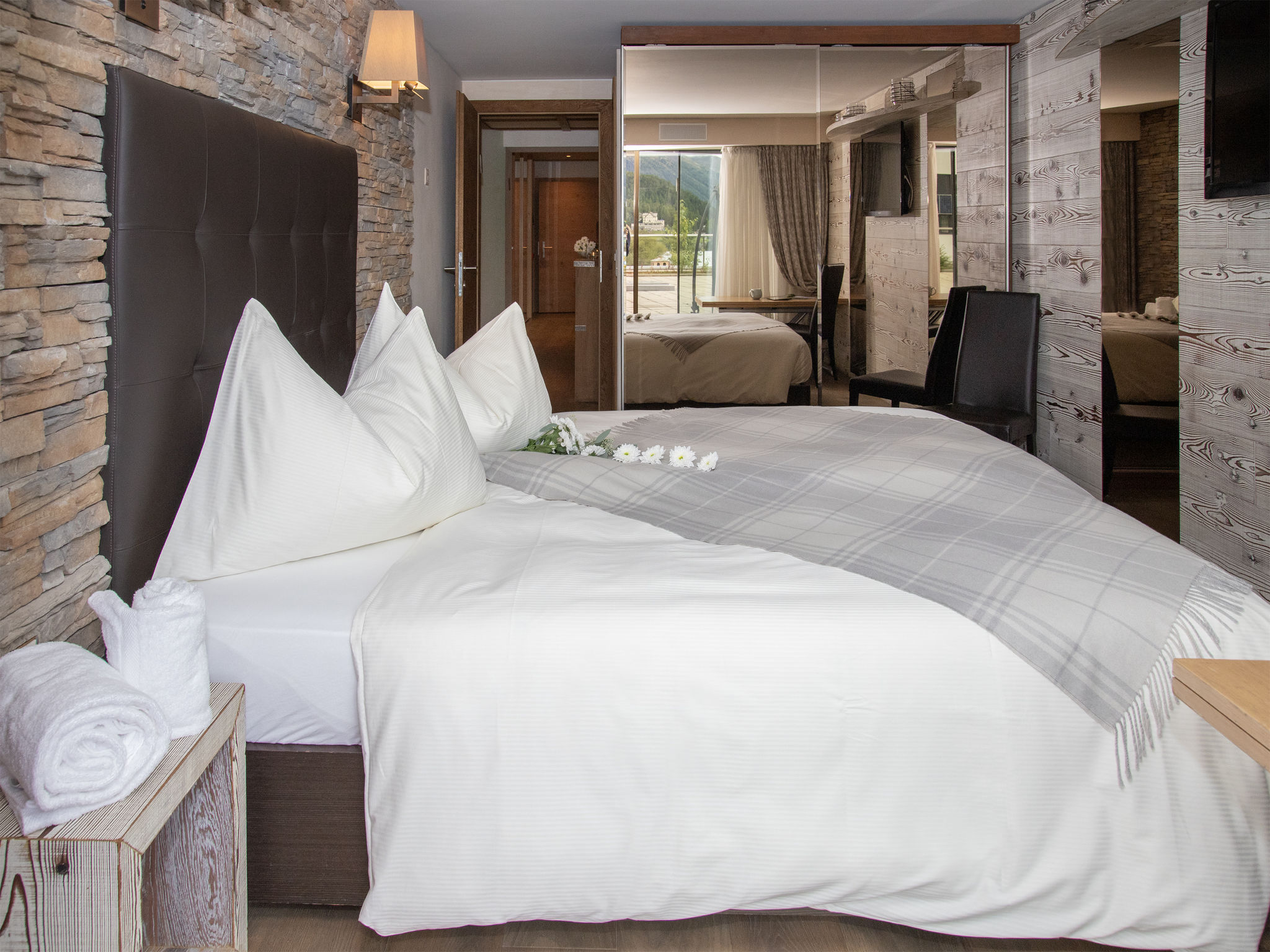 "Chesa Piz Mezdi - St. Moritz", 3-Zimmer-Wohnung 120 m2 im 2. Stock. Geräumig und hell, komfortabel und stilvoll eingerichtet: offenes Wohn-/Esszimmer mit Panoramafenster mit Esstisch, Küchenblock und TV (Flachbildschirm). Ausgang zur Terrasse, Richtung Osten. 1 Zimmer mit 1 franz. Bett (1 x 170 cm, Länge 200 cm), Dusche/Bidet/WC. 1 Zimmer mit 1 Doppelbett (1 x 180 cm, Länge 200 cm), Bad/Bidet/WC und TV (Flachbildschirm). Ausgang zur Terrasse. Grosse Wohnküche (Backofen, Geschirrspüler, 4 Induktionskochplatten, Toaster, Wasserkocher, Mikrowelle, Tiefkühler, elektrische Kaffeemaschine, Kapseln für die Kaffeemaschine (Nespresso) extra, Racletteofen, Fondue Set (Käse)). Sep. WC, Sauna. Holzböden. Terrassenmöbel, Gartengrill (mobil). Schöne Sicht auf den See, die Berge und die Landschaft. Zur Verfügung: Bügeleisen, Haartrockner. Internet (Wireless LAN, gratis). Garage Nr. 4 in 300 m, Höhe 205 cm, Breite 240 cm. Bitte beachten: nicht geeignet für Kinder unter 6 Jahren. Nichtraucher-Unterkunft, Nichtraucher-Haus. -Terrasse 170m2 (nur Sommer) - wird von 2 Apartments genützt.