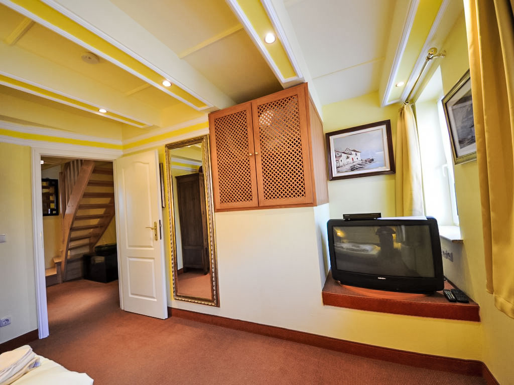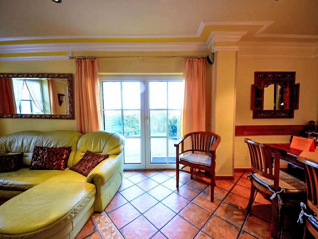 "Kirchhaus", 4-Zimmer-Reihenhaus 78 m2 auf 3 Stockwerken, im Erdgeschoss. Wohn-/Esszimmer mit Sat-TV, Video, CD und Stereoanlage. Offene Küche (Backofen, Geschirrspüler, Mikrowelle, elektrische Kaffeemaschine). Dusche/WC. Obergeschoss: 1 Doppelzimmer. Dusche/WC. Dachgeschoss: 1 abgeschrägtes Zimmer mit 1 Bett. 1 abgeschrägtes Doppelzimmer. Terrasse, Garten. Terrassenmöbel. Zur Verfügung: Waschmaschine, Wäschetrockner, Kinderhochstuhl. Internet (Wireless LAN, gratis). Bitte beachten: Nichtraucher-Haus. Maximal 1 Haustier/Hund erlaubt. 1 kostenloser PKW-Stellplatz vorhanden, auf Wunsch und nach Vorbestellung können weitere Stellplätze zu je EUR 4.00/Tag bereitgestellt werden.