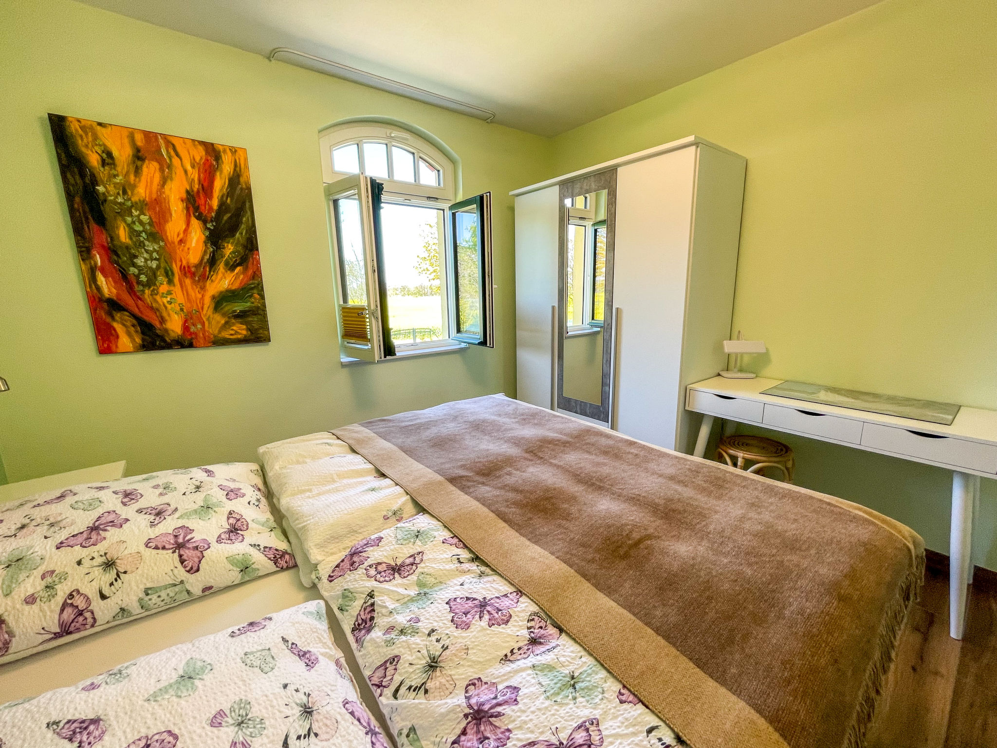 Appartementhaus "Altherscher Hof - Oase der Ruhe", auf 2 Stockwerken, renoviert im Jahre 2021, umgeben von Wiesen und Feldern. 14 km vom Zentrum von Grimmen, am Ortsrand, 40 km vom Zentrum von Stralsund, 65 km vom Zentrum von Rostock, ruhige Lage, in einer Sackgasse, im Grünen. Zur Mitbenutzung: Park 17 ha mit Blumen und Bäumen, Wiese, Hof, Naturteich. Im Hause: Waschmaschine (zur Mitbenutzung). 2 km lange holprige Zufahrt bis zum Grundstück. Parkplatz auf dem Grundstück. Supermarkt 12 km, Restaurant 12 km, Sandstrand "Dierhagen (Fischland)" 45 km. Nahe gelegene Sehenswürdigkeiten: Ozeaneum Stralsund 45 km, Halbinsel Fischland/Darß/Zingst 45 km, Insel Rügen 50 km, Insel Usedom 90 km. Bitte beachten: Fahrzeug empfohlen. Auf dem Grundstück Tierhaltung. Der Besitzer wohnt auf dem gleichen Grundstück. In diesem Haus sind weitere Ferienwohnungen mietbar. Ferienwohnung Ref. DE9220.101.1 befindet sich auf dem gleichen Grundstück.