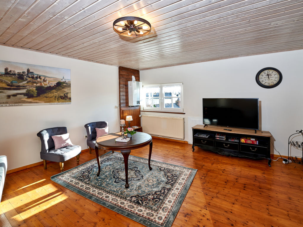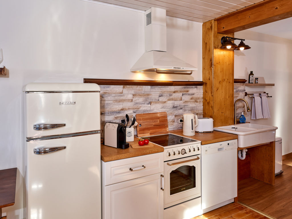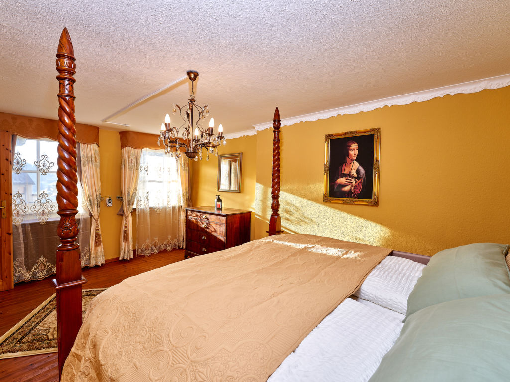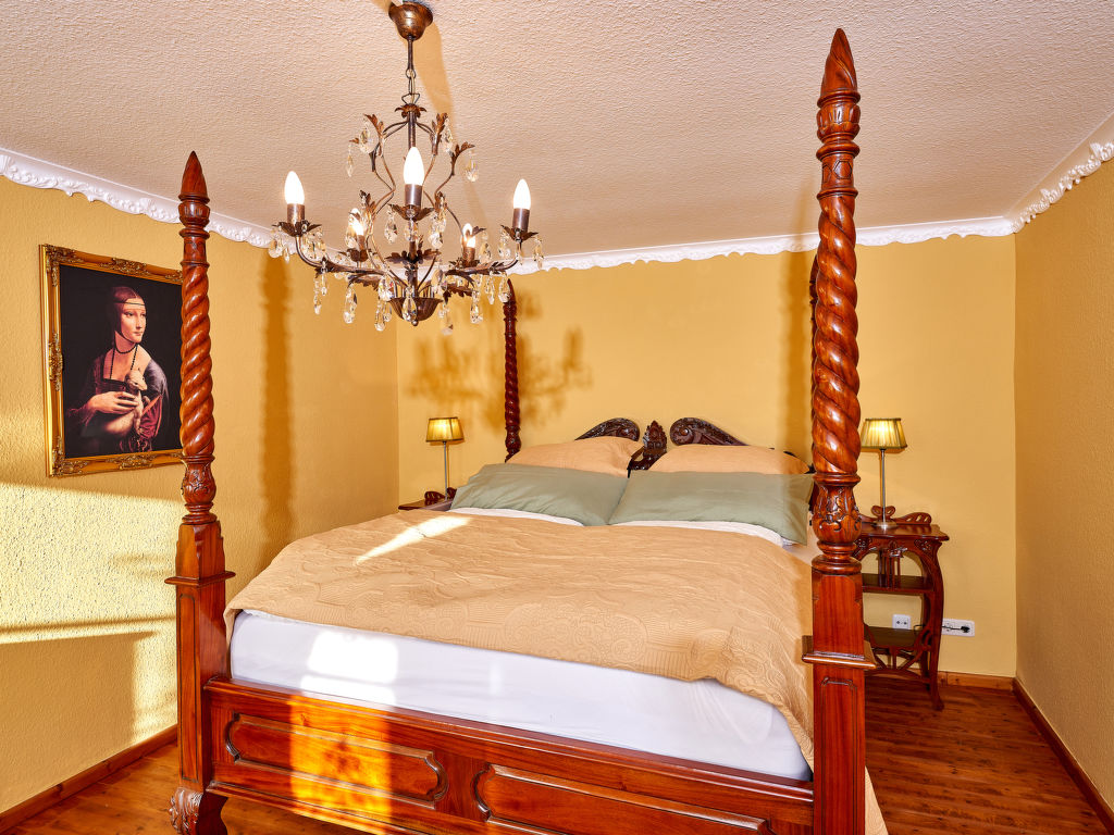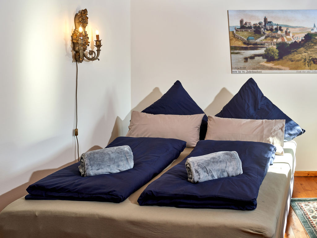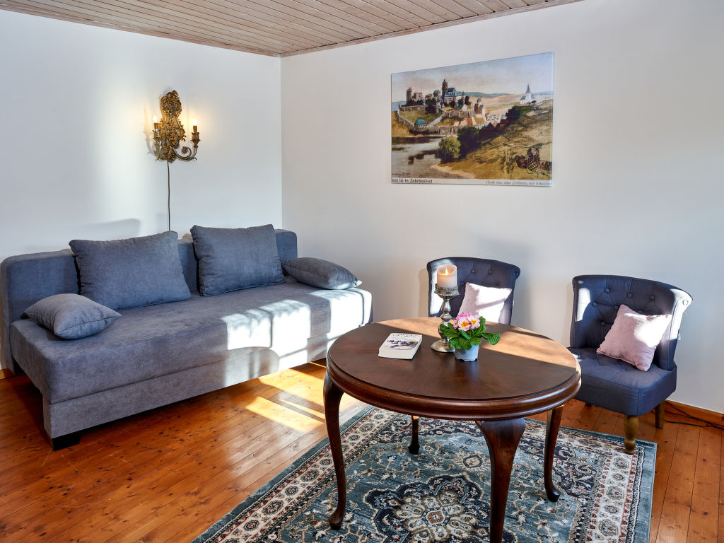 "Ritterstube", 3-Zimmer-Haus 100 m2 auf 2 Stockwerken. 1 Zimmer mit 1 franz. Bett (160 cm, Länge 200 cm). Küche (Backofen, Geschirrspüler, 4 Glaskeramikherd Platten, Toaster, Wasserkocher, Mikrowelle, elektrische Kaffeemaschine) mit Esstisch. Dusche/WC. Obergeschoss: Wohn-/Schlafzimmer mit 1 Doppeldiwanbett (160 cm, Länge 200 cm), Sat-TV und G-Heizung. 1 Zimmer mit 1 franz. Bett (160 cm, Länge 200 cm). Holzböden. Terrassenmöbel, Elektrogrill. Zur Verfügung: Internet (Wireless LAN, gratis). Bitte beachten: Nichtraucher-Haus. Rauchmelder, Feuerlöscher. Zwischen den Etagen sehr steile Treppe. Bluetooth Radio.