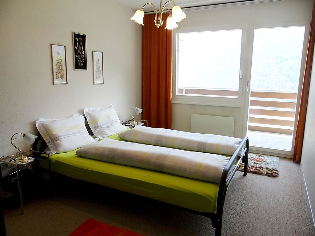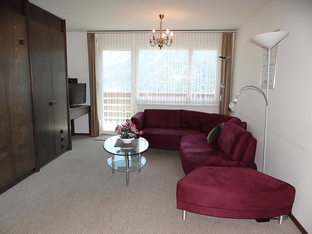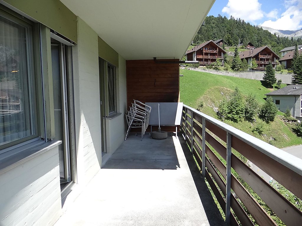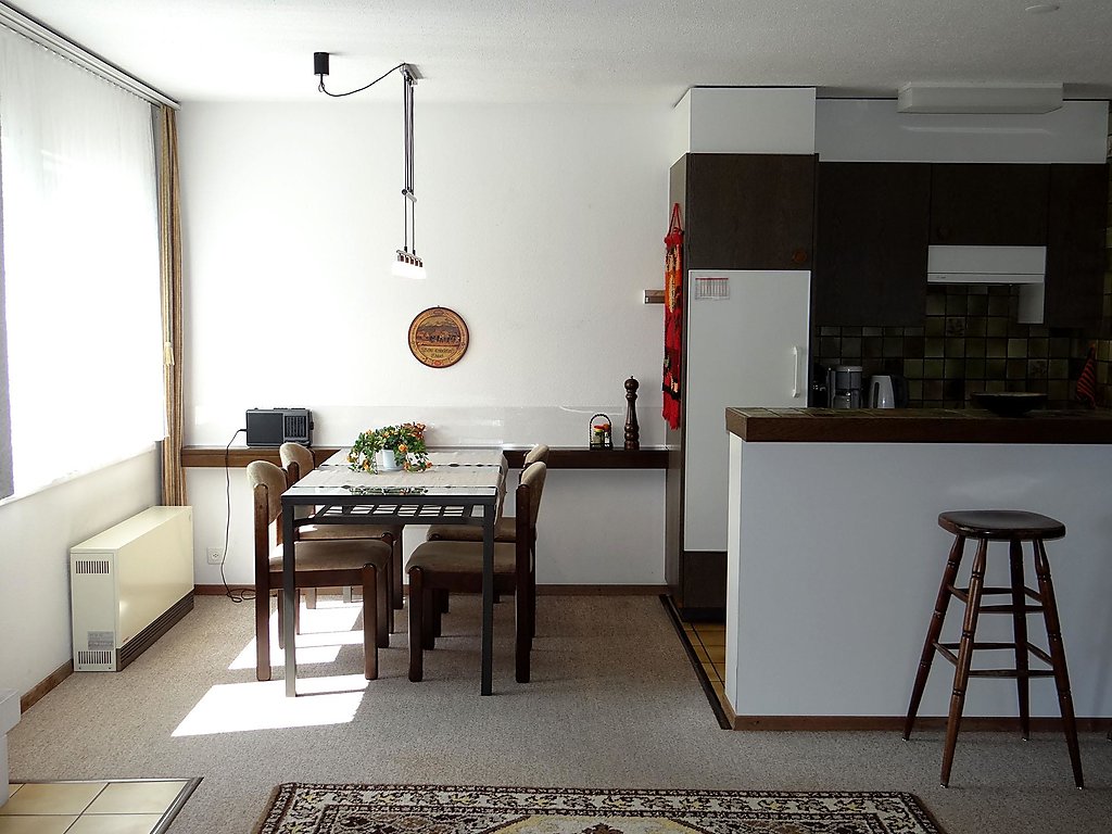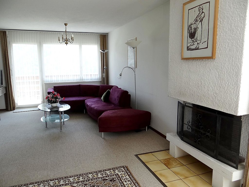 57 m2. Weitere Angaben des Anbieters: 2-Zimmer-Wohnung (57m2) im 2. Stock in einem ruhig gelegenen Mehrfamilienhaus an sonniger, erhöhter Lage. ca. 2 Kilometer vom Dorfzentrum, mit fantastischer Aussicht. Offene Küche mit Backofen, Geschirrspühler und Mikrowelle. Wohn- Esszimmer mit 2 Wandklappbetten, offener Kamin, Flachbildschirm und Radio, 1 Doppelzimmer, Bad/WC, Abstellkammer, Balkon, Terassenmöbel mit schöner Panoramasicht auf die Berge,die Landschaft und das Tal. Waschmaschine zur Mitbenützung im Hause. Autoabstellplatz und Einzelgarage inklusive. Gratis Skibus beim Haus. Keine Busverbindung im Sommer. Im Winter Schneeketten von Vorteil. Kurtaxe ist im Preis inbegriffen. (Max. 1) Hund erlaubt. Treppenweg 55 Stufen bis zur Wohnung. WLAN. NICHTRAUCHER-WOHNUNG. 2-Zimmerwohnung im 2. Stock: Offene Küche, Wohn-/ Esszimmer mit 2 Wandklappbetten, 1 Doppelzimmer, Bad/WC. Inklusiv: Toiletten- und Küchenwäsche, Tourismusabgabe. Exklusiv: Schlüsseldepot CHF 300.00 mit Kreditkarte, Haustier CHF 5.00 pro Nacht.