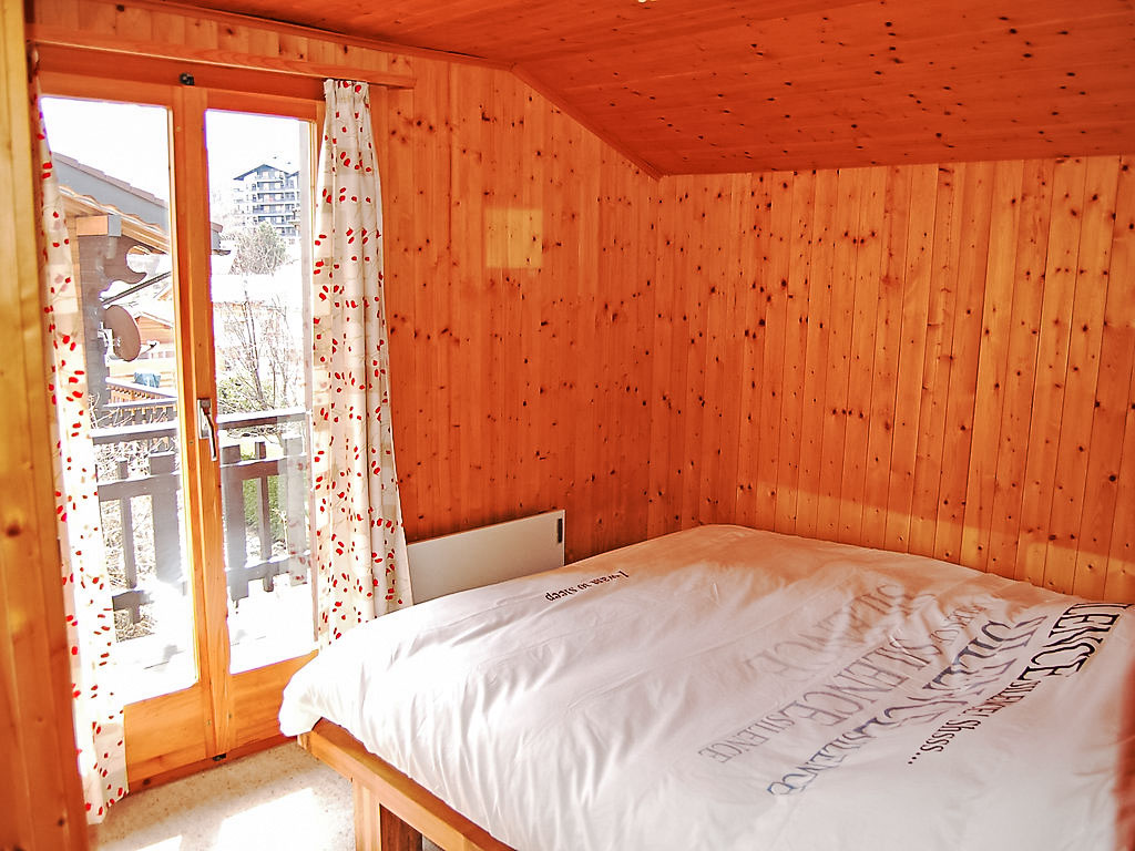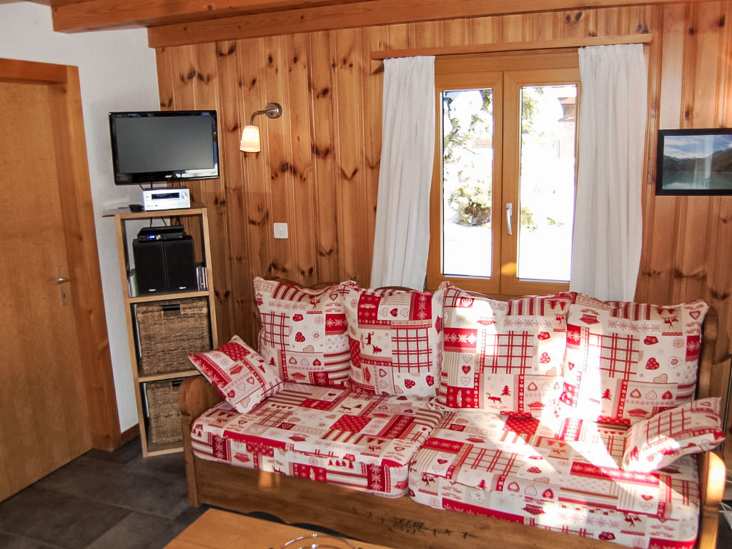 "Coucordin", 4-Zimmer-Chalet 73 m2 auf 2 Stockwerken. Schön eingerichtet: Wohn-/Esszimmer mit Sat-TV, Kabel-TV und Stereoanlage. Ausgang zur Terrasse. Kleine, offene Küche (Backofen, Geschirrspüler, 4 Induktionskochplatten, Racletteofen, Fondue Set (Chinoise)). Sep. WC. Obergeschoss: 1 Zimmer mit 1 franz. Bett (160 cm, Länge 200 cm). 2 kleine Zimmer, jedes Zimmer mit 1 x 2 Etagenbetten (90 cm, Länge 200 cm). Dusche/WC, Doppelwaschbecken. Kleiner Balkon, Ostlage, Terrasse 20 m2, Südostlage. Terrassenmöbel, Gartengrill. Zur Verfügung: Waschmaschine, Wäschetrockner, Haartrockner. Internet (Wireless LAN, gratis). Parkplatz (2 Autos). Bitte beachten: Nichtraucher-Haus.