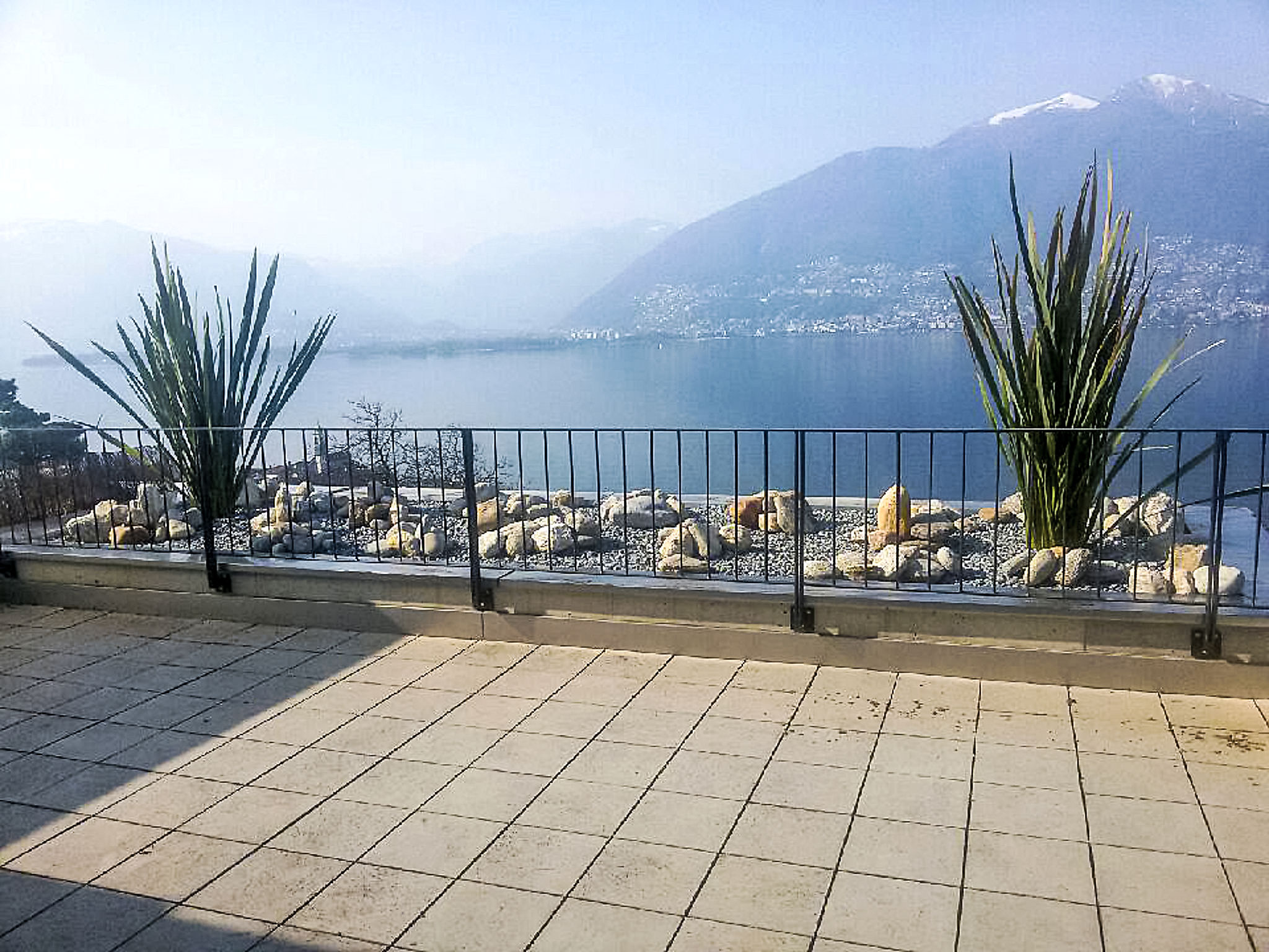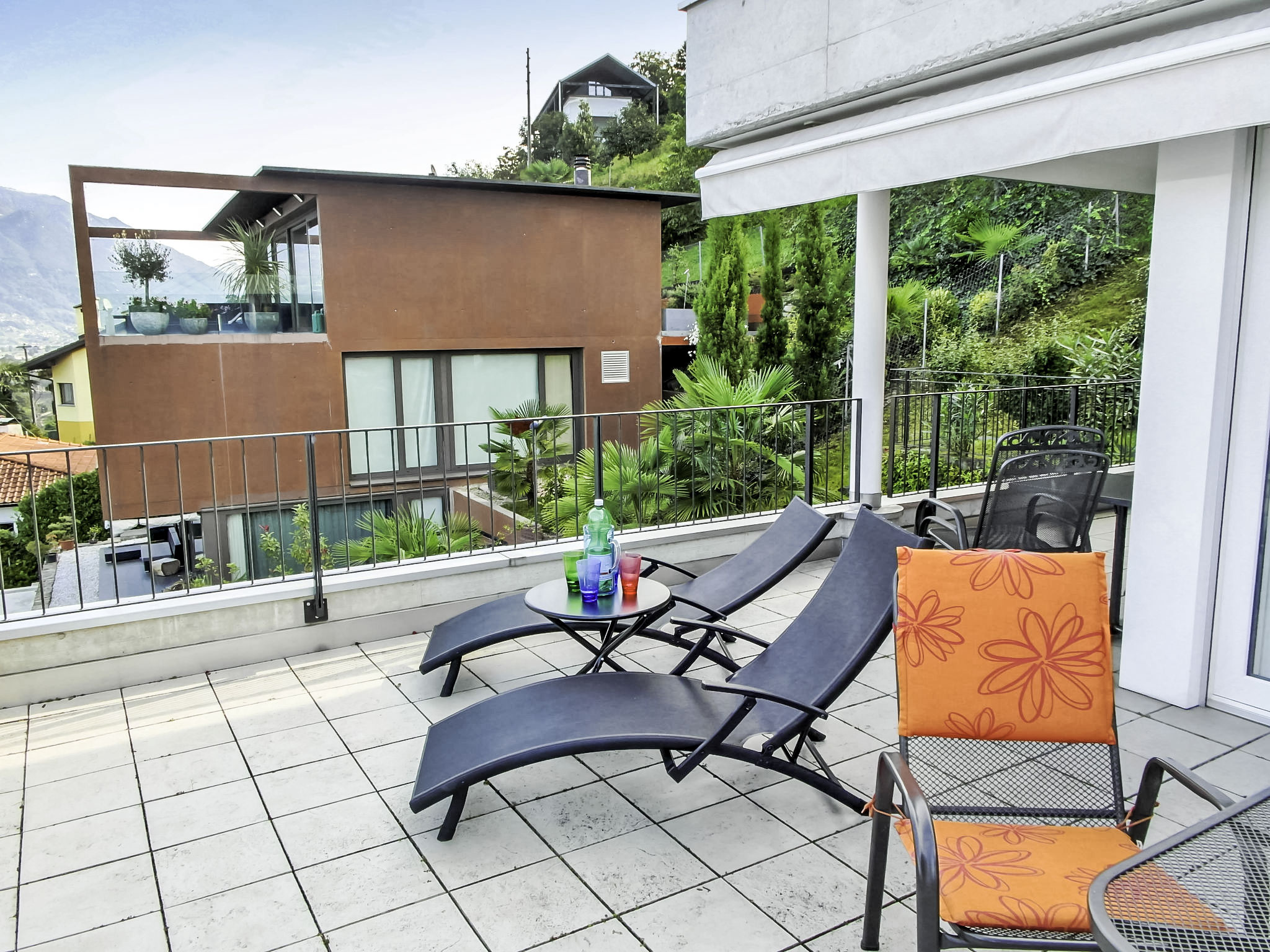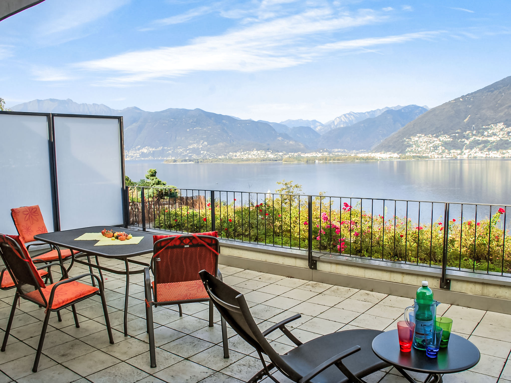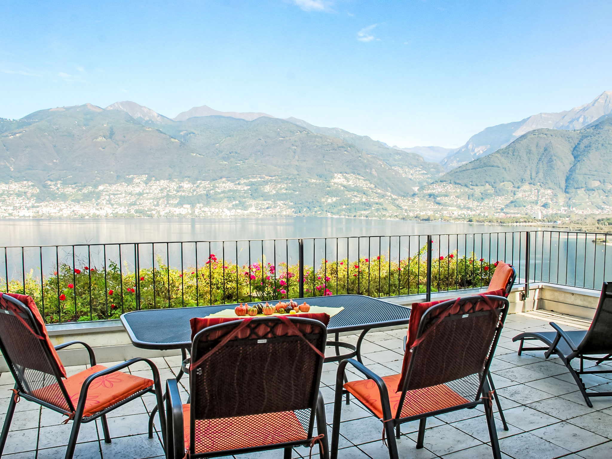 3-Zimmer-Wohnung 100 m2 im 3. Stock. Komfortabel und modern eingerichtet: offenes grosses Wohn-/Esszimmer mit Sat-TV, Flachbildschirm, Stereoanlage und DVD. Ausgang zur Terrasse. 1 Doppelzimmer mit 1 franz. Bett (160 cm), Sat-TV und Flachbildschirm. Ausgang zur Terrasse. 1 Zimmer mit 2 Betten (90 cm, Länge 200 cm), Sat-TV und Flachbildschirm. Ausgang zur Terrasse. Offene Küche (Backofen, Geschirrspüler, 4 Glaskeramikherd Platten, Toaster, Wasserkocher, Mikrowelle, Tiefkühler, elektrische Kaffeemaschine, Kapseln für die Kaffeemaschine (Nespresso) extra) mit Esstisch. Bad/WC, Dusche/WC. Klimaanlage. Terrasse 40 m2, Gartensitzplatz 20 m2. Terrassenmöbel, Liegestühle (2). Herrliche Panoramasicht auf den See, die Berge und die Landschaft. Zur Verfügung: Waschmaschine, Wäschetrockner, Bügeleisen, Haartrockner. Internet (Wireless LAN, gratis). Blu-Ray Player. Garage Nr. 6, Höhe 200 cm, Breite 400 cm. Bitte beachten: Nichtraucher-Unterkunft. Boiler. Handtücher fürs Schwimmbad sind kostenlos.