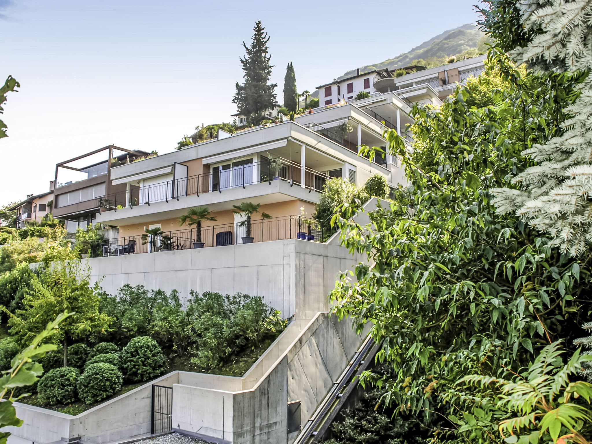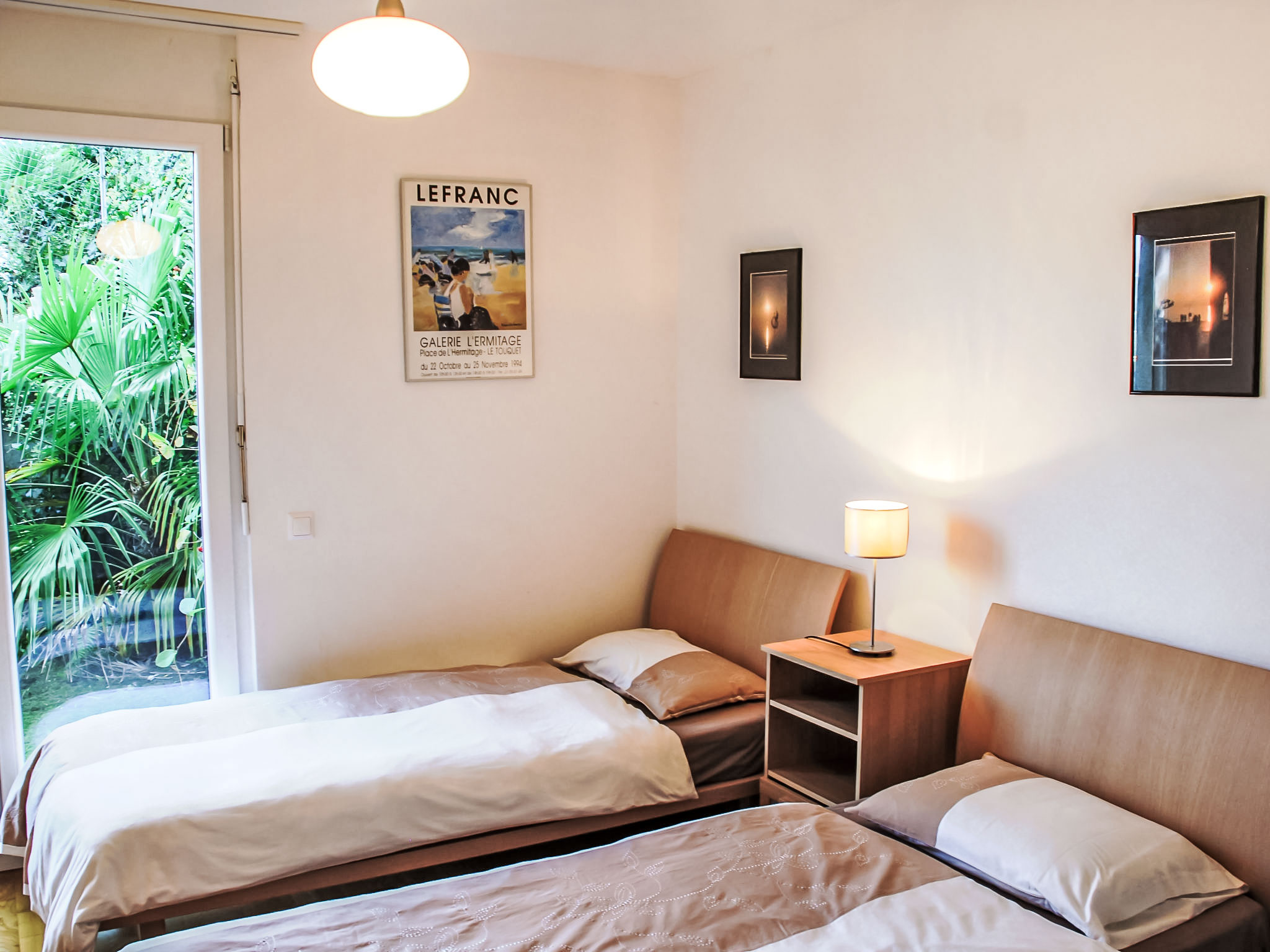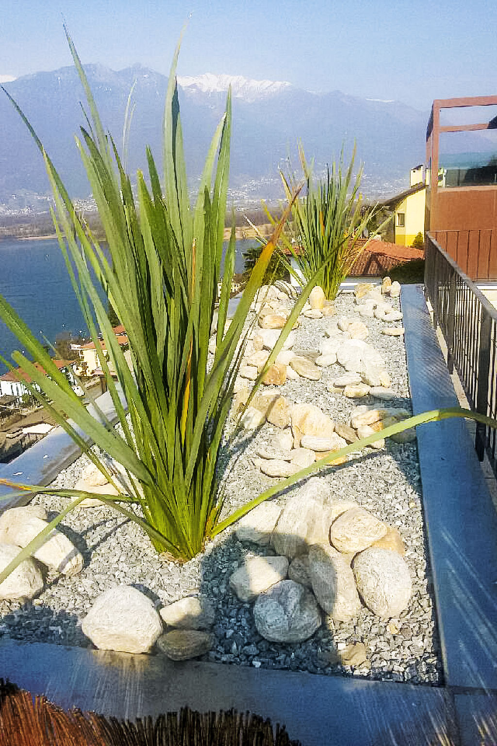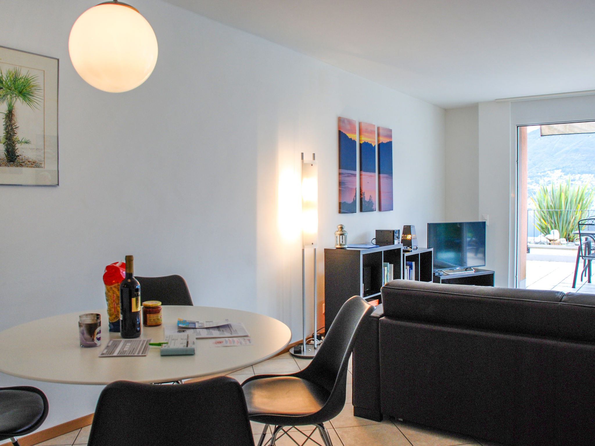 3-Zimmer-Wohnung 100 m2 im 3. Stock. Komfortabel und modern eingerichtet: offenes grosses Wohn-/Esszimmer mit Sat-TV, Flachbildschirm, Stereoanlage und DVD. Ausgang zur Terrasse. 1 Doppelzimmer mit 1 franz. Bett (160 cm), Sat-TV und Flachbildschirm. Ausgang zur Terrasse. 1 Zimmer mit 2 Betten (90 cm, Länge 200 cm), Sat-TV und Flachbildschirm. Ausgang zur Terrasse. Offene Küche (Backofen, Geschirrspüler, 4 Glaskeramikherd Platten, Toaster, Wasserkocher, Mikrowelle, Tiefkühler, elektrische Kaffeemaschine, Kapseln für die Kaffeemaschine (Nespresso) extra) mit Esstisch. Bad/WC, Dusche/WC. Klimaanlage. Terrasse 40 m2, Gartensitzplatz 20 m2. Terrassenmöbel, Liegestühle (2). Herrliche Panoramasicht auf den See, die Berge und die Landschaft. Zur Verfügung: Waschmaschine, Wäschetrockner, Bügeleisen, Haartrockner. Internet (Wireless LAN, gratis). Blu-Ray Player. Garage Nr. 6, Höhe 200 cm, Breite 400 cm. Bitte beachten: Nichtraucher-Unterkunft. Boiler. Handtücher fürs Schwimmbad sind kostenlos.