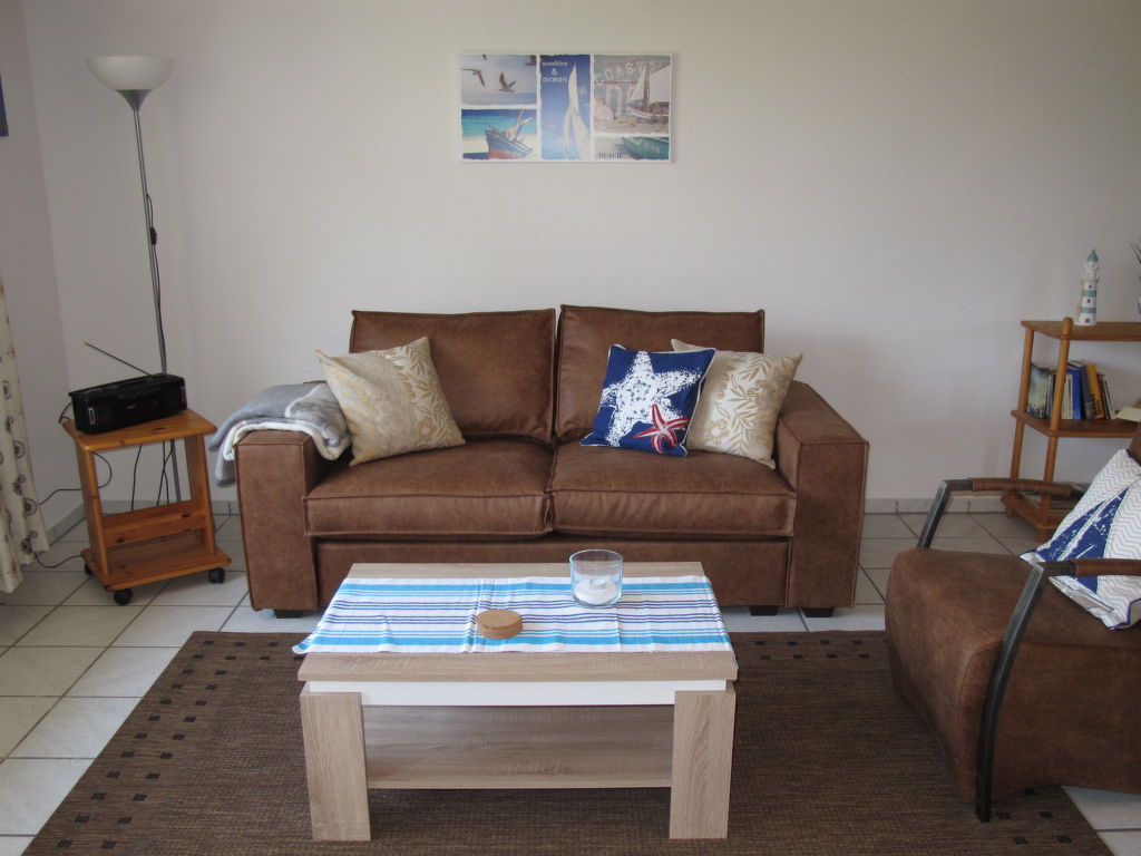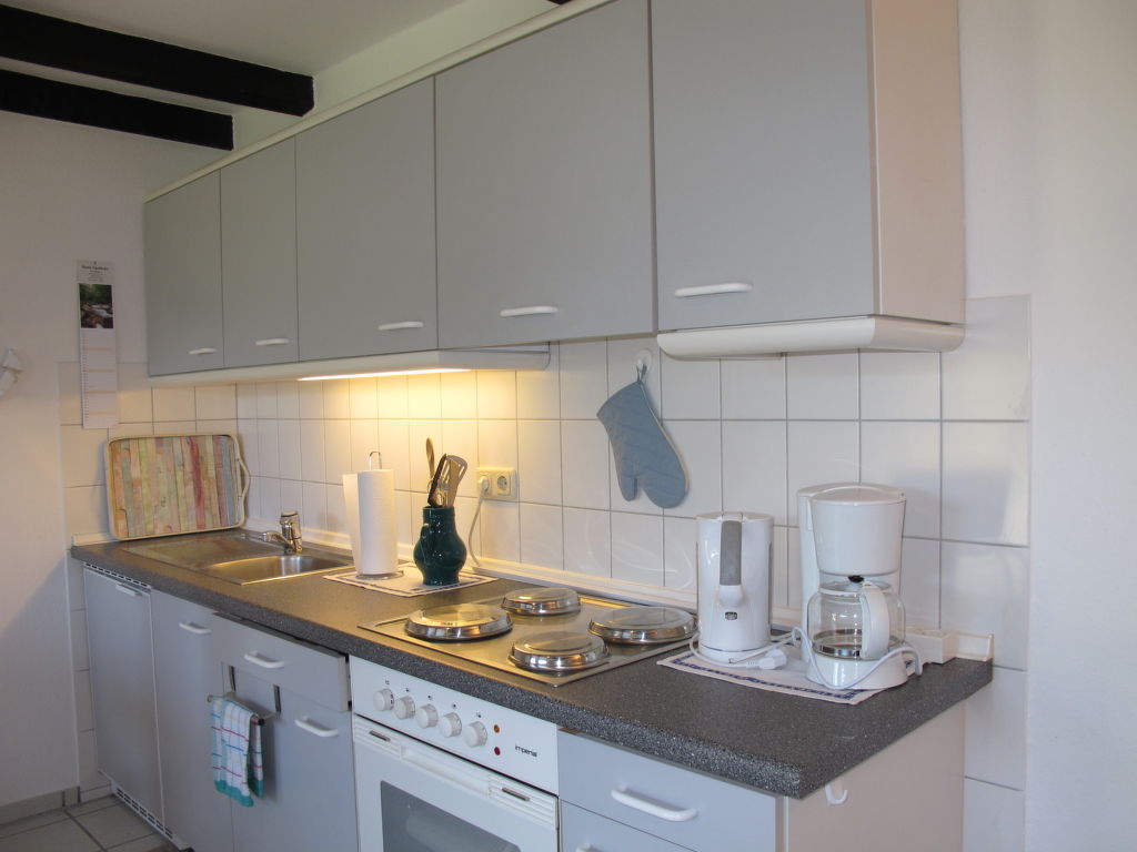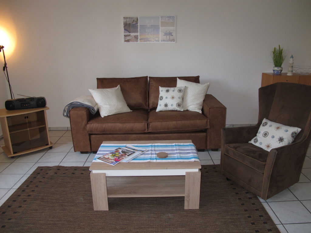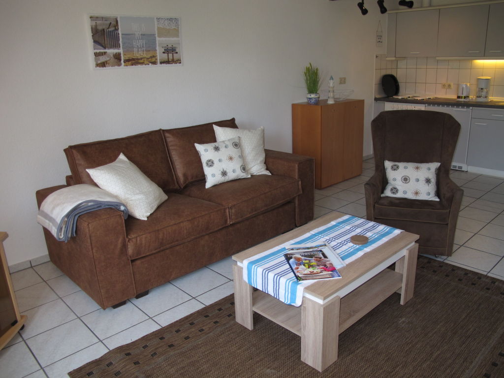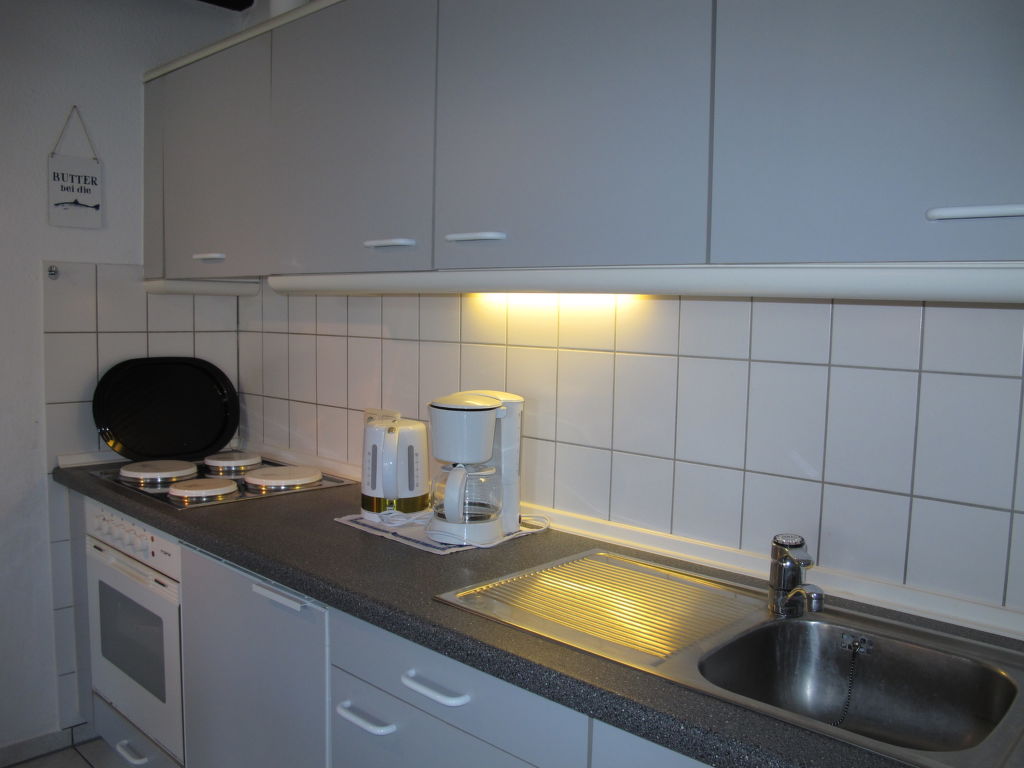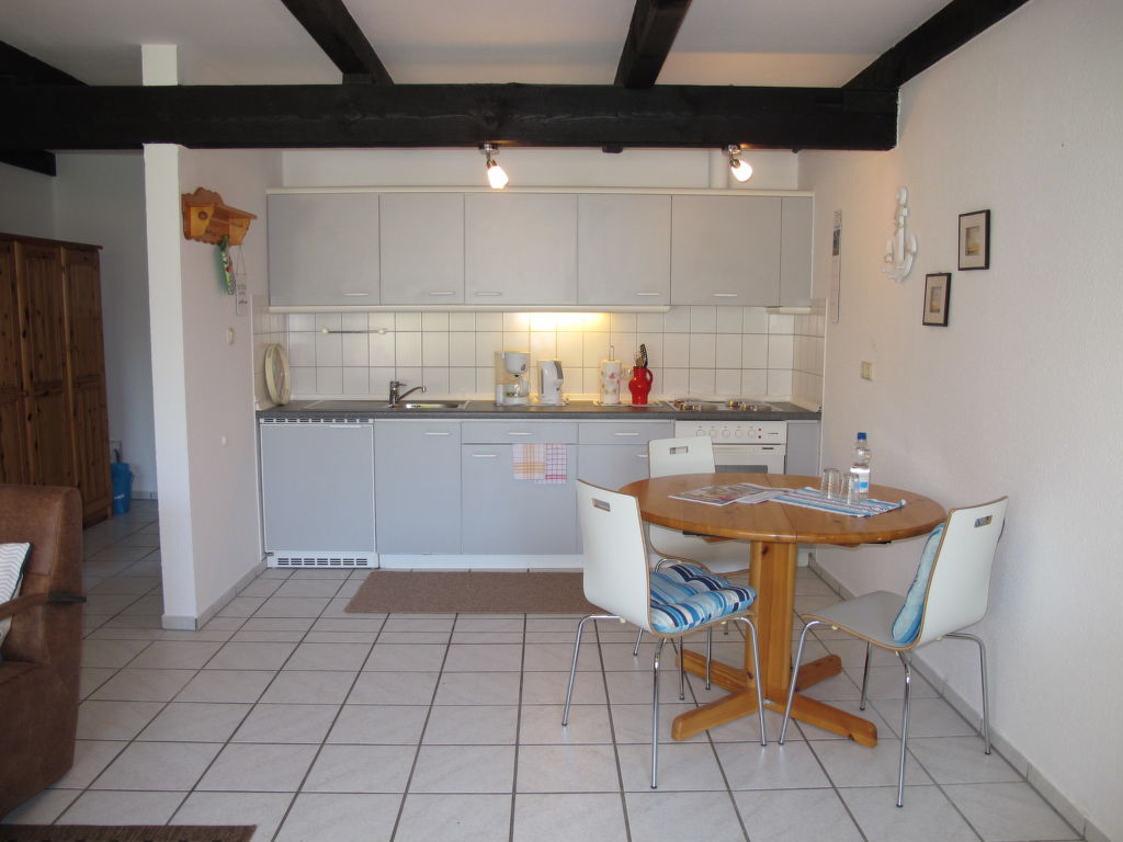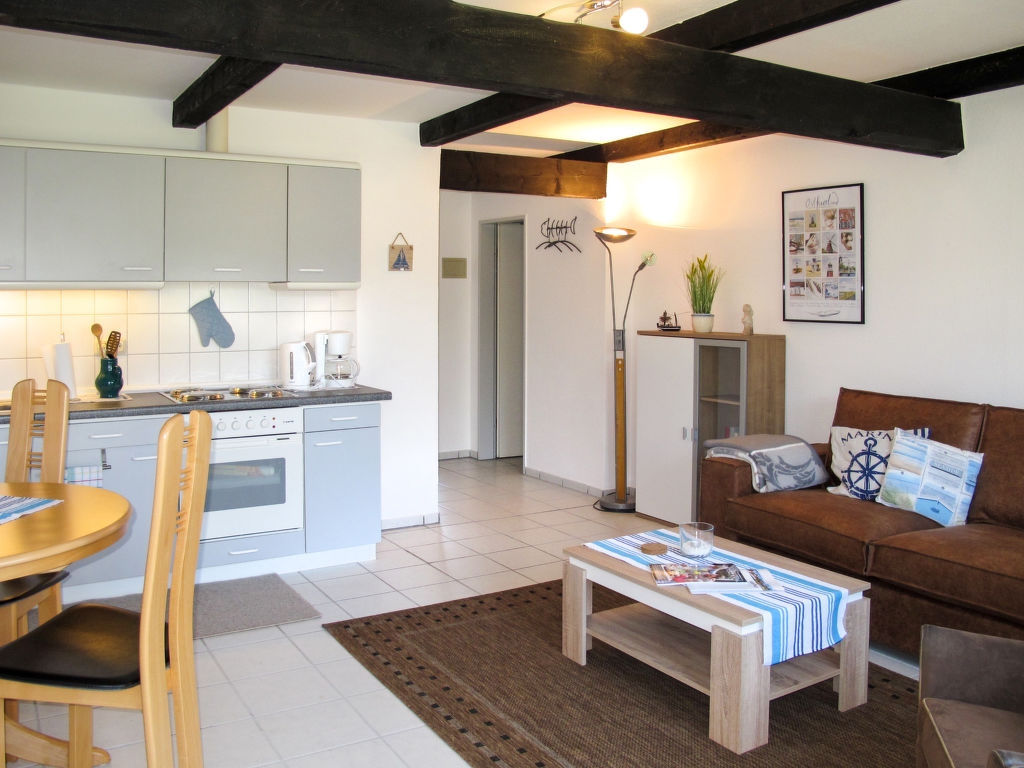 2-Zimmer-Reihenhaus 47 m2. Gemütlich eingerichtet: Wohn-/Esszimmer mit Sat-TV. Ausgang zur Terrasse. 1 Zimmer mit 1 Doppelbett. Offene Küche (4 Kochplatten, Backofen, Toaster, Wasserkocher, elektrische Kaffeemaschine). Dusche/WC. Terrassenmöbel. Bitte beachten: Nichtraucher-Haus. 1 Haustier/Hund erlaubt.