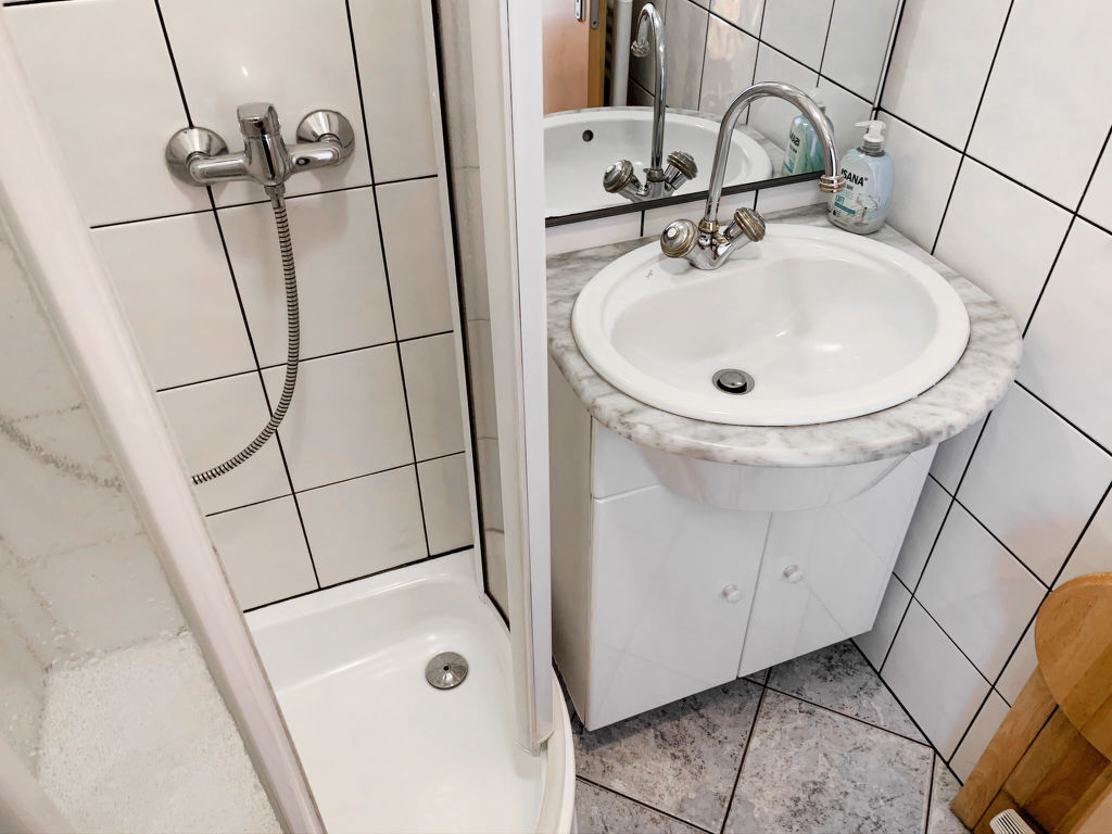2-Zimmer-Wohnung 35 m2, im Erdgeschoss. Schön und gemütlich eingerichtet: Wohn-/Esszimmer 11 m2 mit Digital-TV, Flachbildschirm und Stereoanlage. Ausgang zur Terrasse. 1 Zimmer 11 m2 mit 1 Doppelbett (2 x 70 cm, Länge 200 cm). Kochnische (2 Kochplatten, Toaster, Wasserkocher, Mikrowelle, elektrische Kaffeemaschine). Dusche/WC. Terrasse. Terrassenmöbel. Zur Verfügung: Telefon (extra), Kinderhochstuhl (extra), Haartrockner. Bitte beachten: Kühlschrank ohne Gefrierfach, Nichtraucher-Unterkunft.