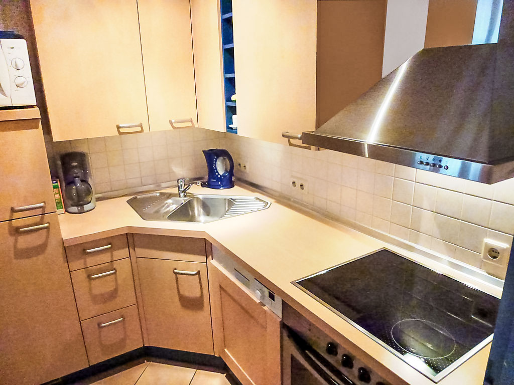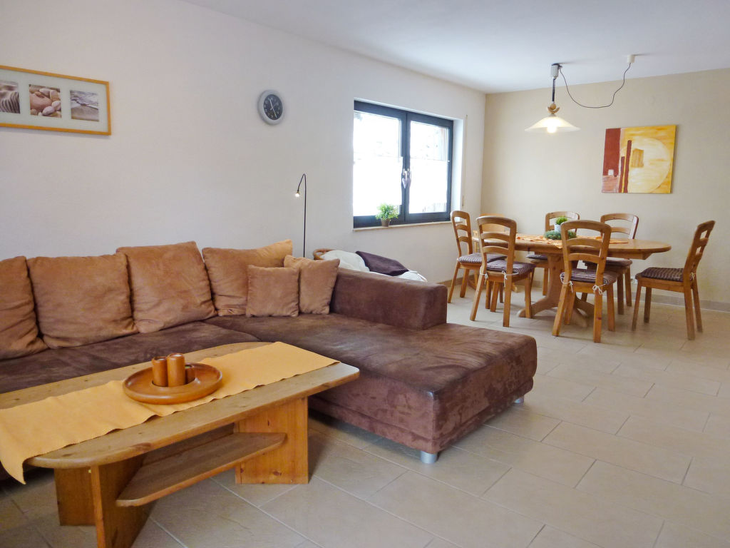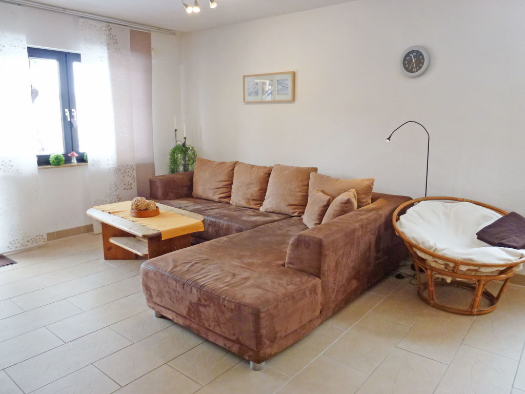 3-Zimmer-Wohnung 77 m2, im erhöhten Erdgeschoss. Gemütlich eingerichtet: Wohn-/Esszimmer mit Sat-TV (Flachbildschirm), Radio, CD und DVD. Ausgang zum Balkon. 1 Zimmer mit 1 Doppelbett und 1 Klappbett. Ausgang zum Balkon. 1 Doppelzimmer. Küche (Backofen, Geschirrspüler, 4 Glaskeramikherd Platten, Mikrowelle, elektrische Kaffeemaschine). Bad/Dusche/WC. Fussbodenheizung. Balkon 50 m2. Balkonmöbel. Zur Verfügung: Kinderhochstuhl. Bitte beachten: Nichtraucher-Unterkunft. Warmwasser über E-Boiler. Balkon teilweise überdacht.