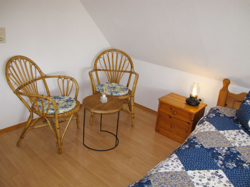 4-Zimmer-Doppelhaushälfte 72 m2 auf 2 Stockwerken. Geschmackvoll und gemütlich eingerichtet: Wohnzimmer mit Sat-TV, Radio und CD. Ausgang zur Terrasse. 1 Zimmer mit 1 franz. Bett (140 cm, Länge 200 cm). Kleine, offene Küche (Backofen, Geschirrspüler, 4 Glaskeramikherd Platten, Toaster, Wasserkocher, Mikrowelle, elektrische Kaffeemaschine) mit Esstisch. Dusche/WC. Obergeschoss: 1 abgeschrägtes Zimmer mit 1 Doppelbett. 1 abgeschrägtes Zimmer mit 1 Bett. Sep. WC. Terrassenmöbel, Gartengrill, Abstellkammer. Zur Verfügung: Safe, Kinderhochstuhl, Babybett. Bitte beachten: Nichtraucher-Unterkunft. 1 Haustier/Hund erlaubt. Strandkorb.