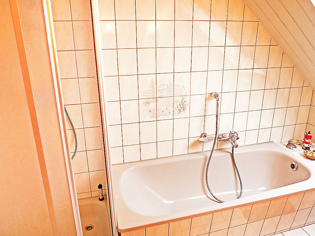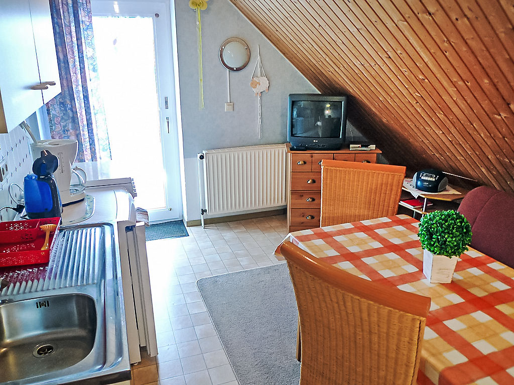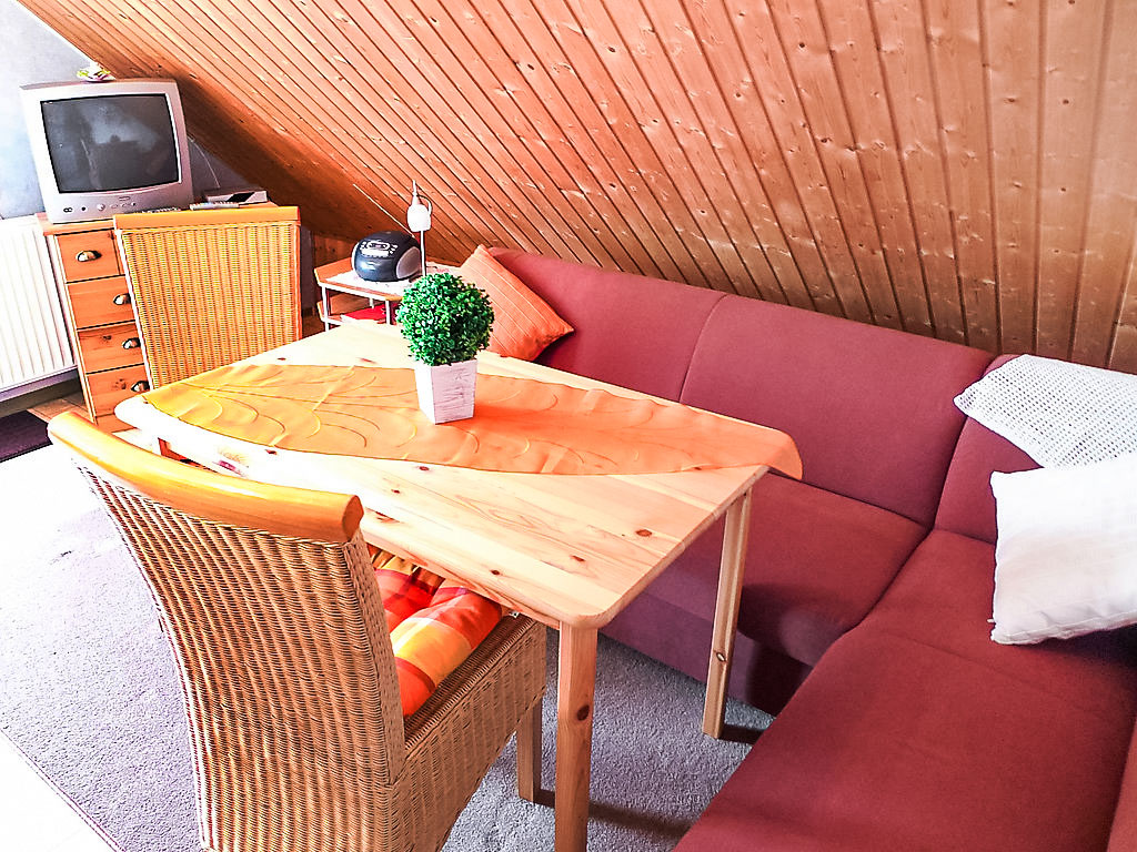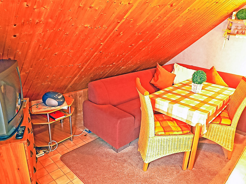 3-Zimmer-Wohnung 50 m2, im Dachgeschoss. Abgeschrägt: kleines Wohn-/Esszimmer mit Sat-TV, Radio und CD. 1 Zimmer mit 2 Betten (90 cm, Länge 200 cm). 1 Zimmer mit 1 Doppelbett (2 x 90 cm, Länge 200 cm). Kochnische (Backofen, elektrische Kaffeemaschine). Bad/Dusche/WC. Zur Verfügung: Haartrockner. Bitte beachten: Nichtraucher-Unterkunft. Eigener Eingang. Dachterrasse.