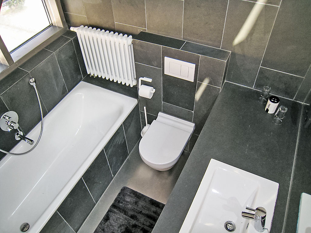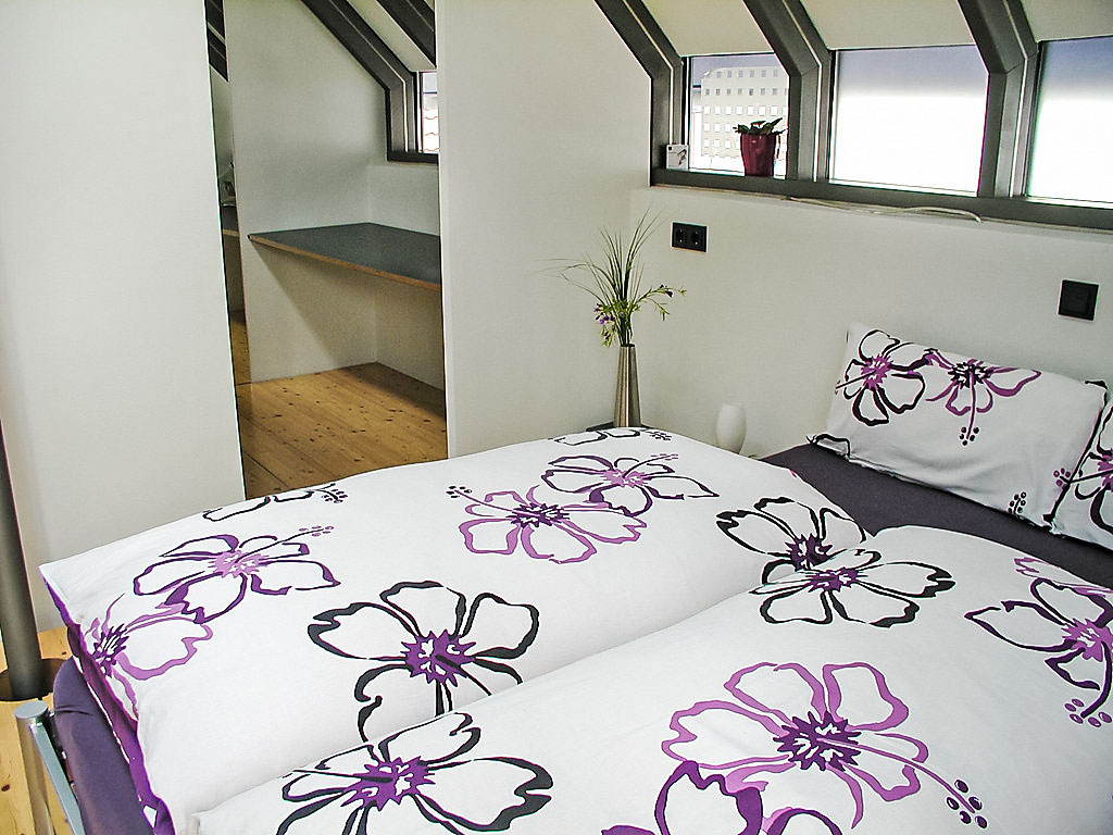 1-Zimmer-Haus 68 m2 auf 2 Stockwerken, im Erdgeschoss. Komfortabel und modern eingerichtet: Wohnküche (Backofen, Geschirrspüler, 4 Glaskeramikherd Platten, elektrische Kaffeemaschine) mit Essecke. Sep. WC. Dachgeschoss: 1 abgeschrägtes, offenes Zimmer mit 1 franz. Bett (140 cm, Länge 200 cm), Kabel-TV (Flachbildschirm). Bad/WC. Terrasse 13 m2. Terrassenmöbel, Gartengrill, Liegestühle, Abstellkammer. Zur Verfügung: Internet (Wireless LAN, gratis). Bitte beachten: Nichtraucher-Haus. Begehbarer Kleiderschrank im Dachgeschoss. Zugang zum Dachgeschoss über schmale Treppe.
