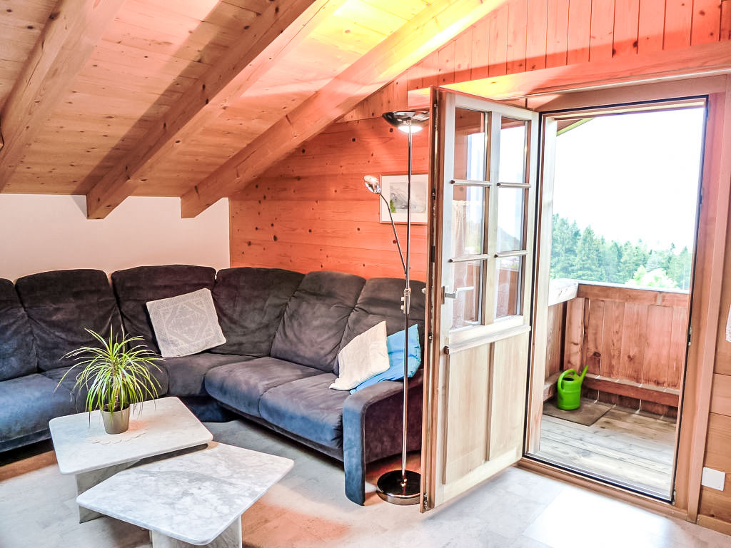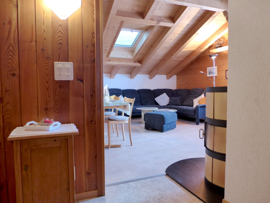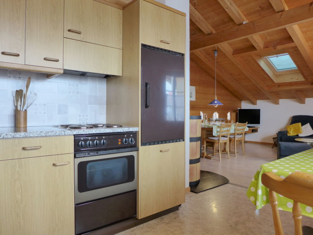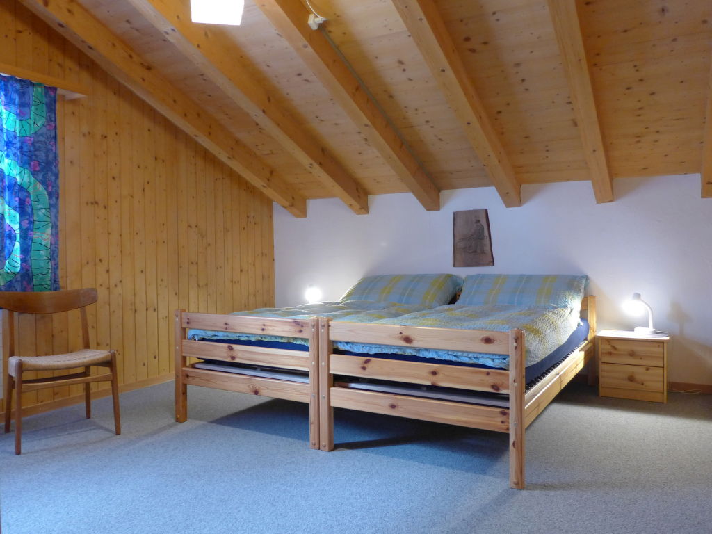 3-Zimmer-Wohnung 70 m2, im Dachgeschoss. Teilweise abgeschrägt, rustikal und gemütlich eingerichtet: grosses Wohn-/Esszimmer mit Dachfenster mit Schwedenofen, Essecke, Sat-TV und Radio. Ausgang zum Balkon. 1 Zimmer 16 m2 mit 1 Doppelbett (2 x 90 cm, Länge 200 cm). 1 Doppelzimmer 13 m2 mit 1 Doppelbett (2 x 90 cm, Länge 200 cm). Offene Küche (4 Kochplatten, Backofen, Geschirrspüler, Mikrowelle, elektrische Kaffeemaschine, Racletteofen, Fondue Set (Käse)) mit Esstisch. Bad/WC. Boiler (200 Liter). Balkon 10 m2, Südlage. Balkonmöbel. Herrliche Panoramasicht auf den See, die Berge und das Tal. Zur Verfügung: Haartrockner, Holz (gratis). Internet (Wireless LAN, gratis). Parkplatz beim Haus. Bitte beachten: Nichtraucher-Unterkunft.