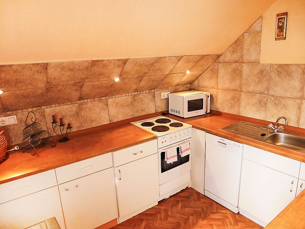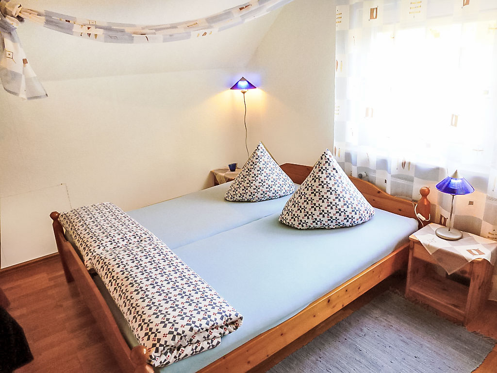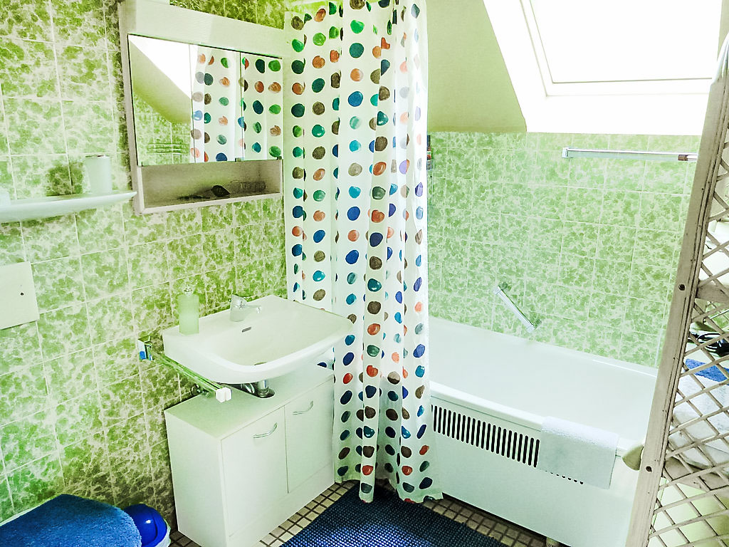 2-Zimmer-Wohnung 50 m2, im Dachgeschoss. Teilweise abgeschrägt: Wohn-/Esszimmer mit 1 Doppeldiwanbett. Wohn-/Schlafzimmer mit 1 Doppelbett und Sat-TV. Offene Küche (4 Kochplatten, Backofen, Geschirrspüler, Mikrowelle, elektrische Kaffeemaschine). Bad/WC. Zur Verfügung: Internet (Wireless LAN, gratis). Bitte beachten: Nichtraucher-Unterkunft. Maximal 2 Haustiere/Hunde erlaubt.
