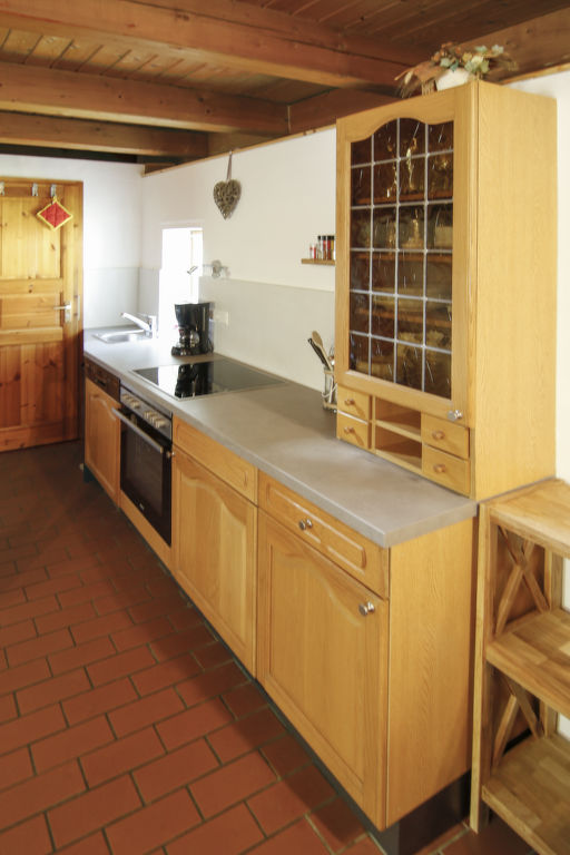 "Backhäusle", 2-Zimmer-Haus 45 m2 auf 2 Stockwerken. Einfach und rustikal eingerichtet: Wohnküche (Backofen, Geschirrspüler, 4 Glaskeramikherd Platten, Toaster, Wasserkocher, elektrische Kaffeemaschine) mit Esstisch und Sat-TV. Ausgang zur Terrasse. Dusche/WC. Ölheizung. Dachgeschoss: (steile Treppe) 1 abgeschrägtes, offenes Zimmer mit 2 Betten und 1 Doppelbett. E-Heizung. Parkettböden. Terrasse. Terrassenmöbel, Gartengrill, Liegestühle. Zur Verfügung: Babybett. Bitte beachten: Nichtraucher-Haus. 1 Haustier/Hund erlaubt. Rauchmelder. Hinweis: Von der Wohnküche steile Holztreppe/Leiter durch offene Bodenluke ins Dachgeschoss.