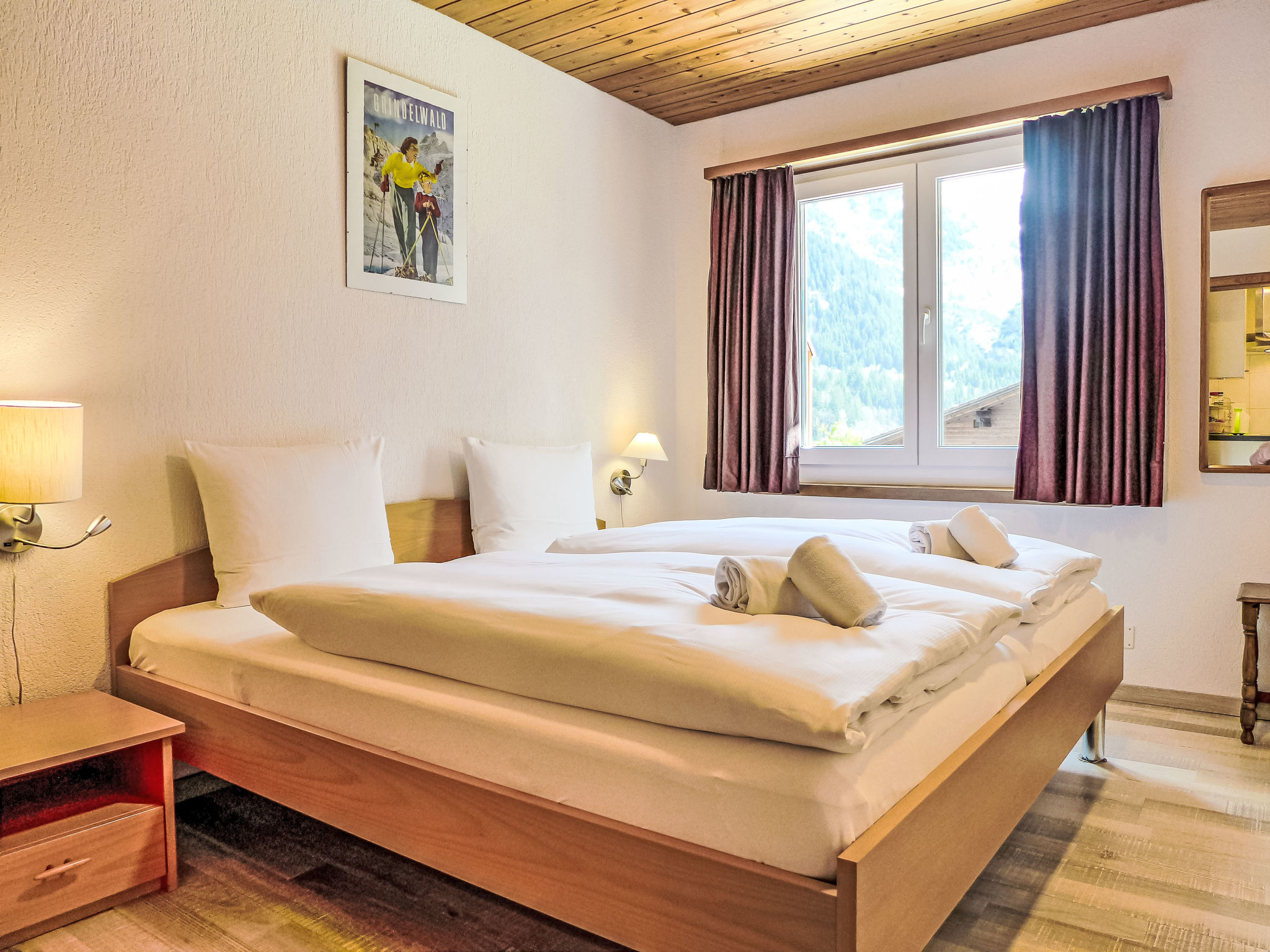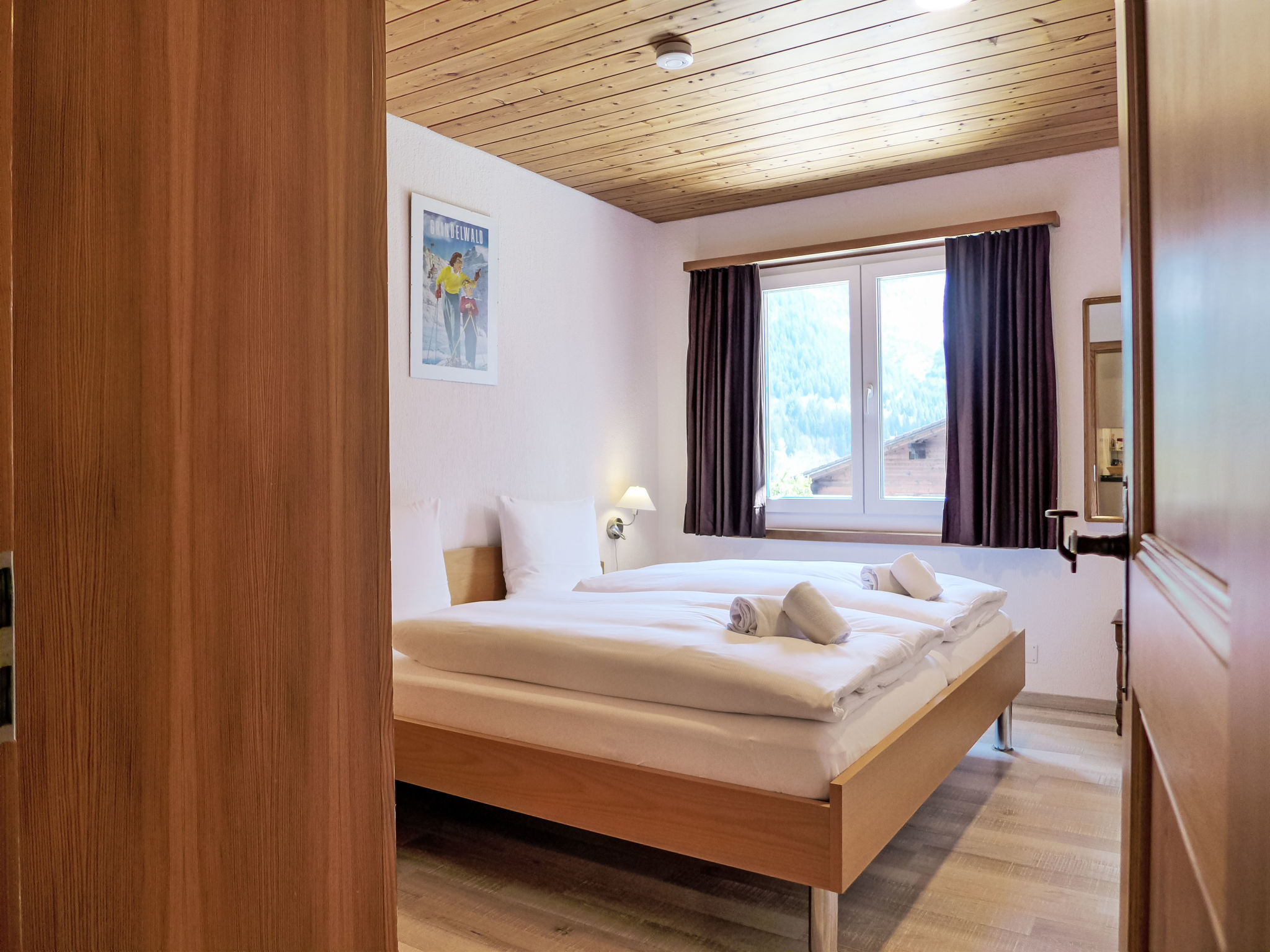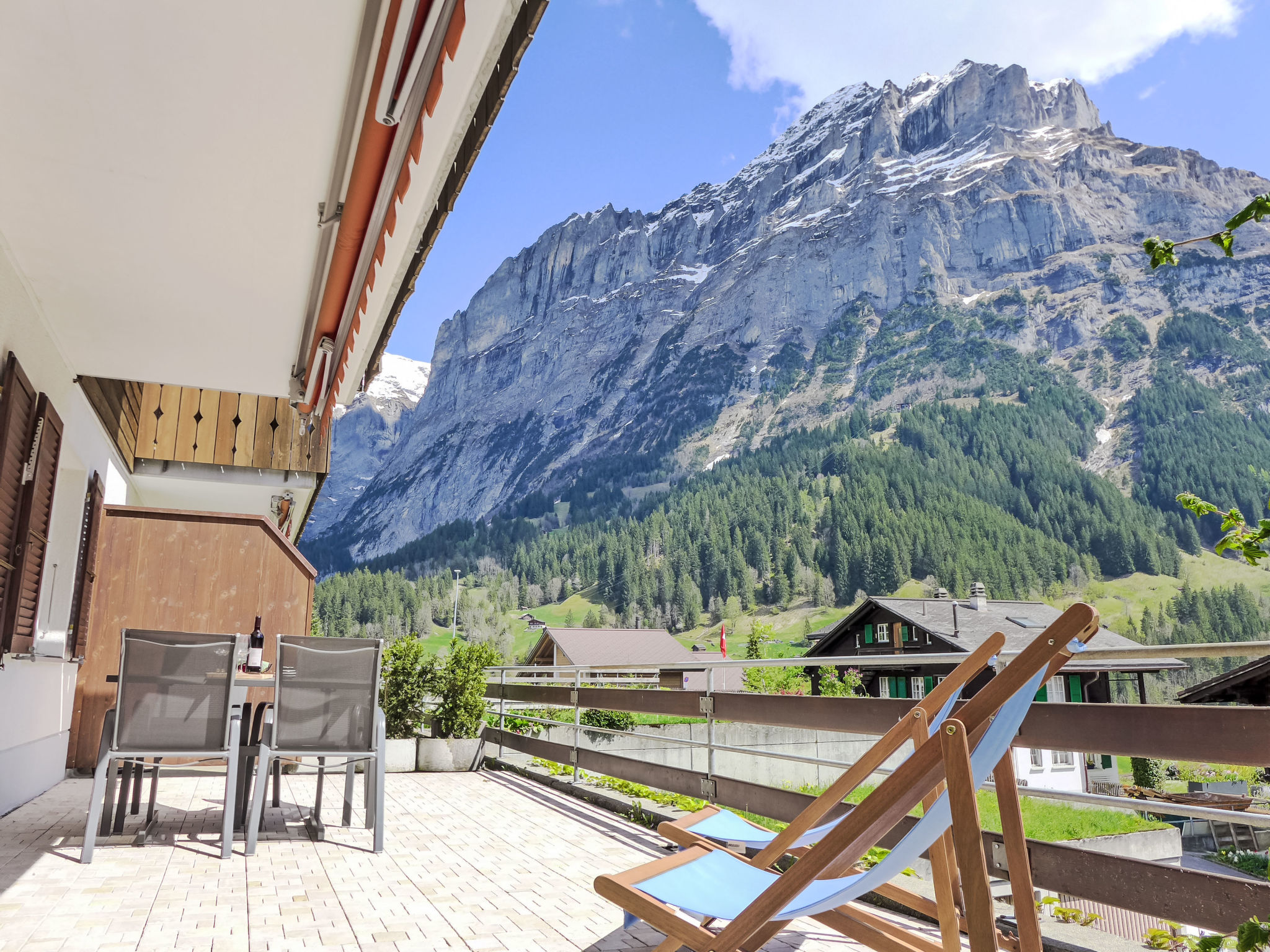 2-Zimmer-Wohnung 45 m2, im erhöhten Erdgeschoss, Südlage. Gemütlich eingerichtet: Wohn-/Schlafzimmer mit 1 Doppeldiwanbett (160 cm, Länge 200 cm), Sat-TV und Digital-TV (Flachbildschirm), Radio. Ausgang zur Terrasse. 1 Zimmer mit 1 Doppelbett (2 x 90 cm, Länge 200 cm). Offene Küche (Backofen, Geschirrspüler, 4 Glaskeramikherd Platten, Toaster, Wasserkocher, elektrische Kaffeemaschine, Kapseln für die Kaffeemaschine (Nespresso) extra, Racletteofen, Fondue Set (Käse)). Dusche/WC. Fussbodenheizung. Terrasse, Südlage und Westlage. Terrassenmöbel. Herrliche Sicht auf die Berge und Eigernordwand. Zur Verfügung: Haartrockner. Internet (Wireless LAN, gratis). Garage Nr. 2, Höhe 247 cm, Breite 212 cm. Bitte beachten: Nichtraucher-Unterkunft. Eigener Eingang, Feuerlöscher.