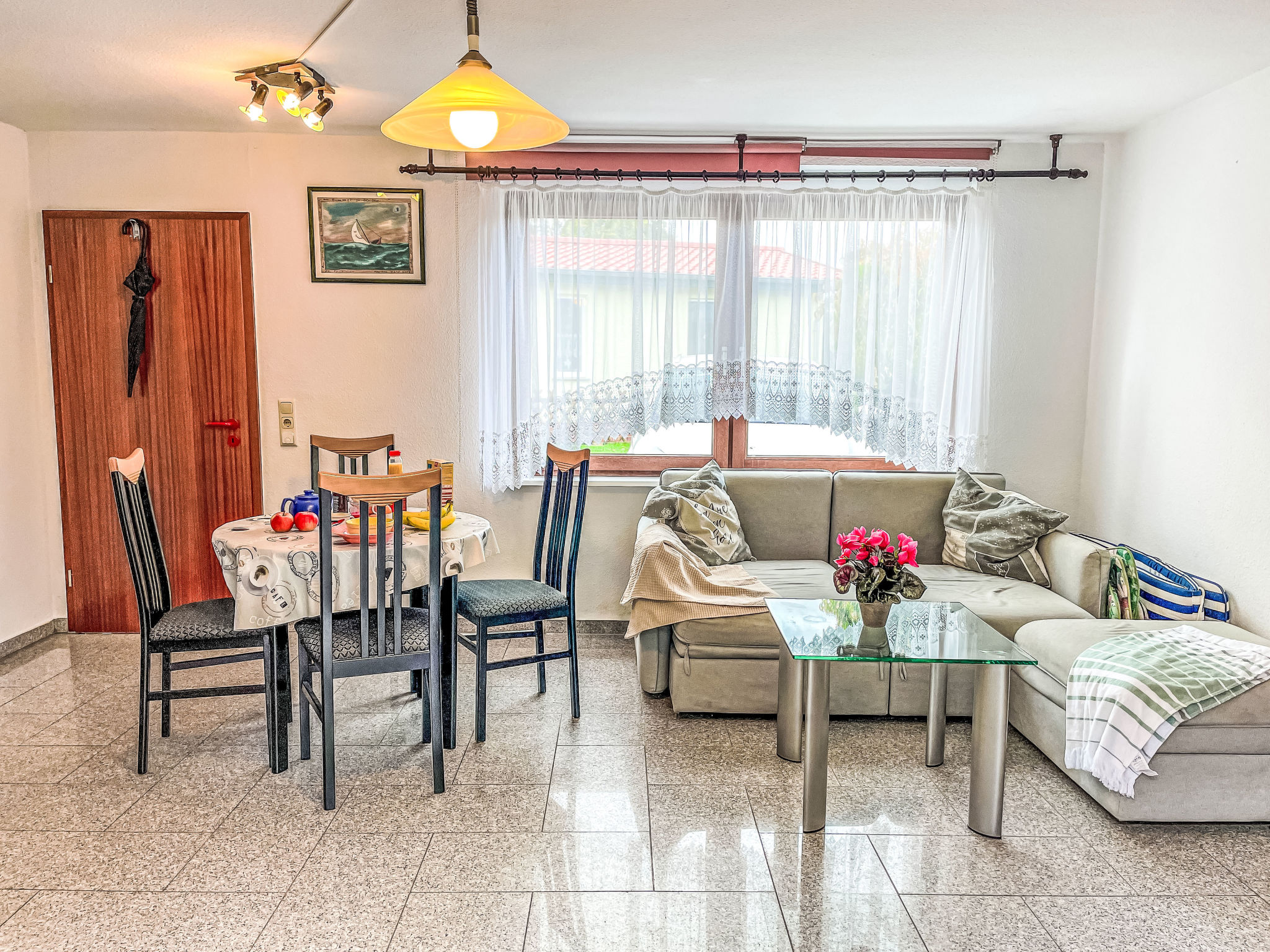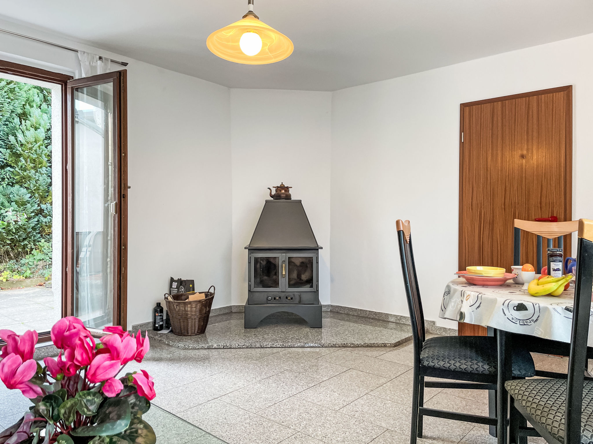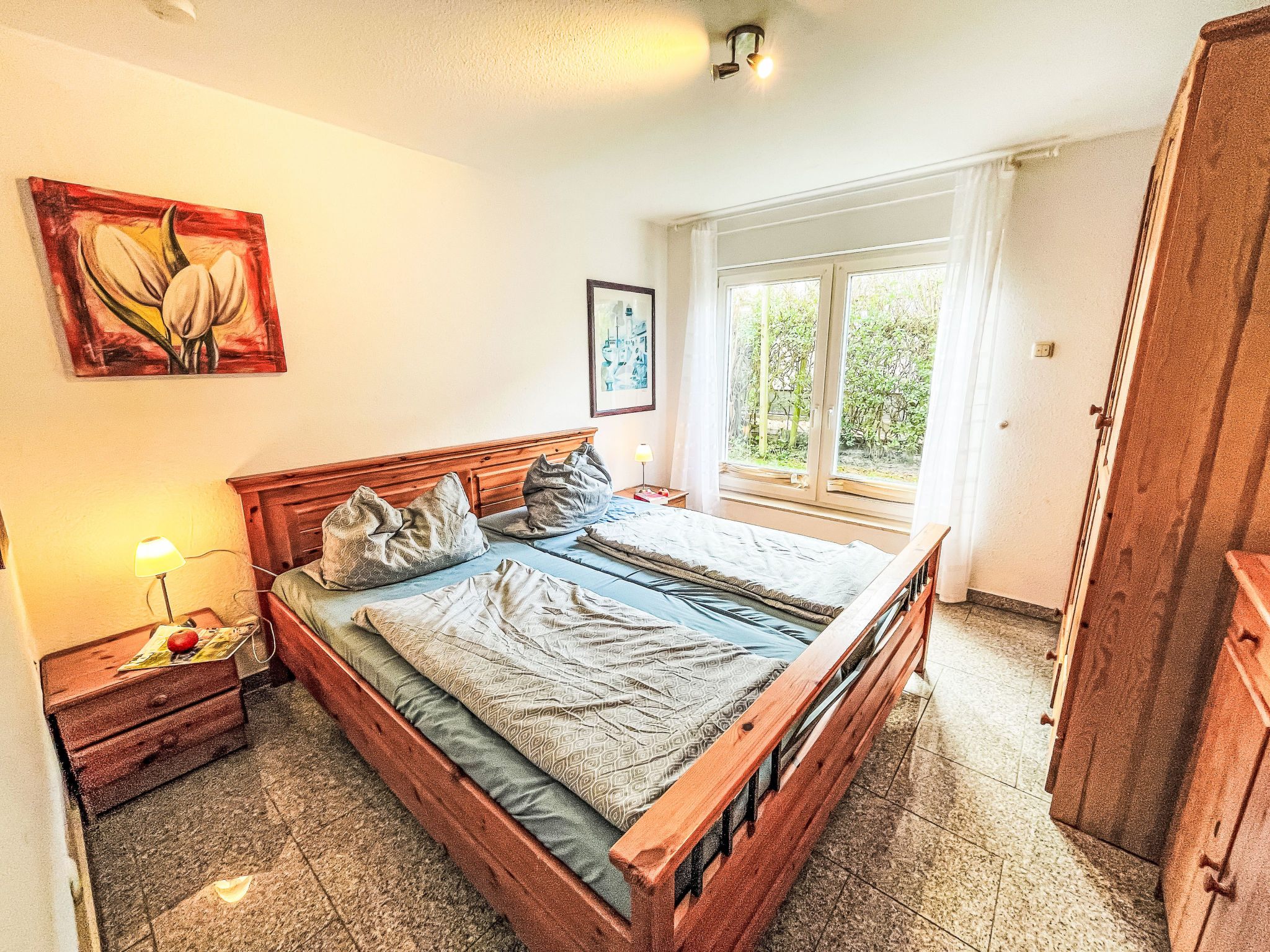 2-Zimmer-Doppelhaushälfte 50 m2, im Erdgeschoss. Zweckmässig eingerichtet: Wohn-/Schlafzimmer mit 1 Doppeldiwanbett, Schwedenofen, Esstisch, Sat-TV, Radio und CD. Ausgang zur Terrasse. 1 Zimmer mit 1 franz. Bett (160 cm, Länge 200 cm). Küche (Backofen, Geschirrspüler, 4 Glaskeramikherd Platten, Toaster, Wasserkocher, Mikrowelle, elektrische Kaffeemaschine). Dusche/WC. G-Heizung, Fussbodenheizung. Terrasse. Terrassenmöbel, Gartengrill (mobil), Liegestühle (2). Zur Verfügung: Babybett bis 2 Jahre (extra), Holz (extra). Bitte beachten: Nichtraucher-Haus. 2 Haustiere/Hunde erlaubt. Rauchmelder, Feuerlöscher.