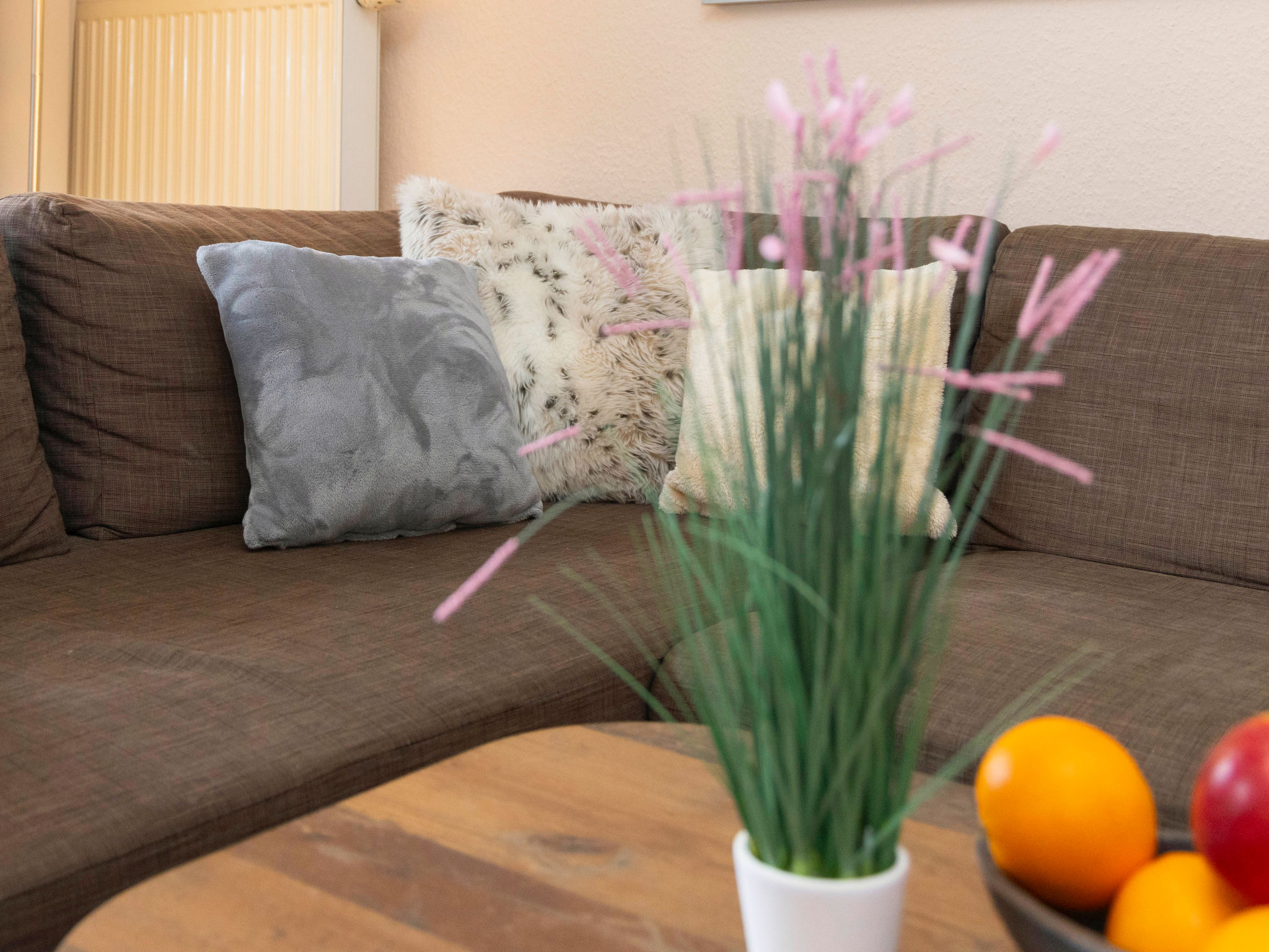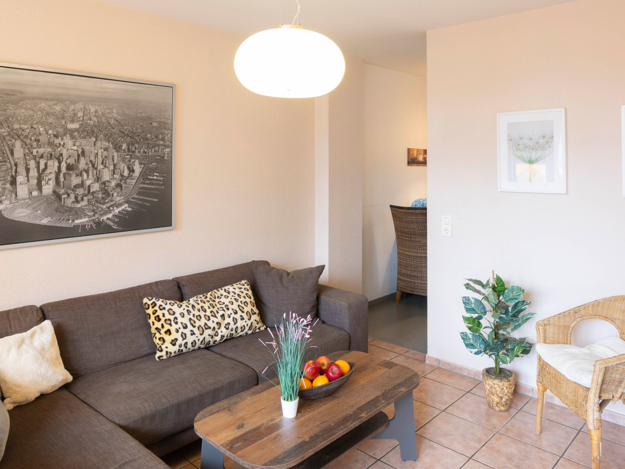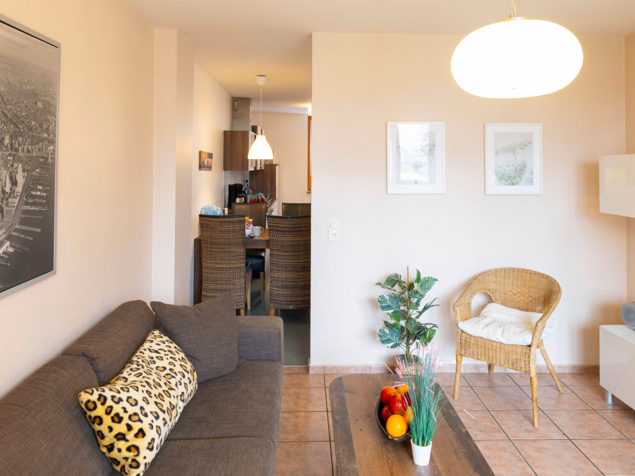 3-Zimmer-Reihenhaus 75 m2 auf 2 Stockwerken. Schön und gemütlich eingerichtet: Wohnzimmer mit Kabel-TV, Radio und CD. Ausgang zur Terrasse. Offene Küche (Backofen, Geschirrspüler, 4 Glaskeramikherd Platten, Toaster, Wasserkocher, Mikrowelle, Tiefkühler, elektrische Kaffeemaschine) mit Esstisch. Obergeschoss: 1 Zimmer mit 1 Doppelbett und Kabel-TV. Ausgang zum Balkon. 1 Zimmer mit 2 Betten. Dusche/WC. Balkon, Terrasse teilweise überdacht, kleiner Garten. Terrassenmöbel, Abstellkammer. Zur Verfügung: Waschmaschine, Kinderhochstuhl, Babybett. Internet (Wireless LAN, gratis). Parkplatz. Bitte beachten: Nichtraucher-Haus. 1 Haustier/Hund erlaubt. Rauchmelder.