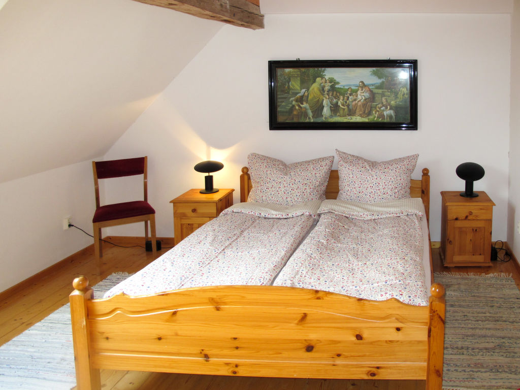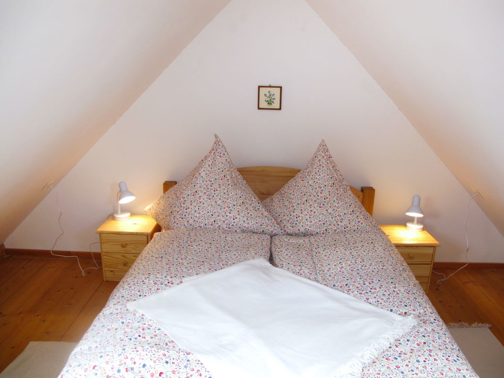 5-Zimmer-Doppelhaushälfte 110 m2 auf 3 Stockwerken. Geschmackvoll und gemütlich eingerichtet: Wohnzimmer mit Sat-TV und Radio. Esszimmer. Küche (Backofen, Geschirrspüler, 4 Glaskeramikherd Platten, Toaster, Mikrowelle, Tiefkühler, elektrische Kaffeemaschine). Dusche/WC. Obergeschoss: 1 abgeschrägtes Zimmer mit 1 Doppelbett. 1 abgeschrägtes Zimmer mit 2 Betten. Bad/WC. Dachgeschoss: (steile Treppe) 1 abgeschrägtes Zimmer, Deckenhöhe 10 - 180 cm mit 1 Doppelbett (140 cm, Länge 200 cm). G-Heizung. Holzböden. Terrasse. Terrassenmöbel, Gartengrill (mobil). Zur Verfügung: Waschmaschine, Wäschetrockner. Bitte beachten: Nichtraucher-Haus. Rauchmelder.