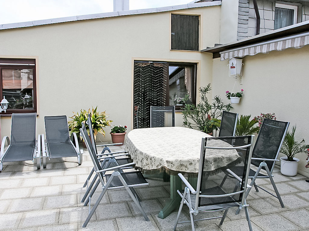 1-Zimmer-Wohnung 35 m2 im 1. Stock. Komfortabel und gemütlich eingerichtet: Wohn-/Schlafzimmer mit 1 Doppelbett und Kabel-TV (Flachbildschirm), Radio. Küche (Backofen, Geschirrspüler, Mikrowelle, elektrische Kaffeemaschine) mit Bar. Ausgang zum Balkon. Dusche/WC. Balkon 25 m2. Balkonmöbel, Gartengrill, Liegestühle (2). Zur Verfügung: Kinderhochstuhl. Internet (Wireless LAN, gratis). Bitte beachten: Nichtraucher-Unterkunft. Die Ferienwohnung befindet sich in einem separaten Gebäude (Garagen im Erdgeschoss) hinter dem Zweifamilienhaus.