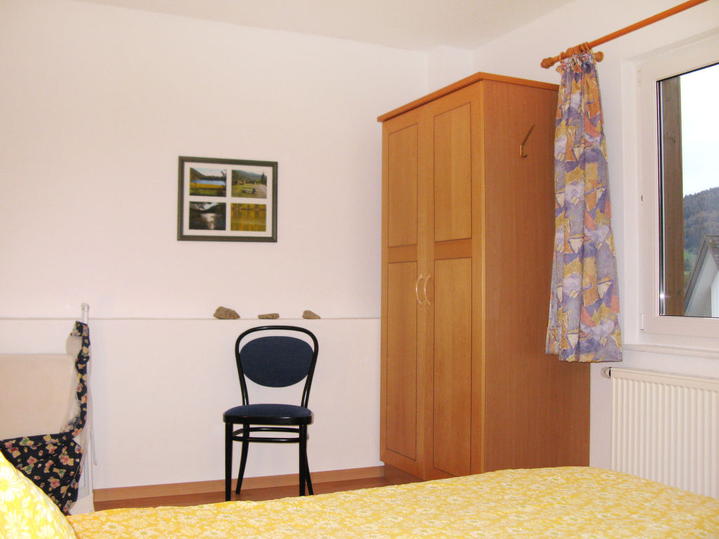 "Schwarzwaldblick", 3-Zimmer-Wohnung 75 m2 im 3. Stock. Zweckmässig eingerichtet: Wohn-/Schlafzimmer mit 1 Doppeldiwanbett, Esstisch und Sat-TV. 1 Zimmer mit 1 Doppelbett. Ausgang zum Balkon. 1 Zimmer mit 1 Doppelbett. Kleine Kochnische im Eingang (4 Kochplatten, Backofen, Toaster, Wasserkocher, elektrische Kaffeemaschine). Dusche/WC, sep. WC. Heizung. Balkon. Balkonmöbel. Zur Verfügung: Kinderhochstuhl, Babybett. Internet (Wireless LAN, gratis). Garage (1 Auto). Bitte beachten: Nichtraucher-Unterkunft. Maximal 1 Haustier/Hund erlaubt. Rauchmelder.