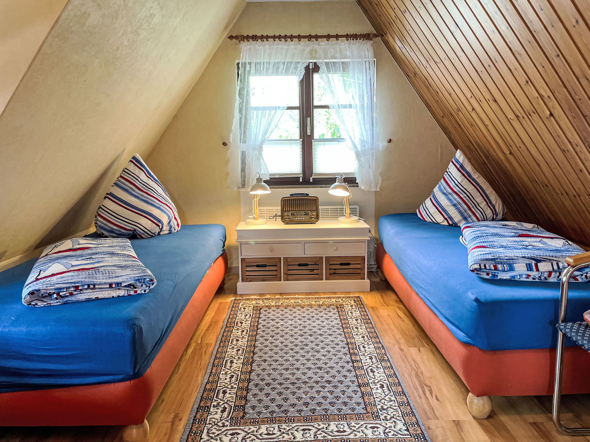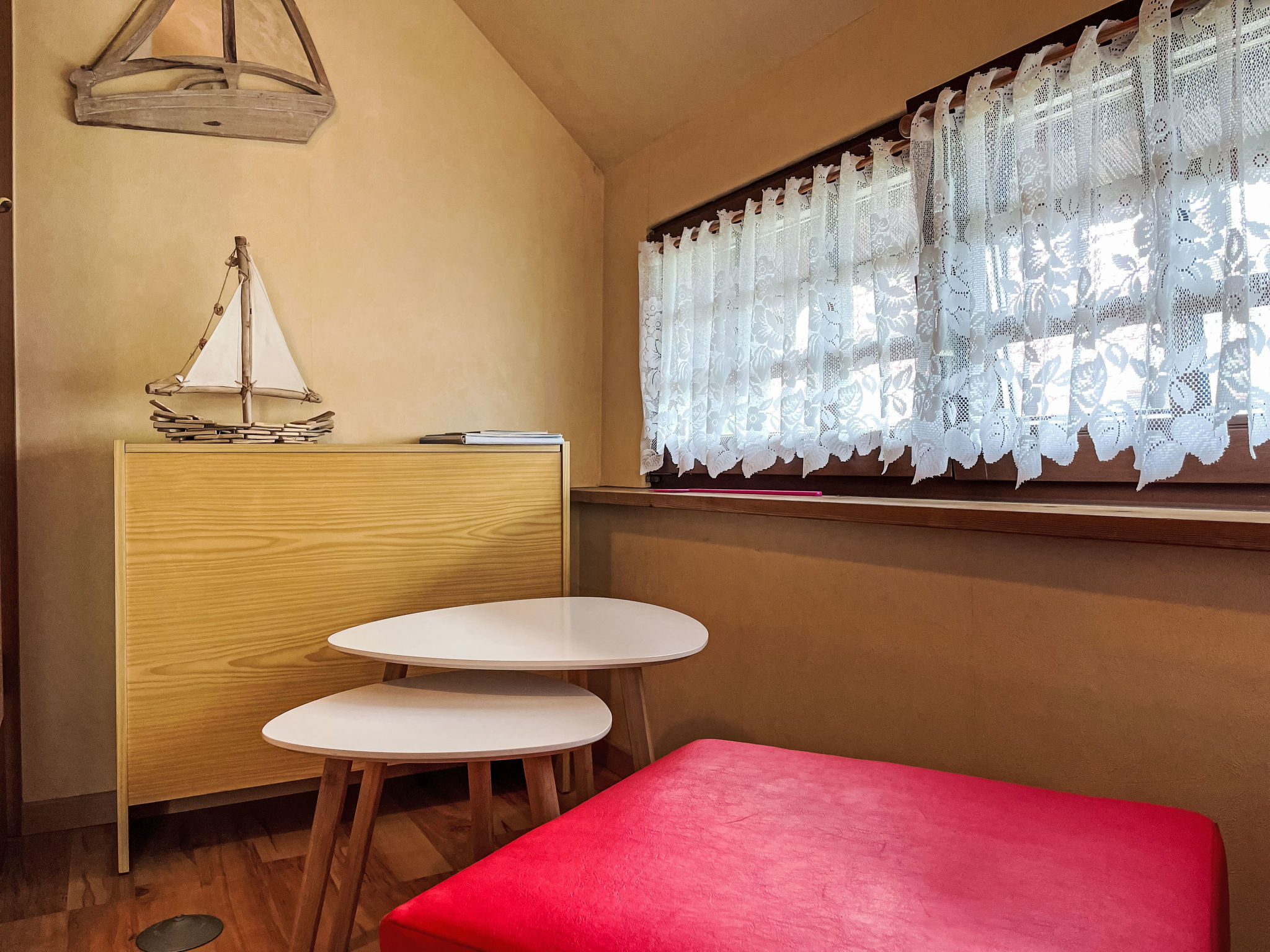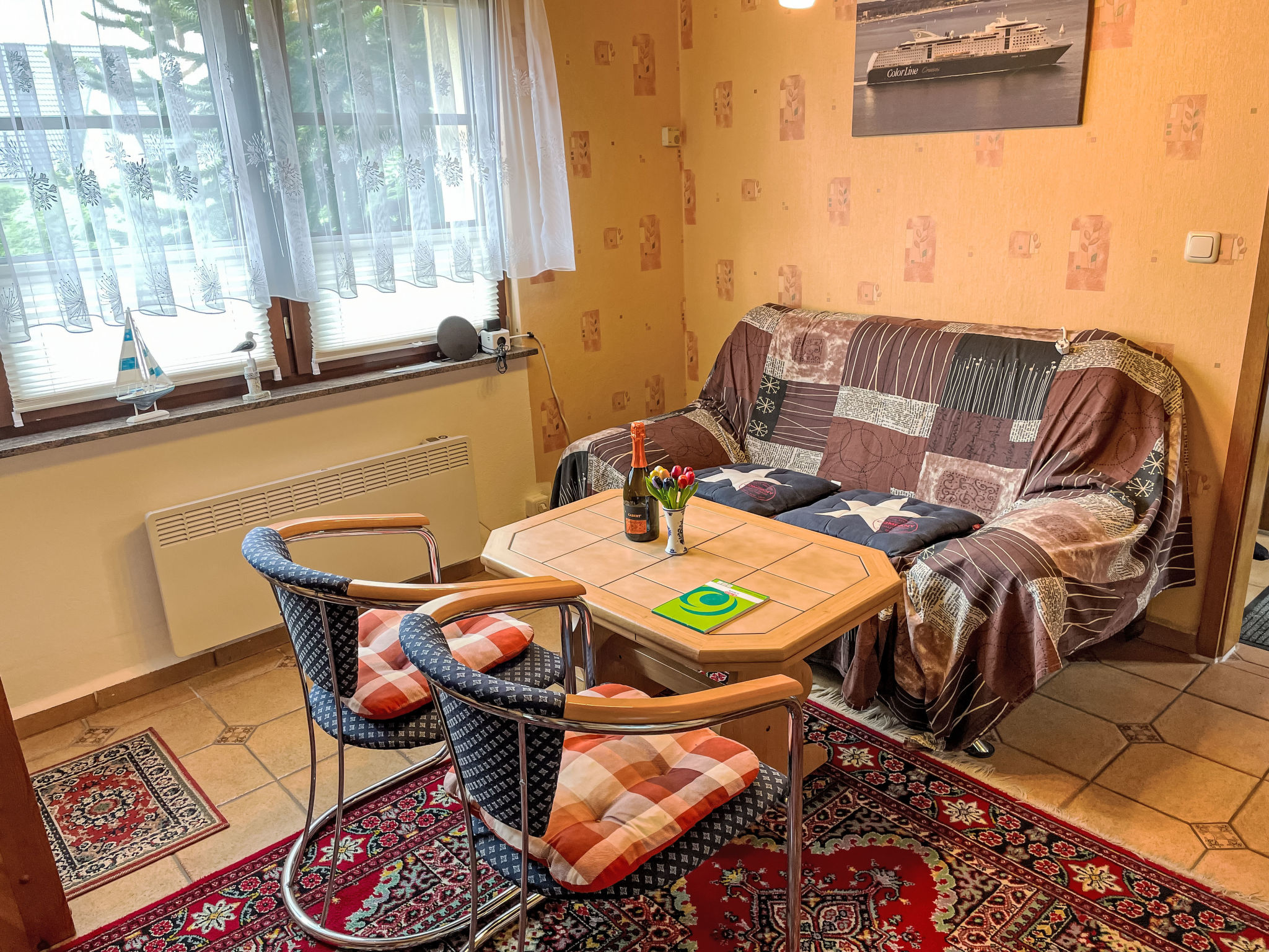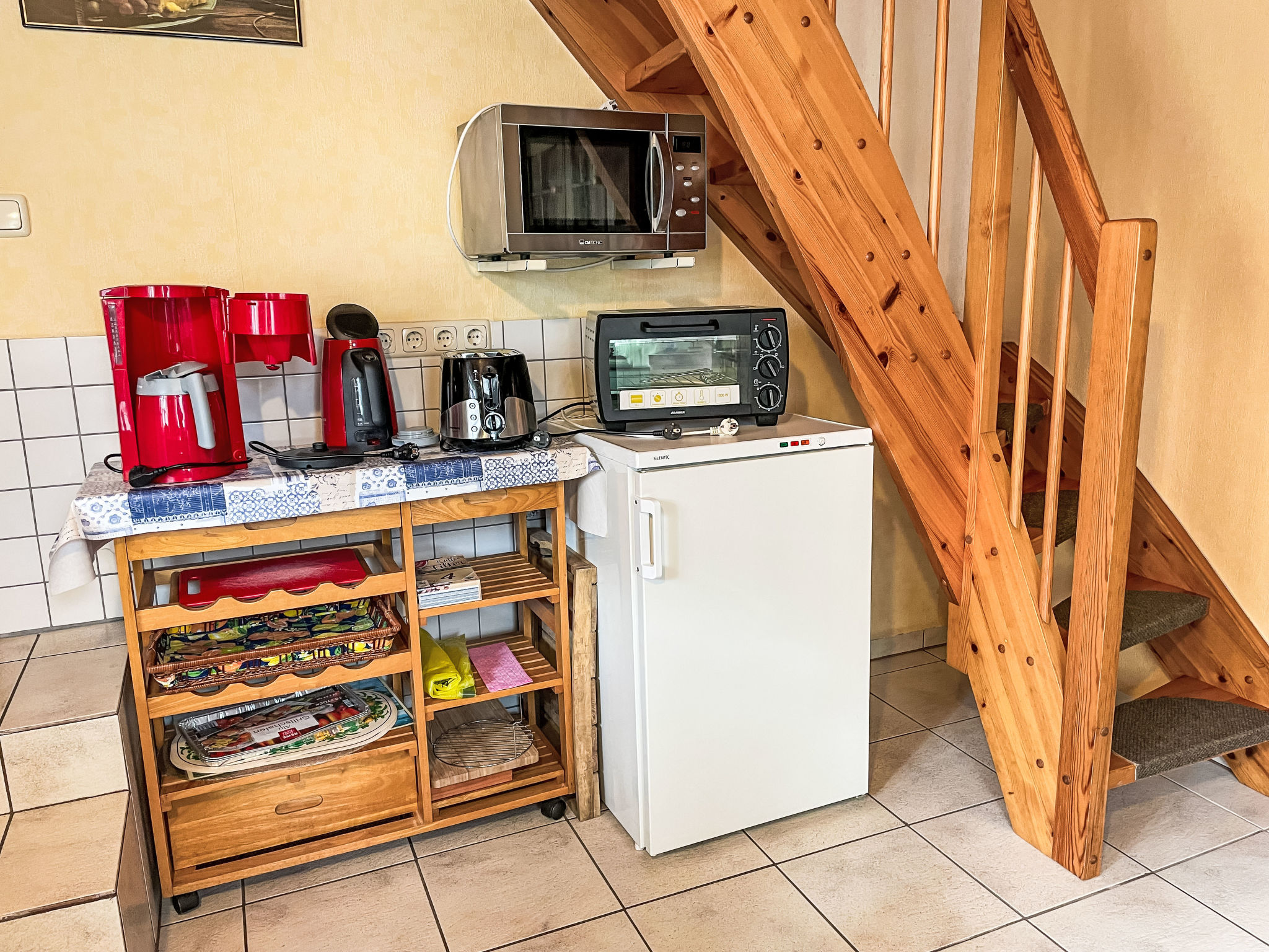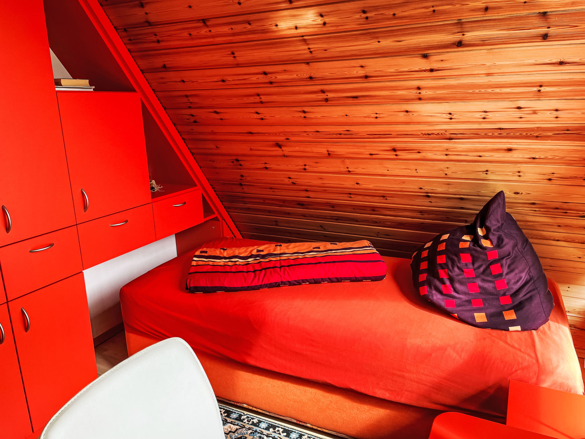 3-Zimmer-Haus 56 m2 auf 2 Stockwerken. Zweckmässig und rustikal eingerichtet: Wohn-/Esszimmer mit Esstisch, Sat-TV, Radio und CD. Küche (2 Kochplatten, Toaster, Wasserkocher, Mikrowelle, Tiefkühler, elektrische Kaffeemaschine) mit Esstisch. Dusche/WC. Obergeschoss: 1 abgeschrägtes, offenes Zimmer mit 2 Diwanbetten. 1 abgeschrägtes, offenes kleines Zimmer mit 2 Diwanbetten. E-Heizung. Terrasse. Terrassenmöbel, Gartengrill (mobil), Liegestühle (2). Zur Verfügung: Kinderhochstuhl, Babybett bis 2 Jahre. Internet (Wireless LAN, gratis). Bitte beachten: Nichtraucher-Unterkunft. Rauchmelder.