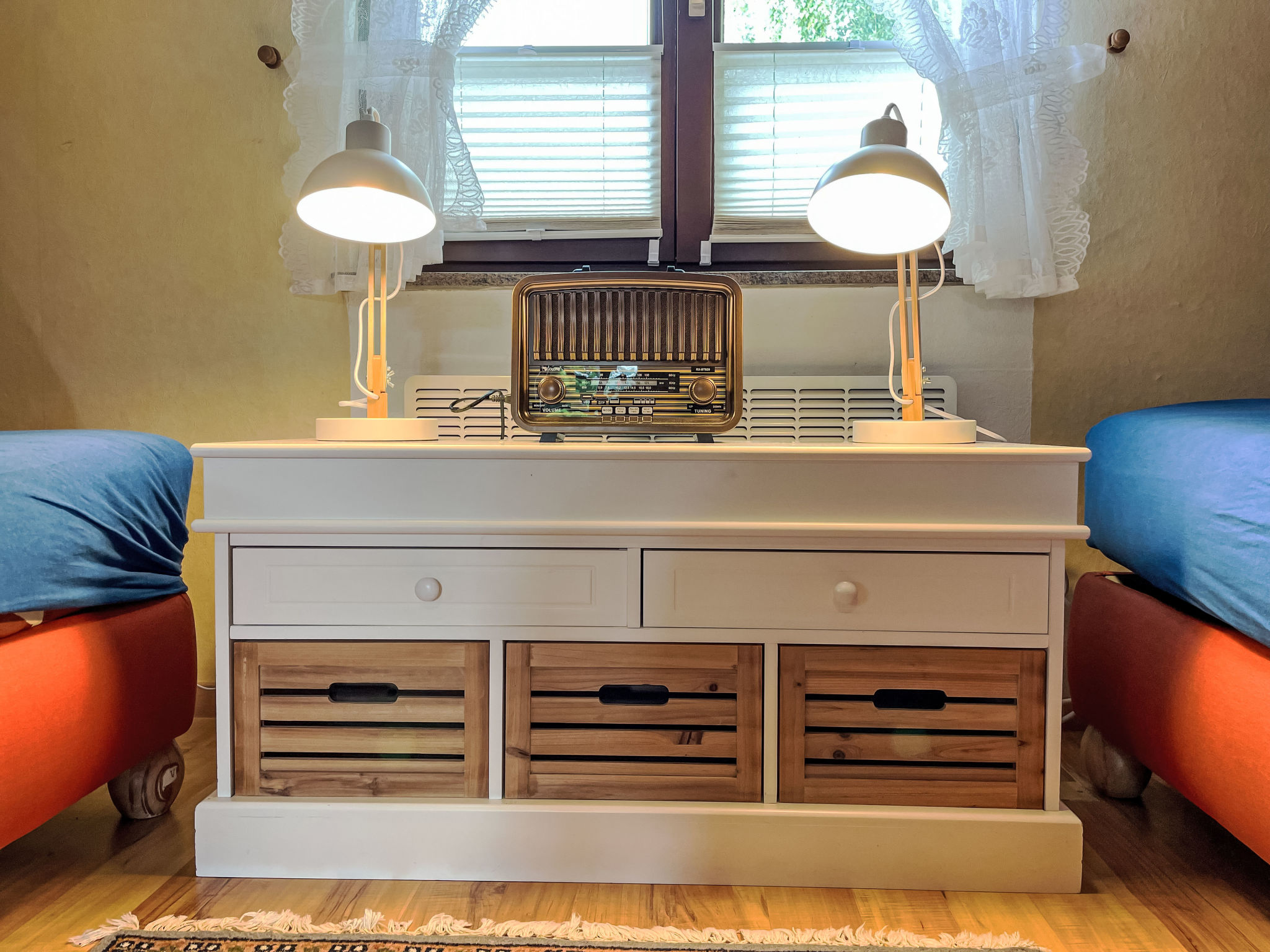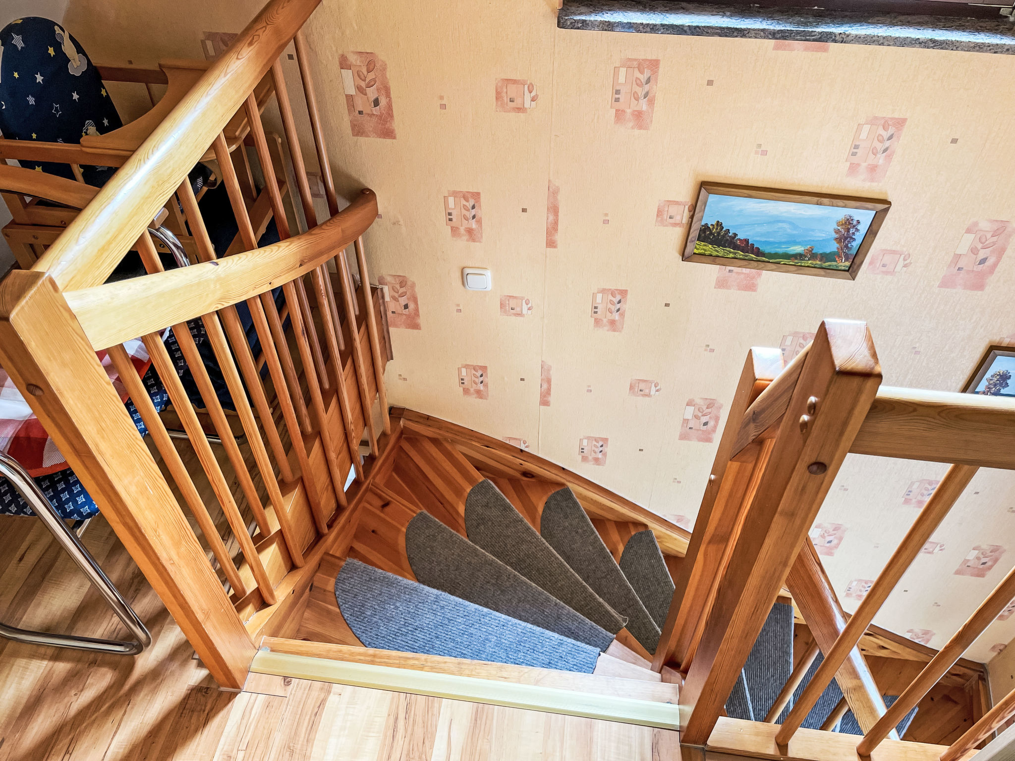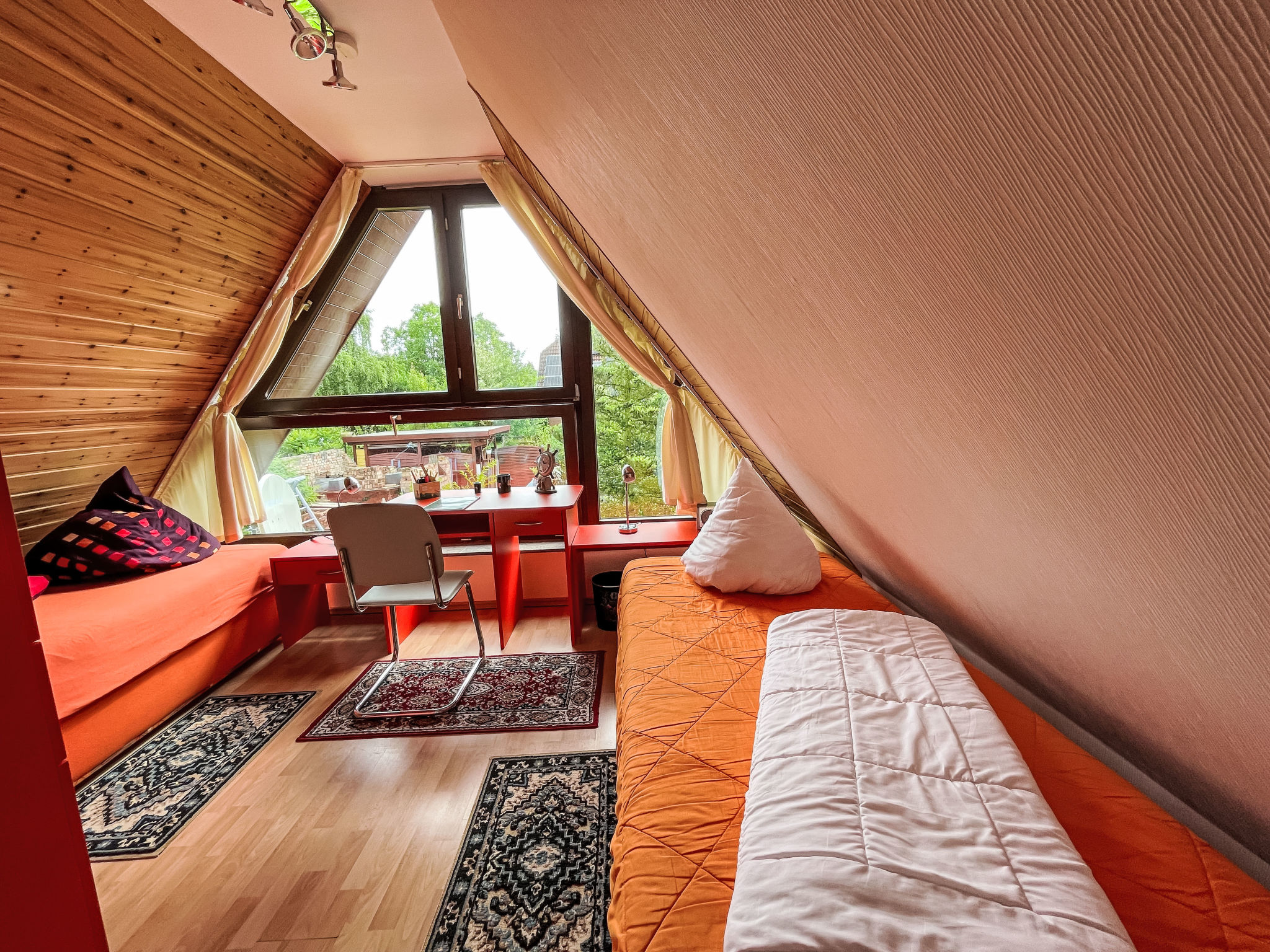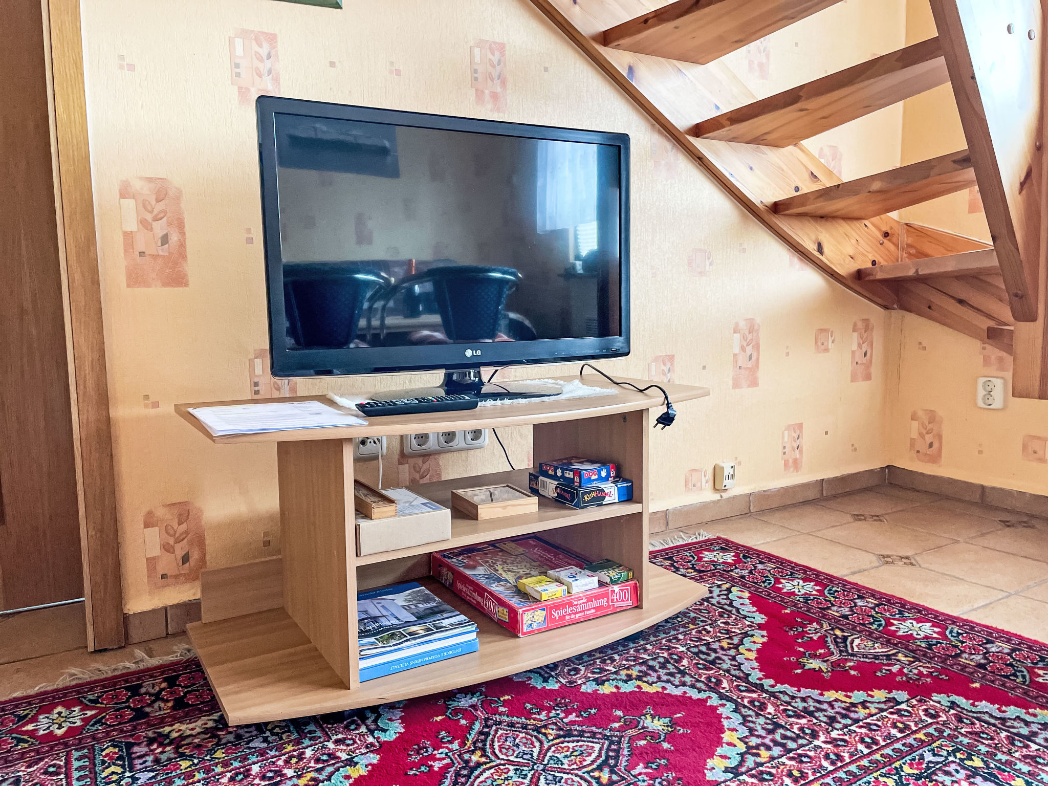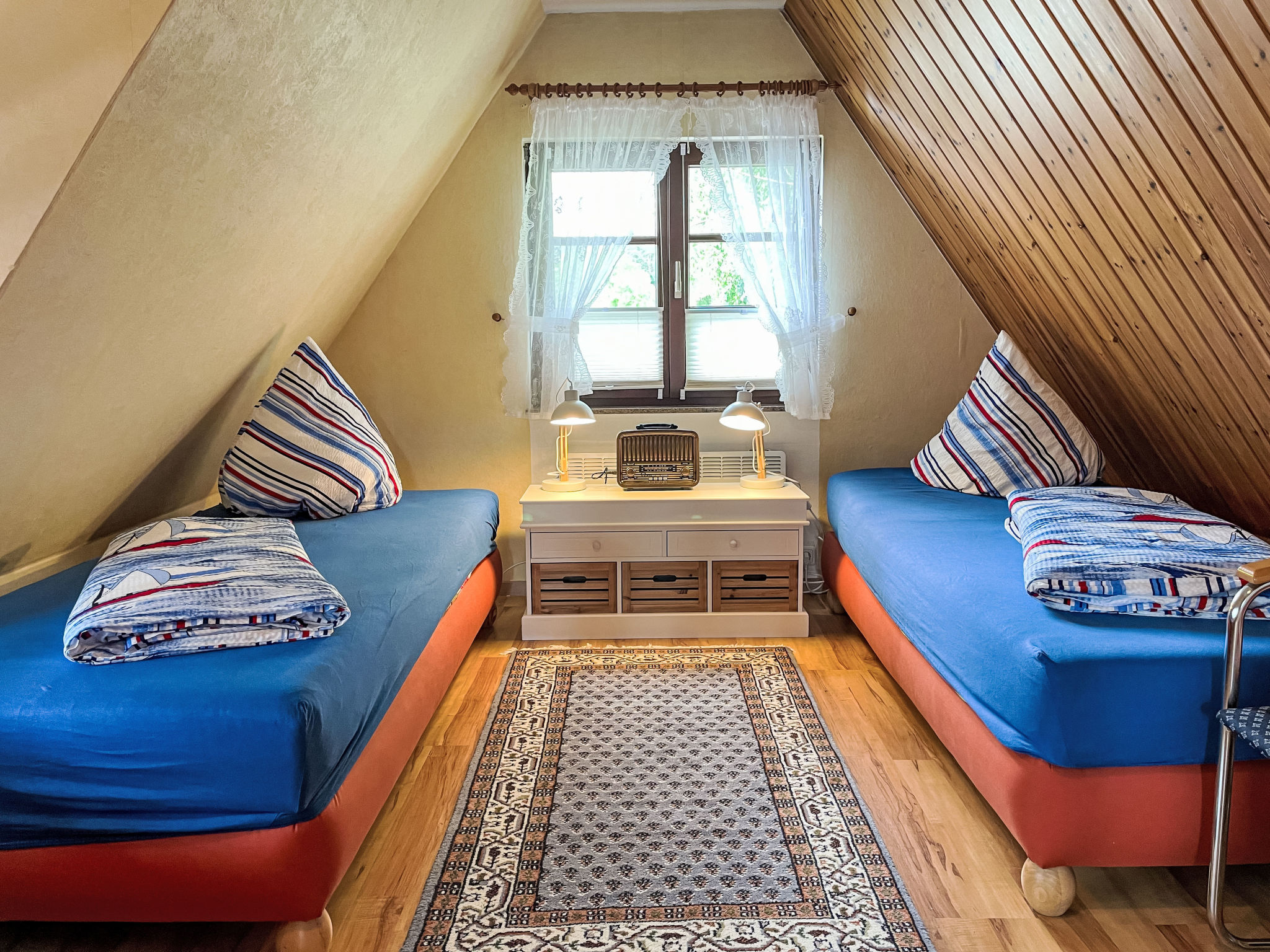 3-Zimmer-Haus 56 m2 auf 2 Stockwerken. Zweckmässig und rustikal eingerichtet: Wohn-/Esszimmer mit Esstisch, Sat-TV, Radio und CD. Küche (2 Kochplatten, Toaster, Wasserkocher, Mikrowelle, Tiefkühler, elektrische Kaffeemaschine) mit Esstisch. Dusche/WC. Obergeschoss: 1 abgeschrägtes, offenes Zimmer mit 2 Diwanbetten. 1 abgeschrägtes, offenes kleines Zimmer mit 2 Diwanbetten. E-Heizung. Terrasse. Terrassenmöbel, Gartengrill (mobil), Liegestühle (2). Zur Verfügung: Kinderhochstuhl, Babybett bis 2 Jahre. Internet (Wireless LAN, gratis). Bitte beachten: Nichtraucher-Unterkunft. Rauchmelder.