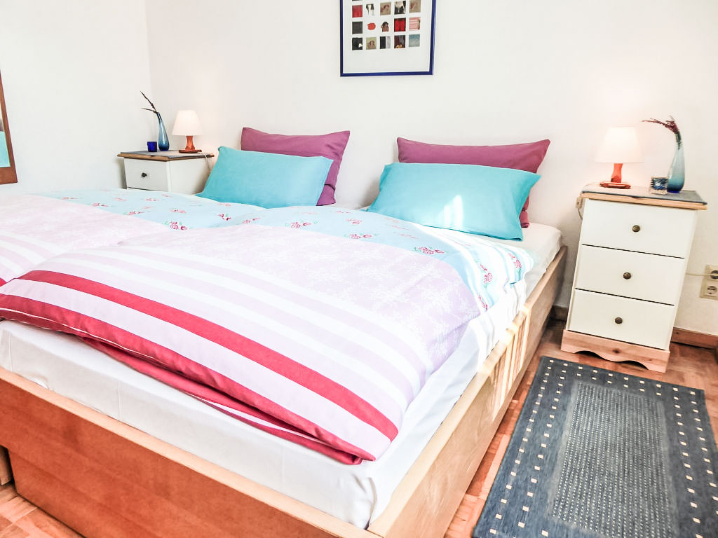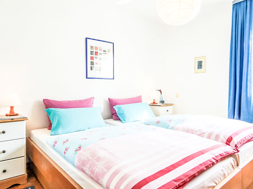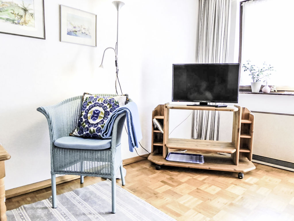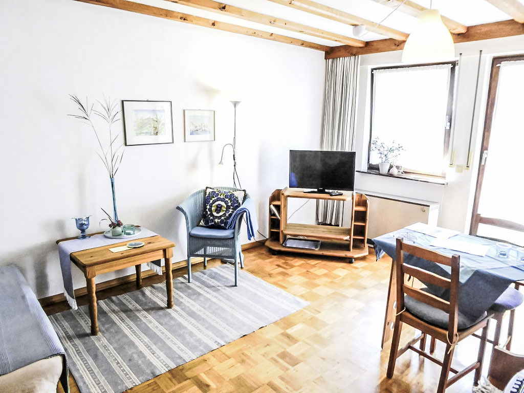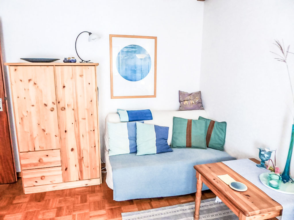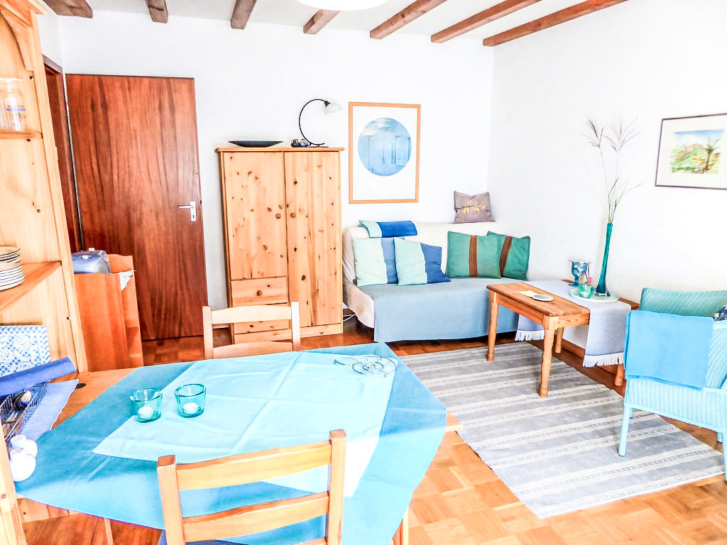 2-Zimmer-Wohnung 42 m2 im 2. Stock. Gemütlich eingerichtet: Wohn-/Esszimmer mit Sat-TV (Flachbildschirm), CD. Ausgang zum Balkon. 1 Zimmer mit 2 Betten. Küche (3 Kochplatten, Backofen, Toaster, Mikrowelle, elektrische Kaffeemaschine). Dusche, sep. WC. Balkon, Südlage. Balkonmöbel. Zur Verfügung: Internet (Wireless LAN, gratis). Bitte beachten: Nichtraucher-Unterkunft. Maximal 2 Haustiere/Hunde erlaubt.