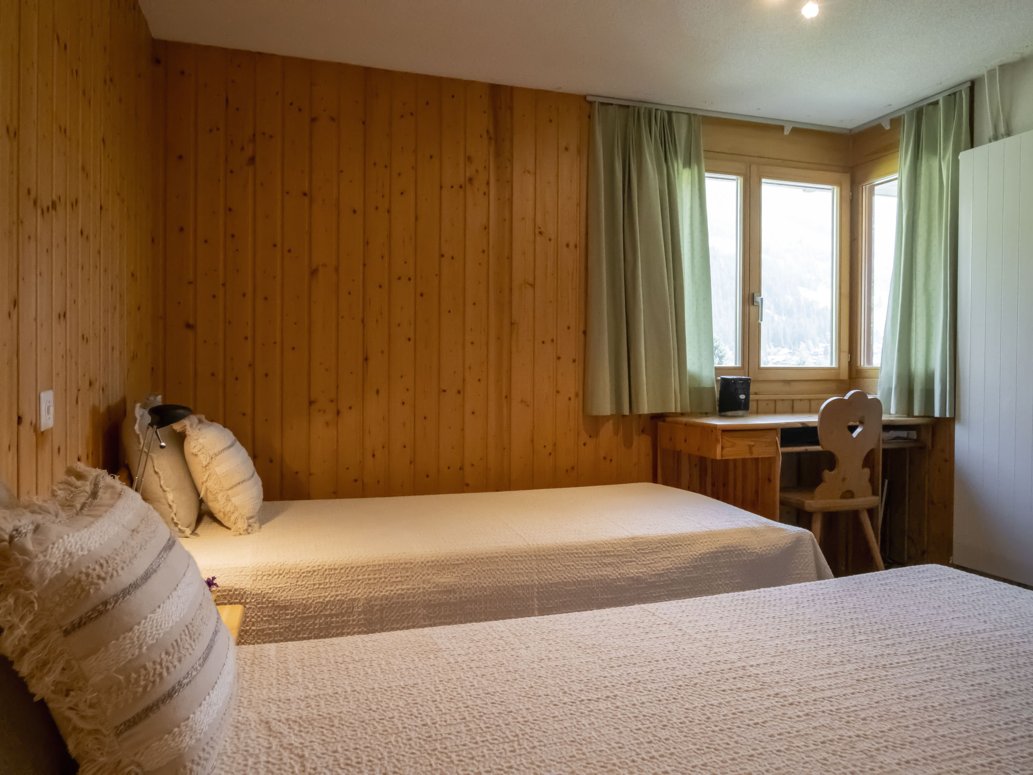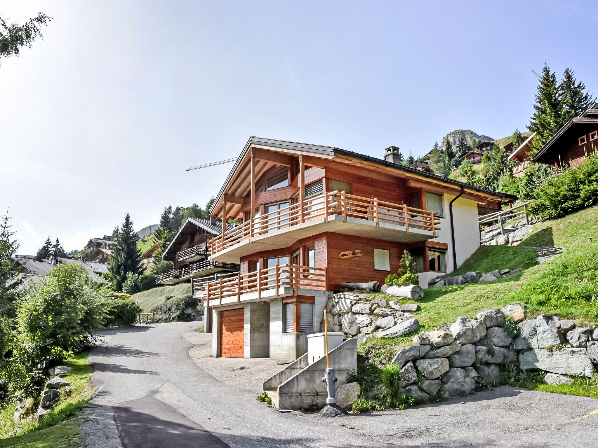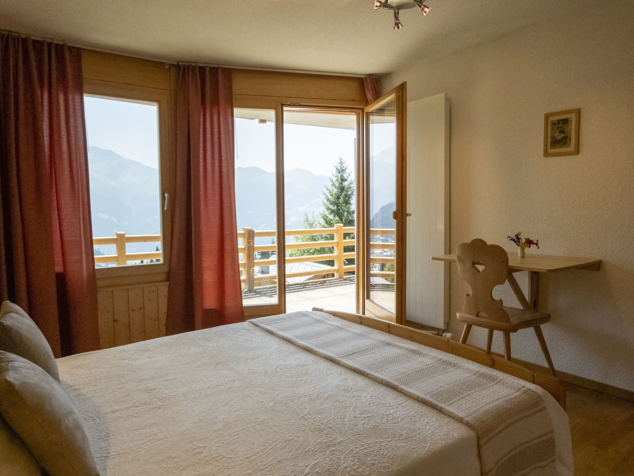 "Midat soleil", 4-Zimmer-Haus 130 m2 auf 2 Stockwerken. Komfortabel und gemütlich eingerichtet: grosses Wohn-/Esszimmer mit offenem Kamin und Kabel-TV. Ausgang zum Balkon, zur Terrasse. Grosse, offene Küche (Backofen, Geschirrspüler, 4 Glaskeramikherd Platten, Mikrowelle, elektrische Kaffeemaschine). Sep. WC. Unteres Geschoss: 1 grosses Zimmer mit 1 franz. Bett (1 x 180 cm, Länge 200 cm), Bad und Kabel-TV. Ausgang zum Balkon. 1 grosses Zimmer mit 1 franz. Bett (1 x 160 cm, Länge 200 cm). Ausgang zum Balkon. 1 grosses Zimmer mit 1 Doppelbett (2 x 90 cm, Länge 200 cm). 2 Duschen/WC. Panoramasicht auf die Berge, das Tal und die Skipiste. Zur Verfügung: Kinderhochstuhl, Babybett. Internet (Wireless LAN, gratis). Parkplatz, Garage. Bitte beachten: Nichtraucher-Haus. 1 Haustier/Hund erlaubt. Das Zimmer mit den 2 Doppelbetten befindet sich im Erdgeschoss. Mit Dusche/WC.