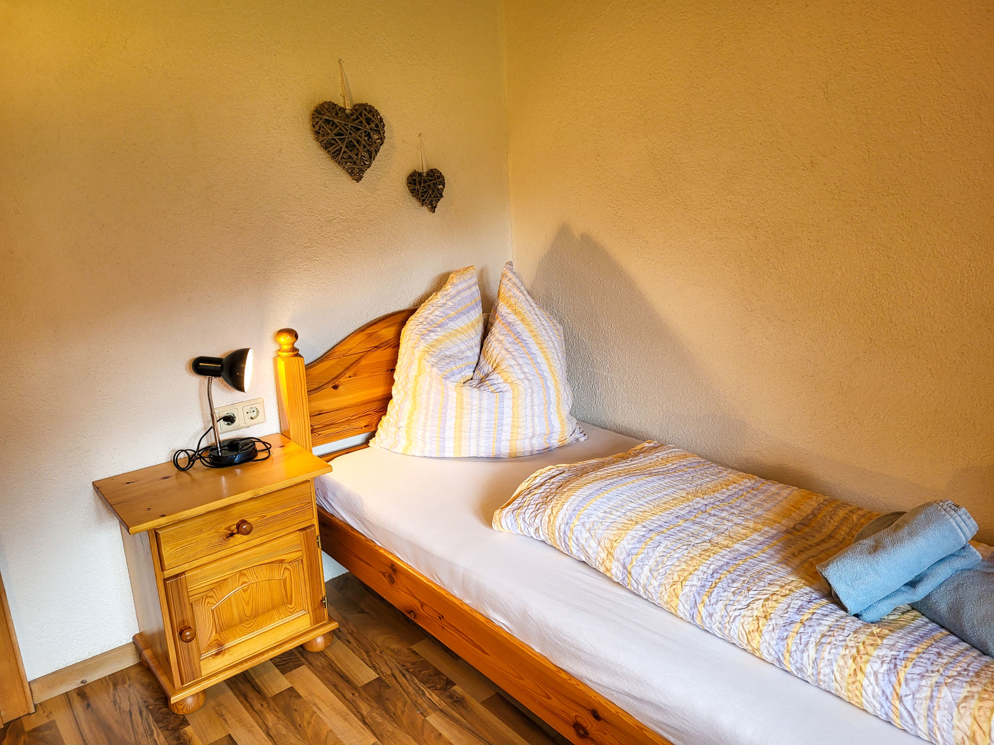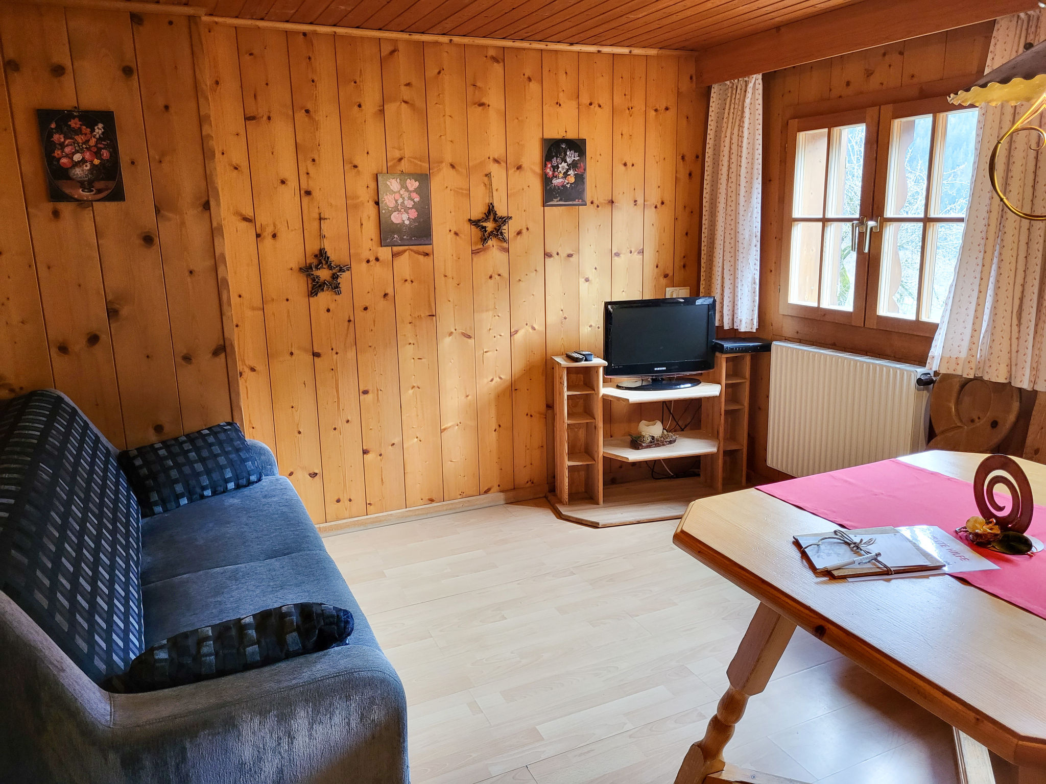 3-Zimmer-Wohnung 60 m2 im 1. Stock. Komfortabel und gemütlich eingerichtet: Wohn-/Esszimmer mit 1 Ausziehbett (2 Pers.), Sat-TV und Radio. 1 Zimmer mit 2 Betten und Waschbecken. 1 Doppelzimmer mit Waschbecken. Küche (4 Kochplatten, Backofen, Geschirrspüler, Mikrowelle). Dusche/WC. Zur Verfügung: Internet (Wireless LAN, gratis). Bitte beachten: Nichtraucher-Unterkunft. 1 Haustier/Hund erlaubt.