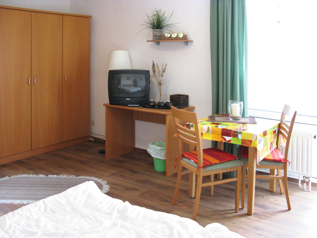 1-Zimmer-Wohnung 25 bis 30 m2. Zweckmässig eingerichtet: Wohn-/Schlafzimmer mit 1 Doppelbett, Esstisch, Kabel-TV und Radio. Ausgang zum Balkon. Kochnische (2 Kochplatten, Wasserkocher, elektrische Kaffeemaschine). Dusche/WC. G-Heizung. Teppichboden. Balkon oder Terrasse. Terrassenmöbel, Balkonmöbel. Sicht auf den Hafen. Zur Verfügung: Bügeleisen, Kinderhochstuhl, Babybett (extra). Internet (Wireless LAN, gratis). Bitte beachten: Nichtraucher-Unterkunft. Rauchmelder, Feuerlöscher.