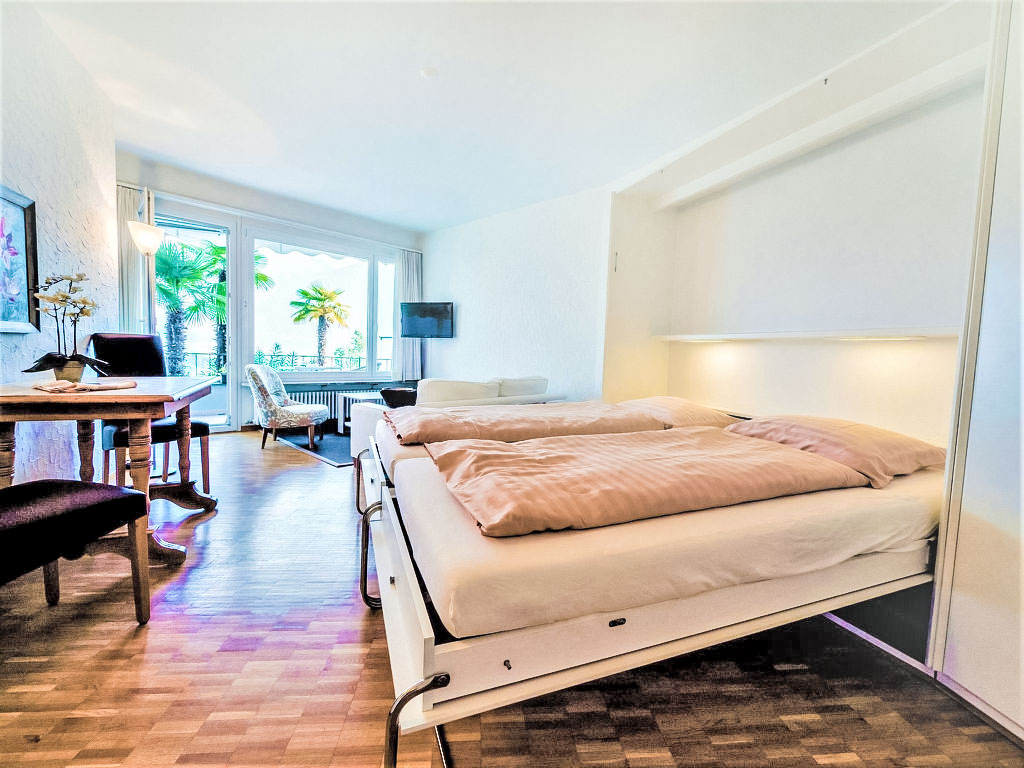 "Double Room Classic", 1-Zimmer-Wohnung 35 m2 im 1. Stock, Südlage. Wohn-/Esszimmer mit 2 Klappbetten, Sat-TV und Radio. Kochnische (Backofen, elektrische Kaffeemaschine, Kapseln für die Kaffeemaschine (Nespresso) extra). Bad/WC. Balkon, Südlage. Schöne Sicht auf den See und die Berge. Zur Verfügung: Internet (Wireless LAN, gratis). Bitte beachten: Nichtraucher-Unterkunft, Nichtraucher-Haus. Maximal 1 Haustier/Hund erlaubt.