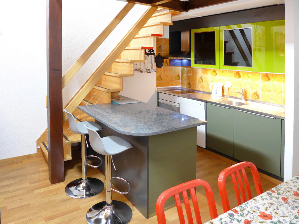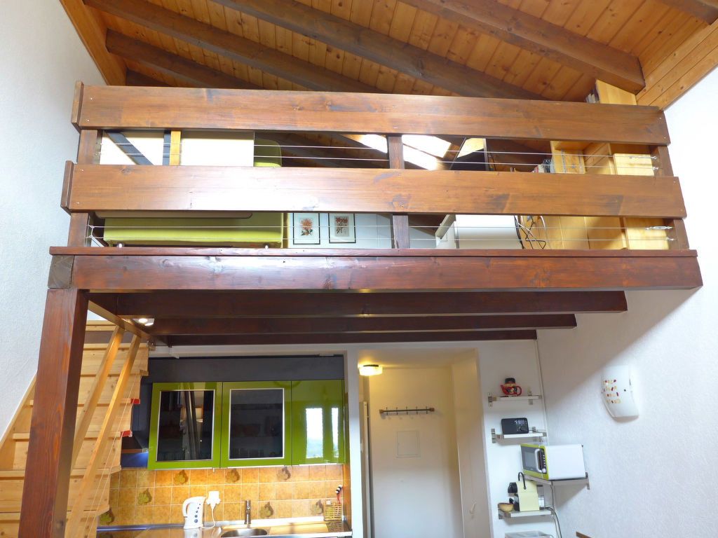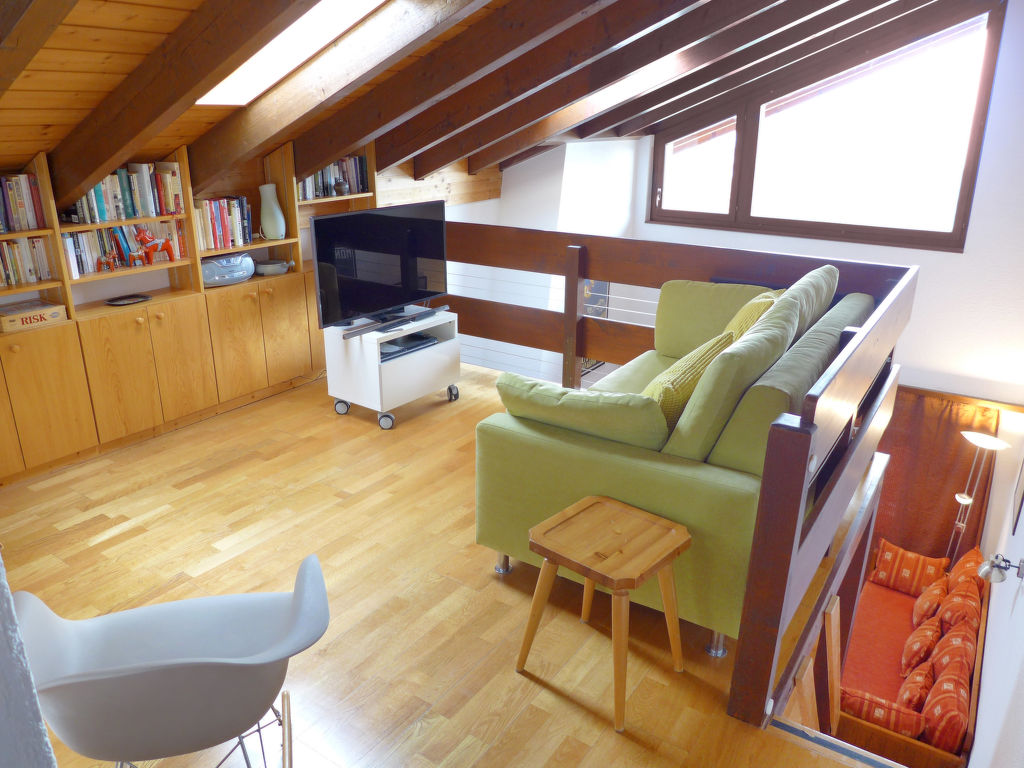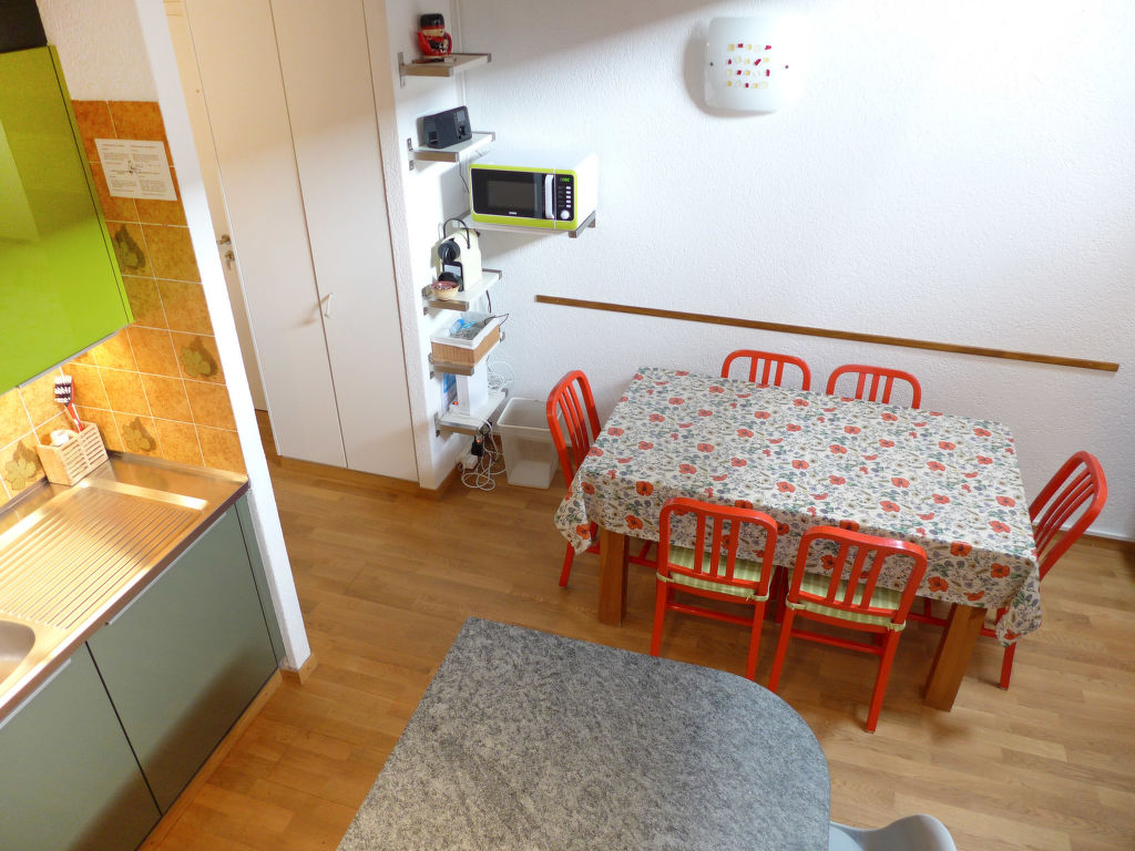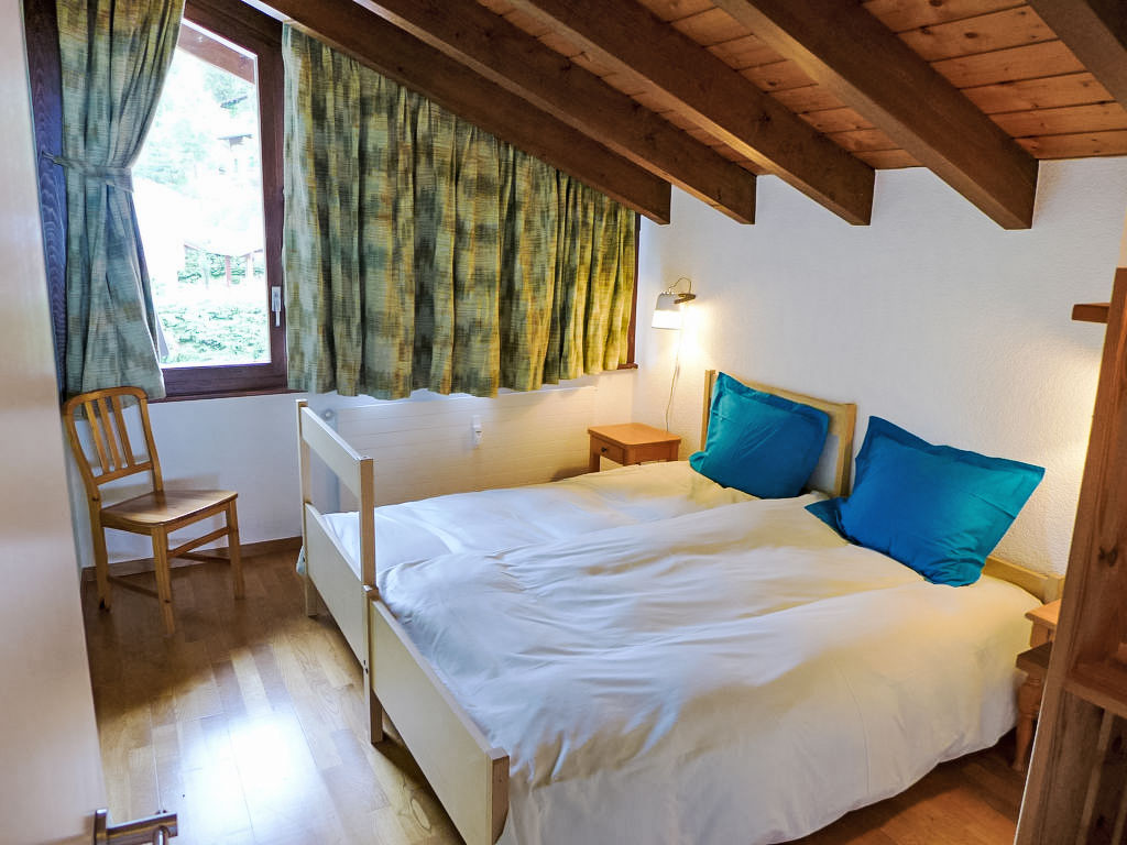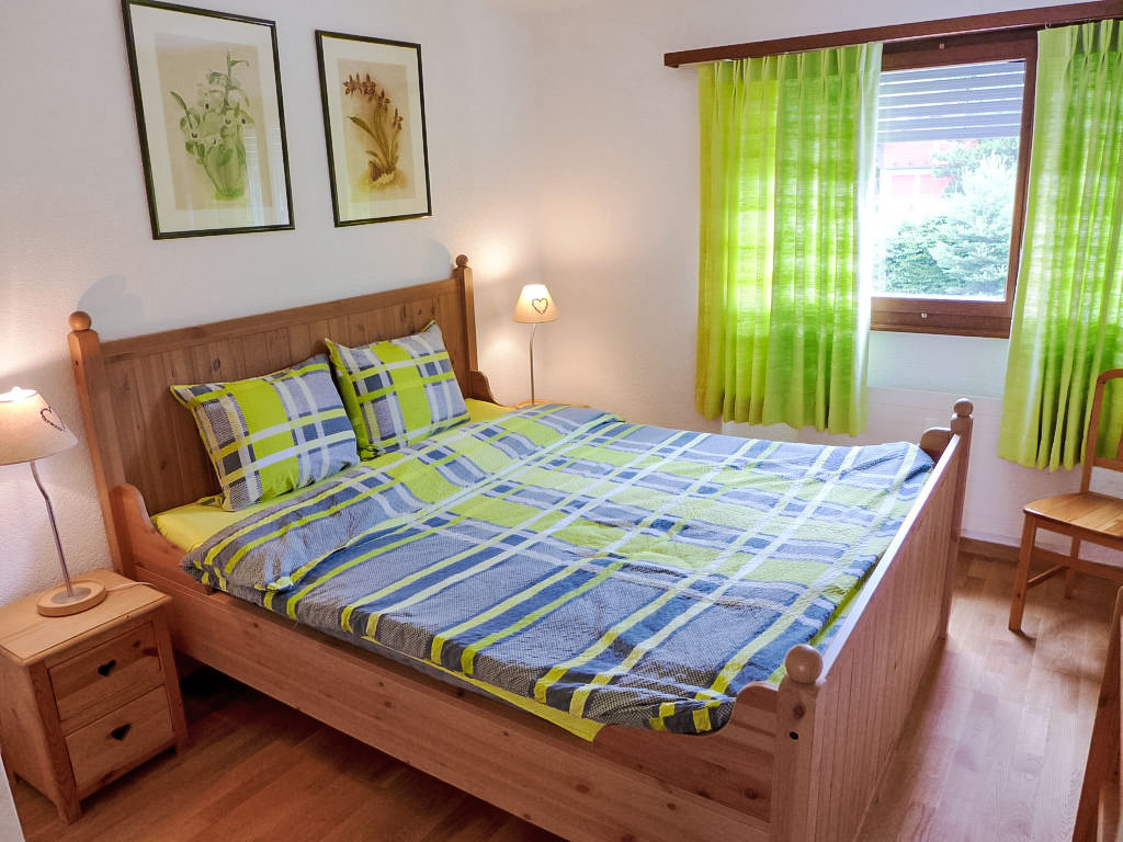 3-Zimmer-Wohnung 78 m2 auf 2 Stockwerken im 3. Stock. Teilweise abgeschrägt, schön eingerichtet: Wohn-/Esszimmer mit Radio und CD. 1 Zimmer mit 1 franz. Bett (160 cm). Offene Küche (Backofen, Geschirrspüler, 4 Glaskeramikherd Platten, Toaster, Wasserkocher, Mikrowelle, elektrische Kaffeemaschine, Kapseln für die Kaffeemaschine (DELONGHI) extra, Fondue Set (Käse)). Bad/WC. Obergeschoss: (steile Treppe) kleiner Salon mit Kabel-TV (Flachbildschirm), DVD. 1 Zimmer mit 2 Betten. Sep. WC. Balkon 8 m2, Westlage. Balkonmöbel. Schöne Sicht auf die Berge und das Tal. Zur Verfügung: Kinderhochstuhl, Babybett bis 2 Jahre, Haartrockner. Internet (Wireless LAN, gratis). Garage Nr. 20, Höhe 190 cm, Breite 230 cm. Bitte beachten: Nichtraucher-Unterkunft. Faltbares Babybett ohne Bettwäsche und ohne Decke.