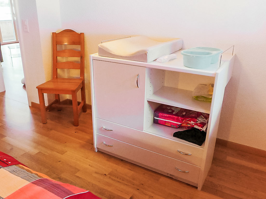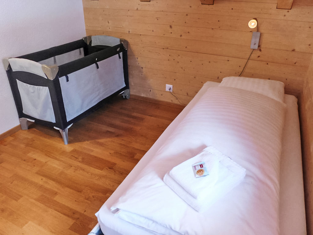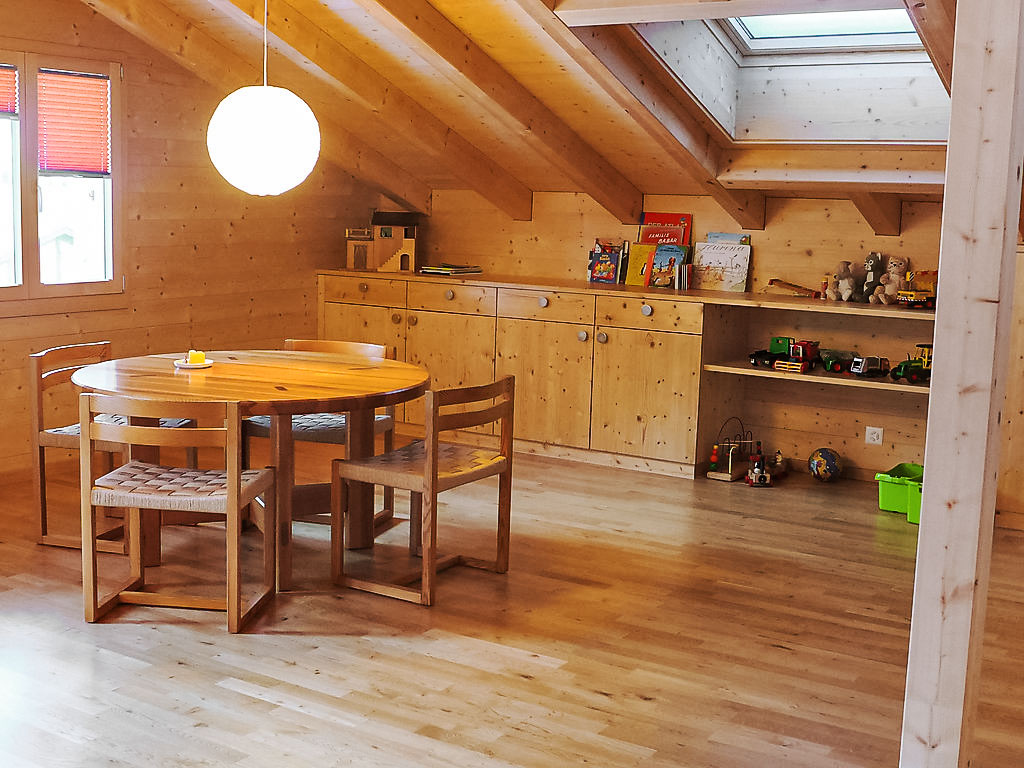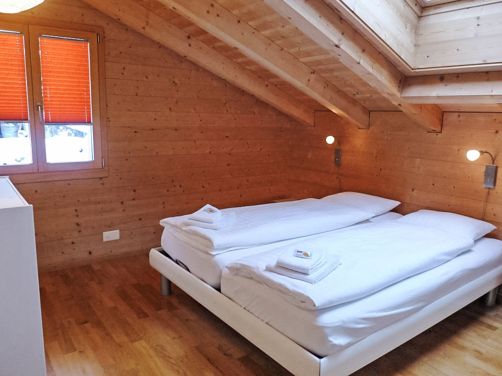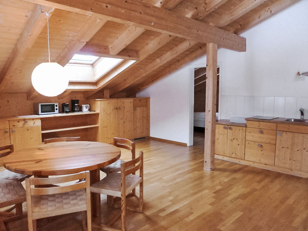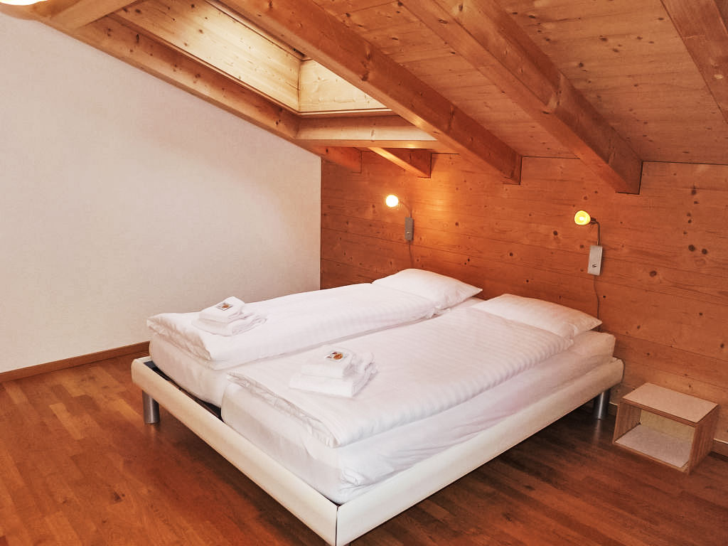 4-Zimmer-Wohnung 90 m2, im Dachgeschoss, Südlage. Geräumig und hell, teilweise abgeschrägt, gemütlich und mit viel Holz eingerichtet: Wohn-/Esszimmer mit Kabel-TV (Flachbildschirm), Radio. Ausgang zum Balkon, Richtung Süden. 1 Zimmer mit 1 Bett (90 cm, Länge 200 cm). 2 Doppelzimmer (2 x 80 cm, Länge 200 cm). Kochnische (2 Kochplatten, Toaster, Wasserkocher, Mikrowelle, elektrische Kaffeemaschine, Kapseln für die Kaffeemaschine (Nespresso) extra, Racletteofen, Fondue Set (Käse)). Dusche/WC. Fussbodenheizung. Parkettböden. Balkon, Südlage. Balkonmöbel. Herrliche Sicht auf die Berge und Eigernordwand. Zur Verfügung: Haartrockner. Internet (Wireless LAN, gratis). Parkplatz (überdacht) beim Haus. Bitte beachten: Nichtraucher-Unterkunft. Feuerlöscher.