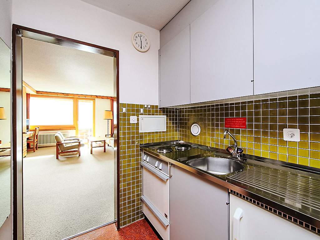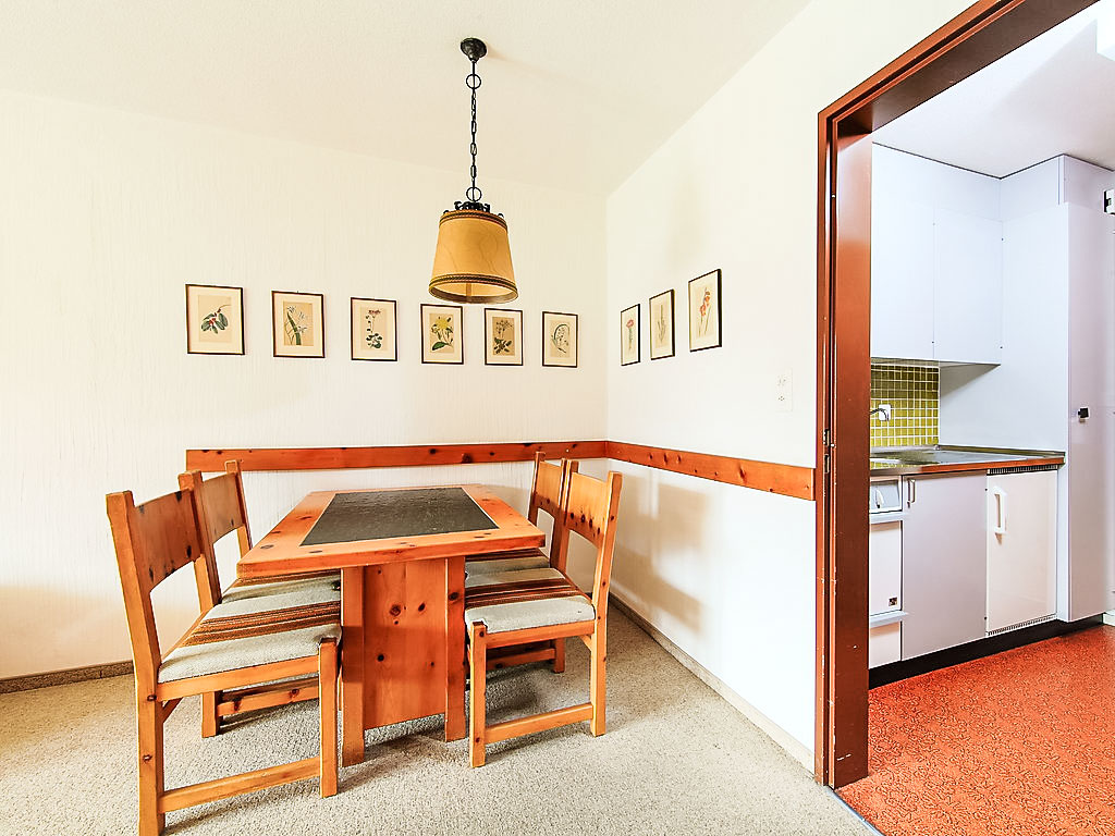 1-Zimmer-Wohnung 38 m2 im 5. Stock. Komfortabel und rustikal eingerichtet: Wohn-/Esszimmer mit 2 Wandschrankbetten und Kabel-TV (Flachbildschirm), Radio. Ausgang zum Balkon. Kochnische (2 Kochplatten, Backofen). Dusche/WC. Balkon 7 m2, Südlage. Schöne Sicht auf die Berge, die Landschaft und die Ortschaft. Zur Verfügung: Internet (Wireless LAN, gratis). Parkplatz. Bitte beachten: Nichtraucher-Unterkunft.