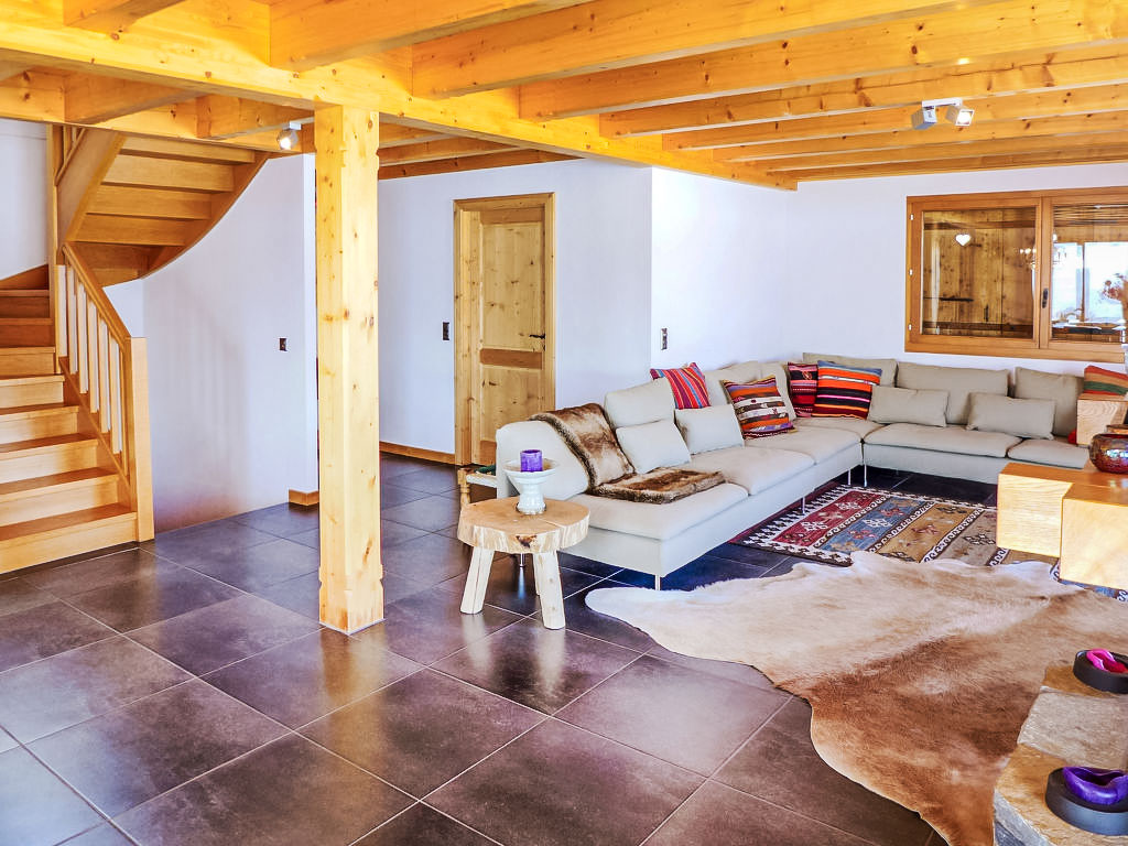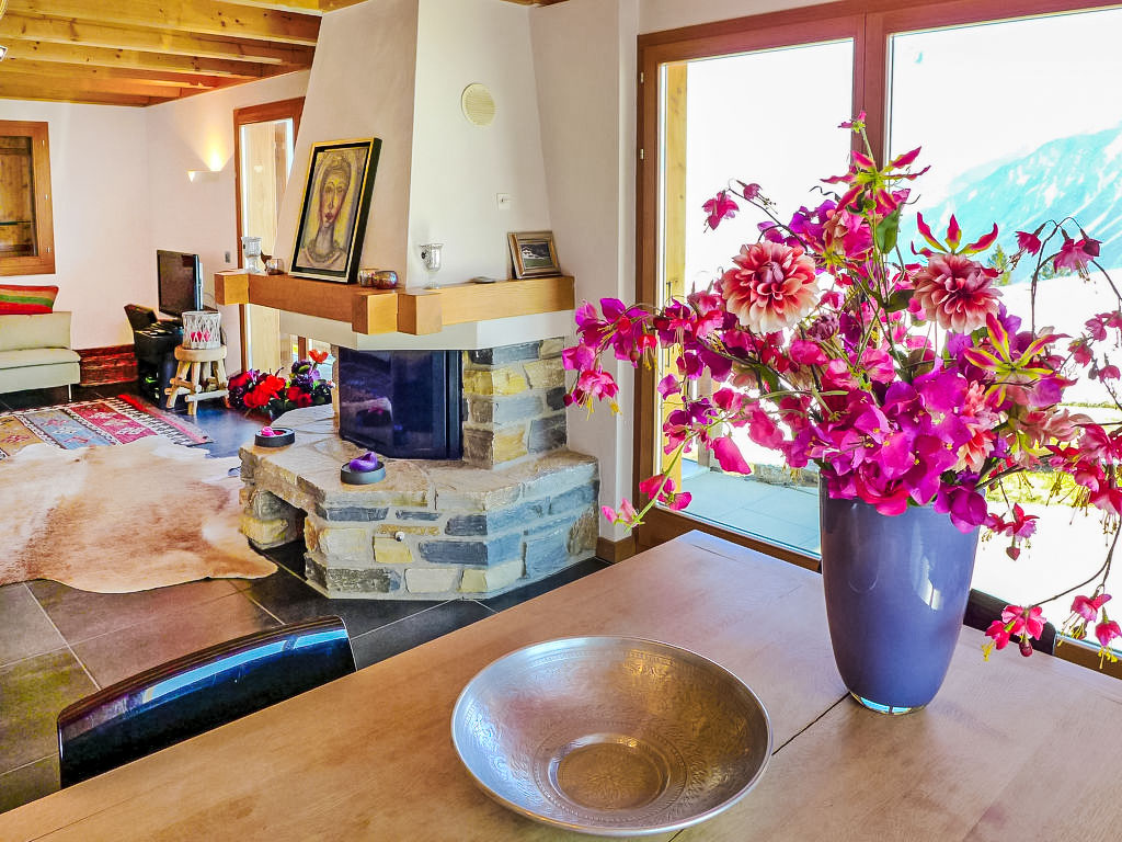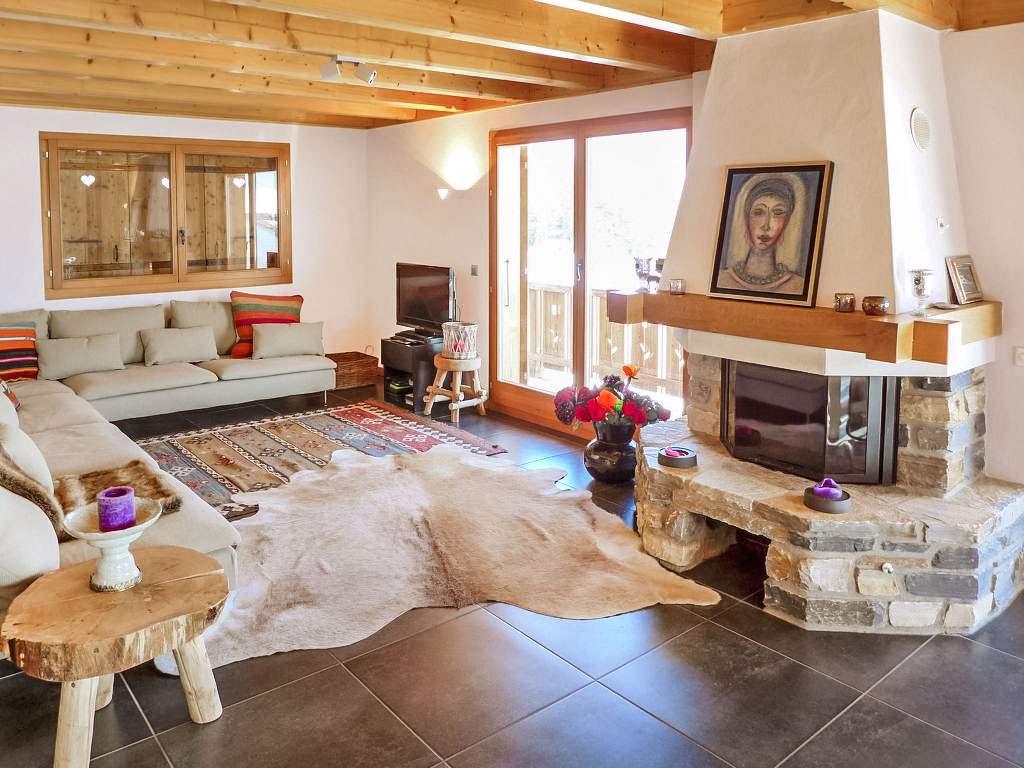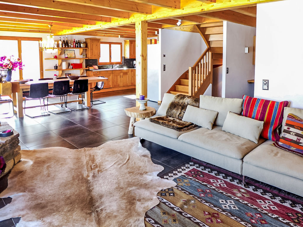 4-Zimmer-Chalet 200 m2 auf 3 Stockwerken. Komfortabel und modern eingerichtet: offenes grosses Wohn-/Esszimmer mit offenem Kamin, Kabel-TV, Flachbildschirm, CD und Stereoanlage. Ausgang zur Terrasse, Richtung Süden und Richtung Westen. Wohnküche (Backofen, Geschirrspüler, 4 Glaskeramikherd Platten, Toaster, Wasserkocher, Mikrowelle, Tiefkühler, elektrische Kaffeemaschine, Kapseln für die Kaffeemaschine (Nespresso) extra, Racletteofen, Fondue Set (Chinoise, Käse)). Sep. WC. Unteres Geschoss: 1 Zimmer mit 2 Betten und Dusche/WC. Obergeschoss: 1 abgeschrägtes grosses Zimmer mit 2 Betten. Ausgang zum Balkon, Richtung Süden. 1 abgeschrägtes Zimmer mit 2 Betten. Bidet, Bad/Dusche/WC. Balkon, Südlage Balkon, Südlage und Ostlage Terrasse, Südlage und Westlage, Rasen. Terrassenmöbel, Gartengrill (mobil), Liegestühle (2). Herrliche Panoramasicht auf die Berge und das Tal. Zur Verfügung: Waschmaschine, Wäschetrockner, Bügeleisen, Kinderhochstuhl, Babybett bis 2 Jahre, Haartrockner. Internet (Wireless LAN, gratis). Garage, Höhe 210 cm, Breite 275 cm. Bitte beachten: Nichtraucher-Haus. Schlafzimmer in der unteren Etage: blindes Fenster. Faltbares Babybett ohne Bettwäsche und ohne Decke.