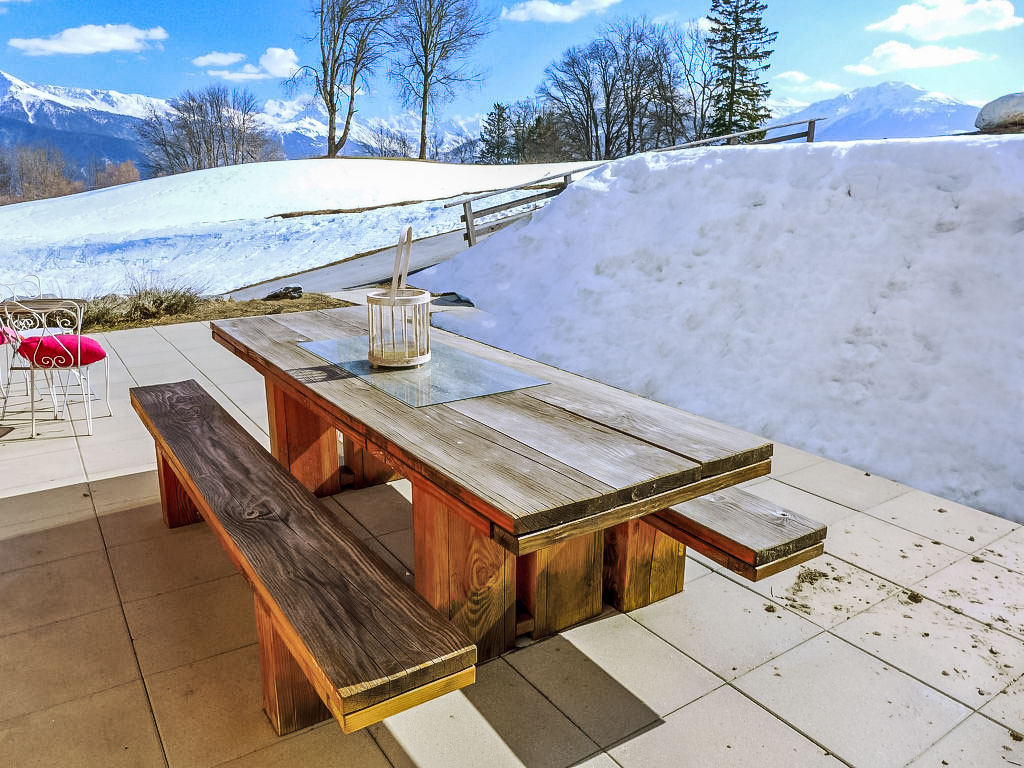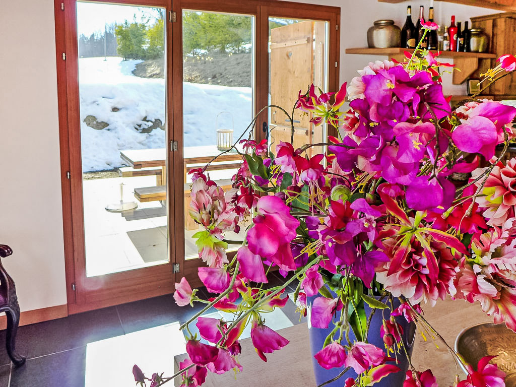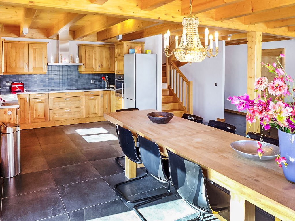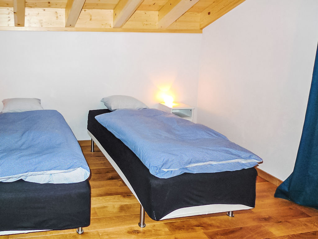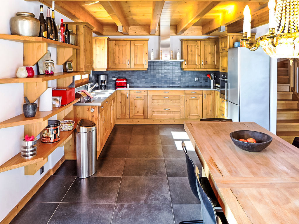 4-Zimmer-Chalet 200 m2 auf 3 Stockwerken. Komfortabel und modern eingerichtet: offenes grosses Wohn-/Esszimmer mit offenem Kamin, Kabel-TV, Flachbildschirm, CD und Stereoanlage. Ausgang zur Terrasse, Richtung Süden und Richtung Westen. Wohnküche (Backofen, Geschirrspüler, 4 Glaskeramikherd Platten, Toaster, Wasserkocher, Mikrowelle, Tiefkühler, elektrische Kaffeemaschine, Kapseln für die Kaffeemaschine (Nespresso) extra, Racletteofen, Fondue Set (Chinoise, Käse)). Sep. WC. Unteres Geschoss: 1 Zimmer mit 2 Betten und Dusche/WC. Obergeschoss: 1 abgeschrägtes grosses Zimmer mit 2 Betten. Ausgang zum Balkon, Richtung Süden. 1 abgeschrägtes Zimmer mit 2 Betten. Bidet, Bad/Dusche/WC. Balkon, Südlage Balkon, Südlage und Ostlage Terrasse, Südlage und Westlage, Rasen. Terrassenmöbel, Gartengrill (mobil), Liegestühle (2). Herrliche Panoramasicht auf die Berge und das Tal. Zur Verfügung: Waschmaschine, Wäschetrockner, Bügeleisen, Kinderhochstuhl, Babybett bis 2 Jahre, Haartrockner. Internet (Wireless LAN, gratis). Garage, Höhe 210 cm, Breite 275 cm. Bitte beachten: Nichtraucher-Haus. Schlafzimmer in der unteren Etage: blindes Fenster. Faltbares Babybett ohne Bettwäsche und ohne Decke.
