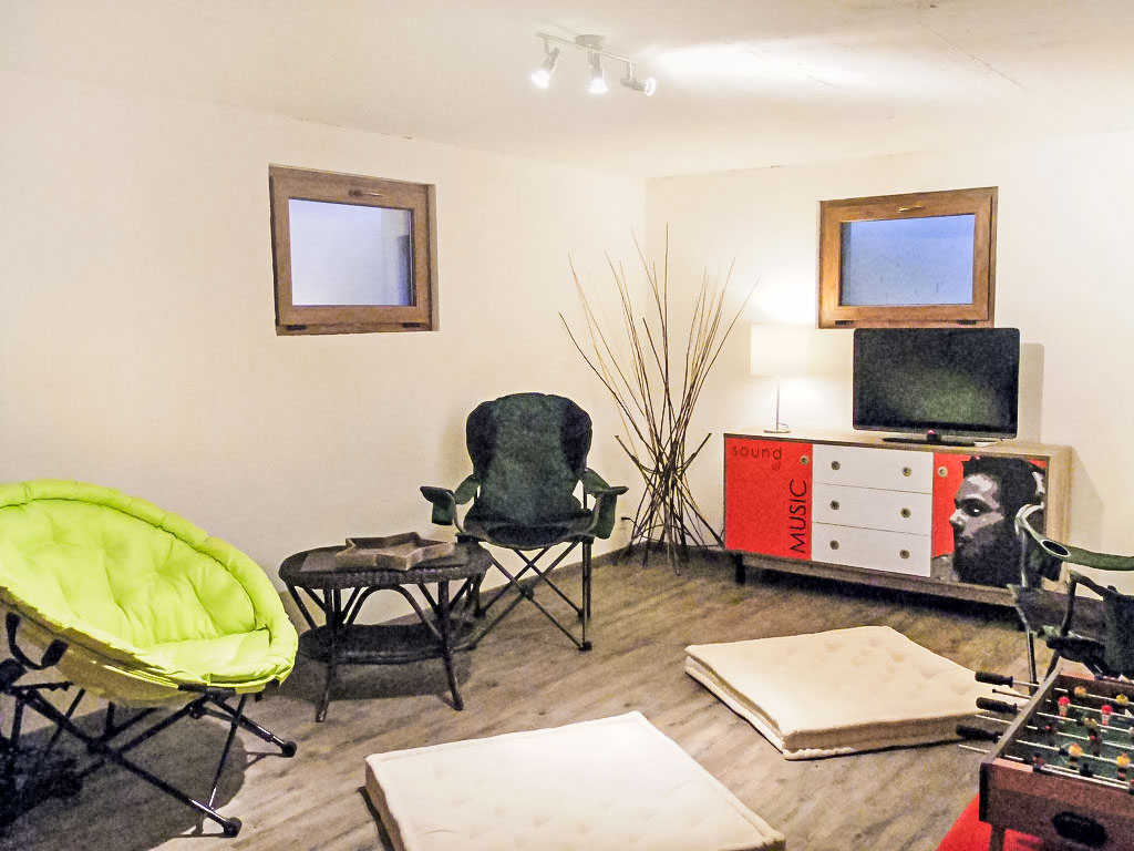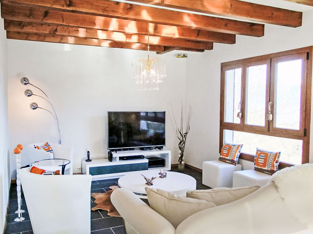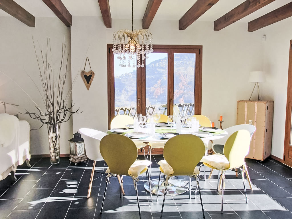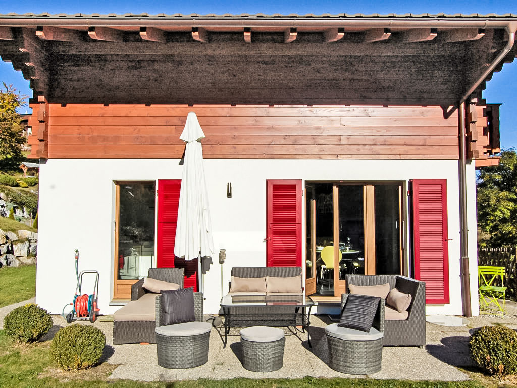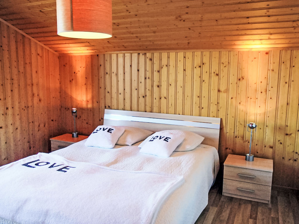 "Demi-Lune", 5-Zimmer-Chalet 150 m2. Geräumig und hell, komfortabel und geschmackvoll eingerichtet: Eingang. Wohn-/Esszimmer mit Kabel-TV. Ausgang zur Terrasse. Offene Küche (Backofen, Geschirrspüler, 4 Glaskeramikherd Platten, elektrische Kaffeemaschine, Kapseln für die Kaffeemaschine (nespresso) extra, Racletteofen, Fondue Set (Käse)) mit Bar. Dusche/WC. Fussbodenheizung. Unteres Geschoss: Spielzimmer mit Kabel-TV. Obergeschoss: 2 Zimmer, jedes Zimmer mit 1 franz. Bett (160 cm, Länge 200 cm). Ausgang zum Balkon, Richtung Osten. 1 Zimmer mit 1 franz. Bett (140 cm, Länge 200 cm). 1 Kinderzimmer mit 1 Bett (70 cm, Länge 170 cm), 1 Ausziehbett (2 x 90 cm, Länge 190 cm). Bad/Dusche/WC. Terrassenmöbel, Gartengrill, Liegestühle (2). Sehr schöne Sicht auf die Berge und das Tal. Zur Verfügung: Waschmaschine, Babybett. Internet (Wireless LAN, gratis). Parkplatz (2 Autos). Bitte beachten: Nichtraucher-Unterkunft.