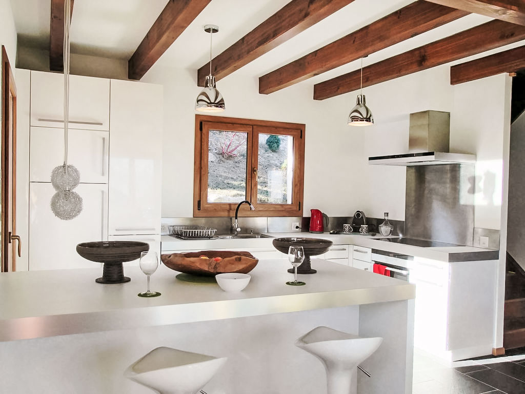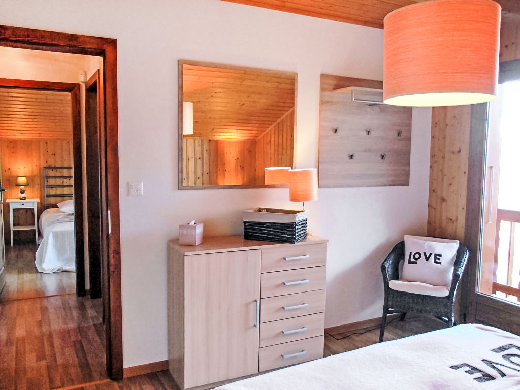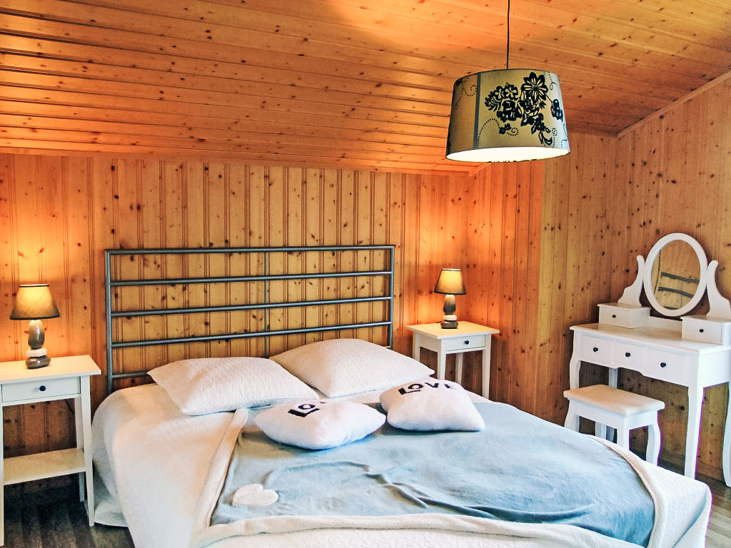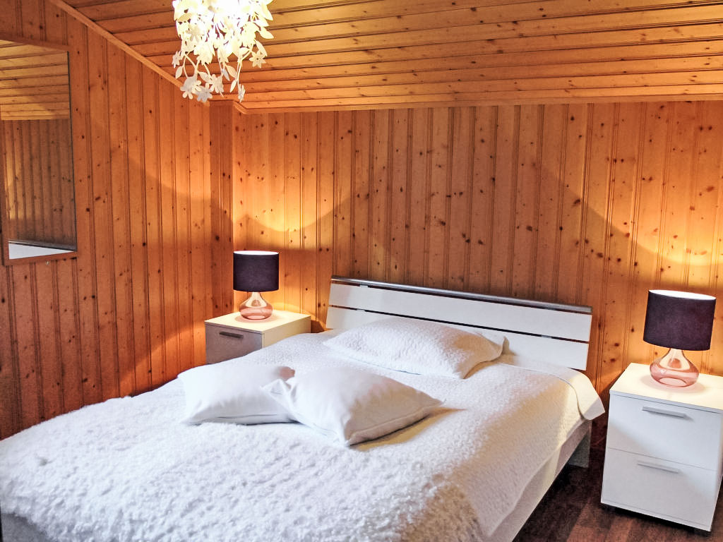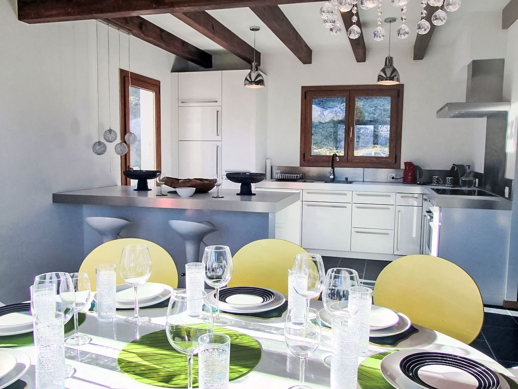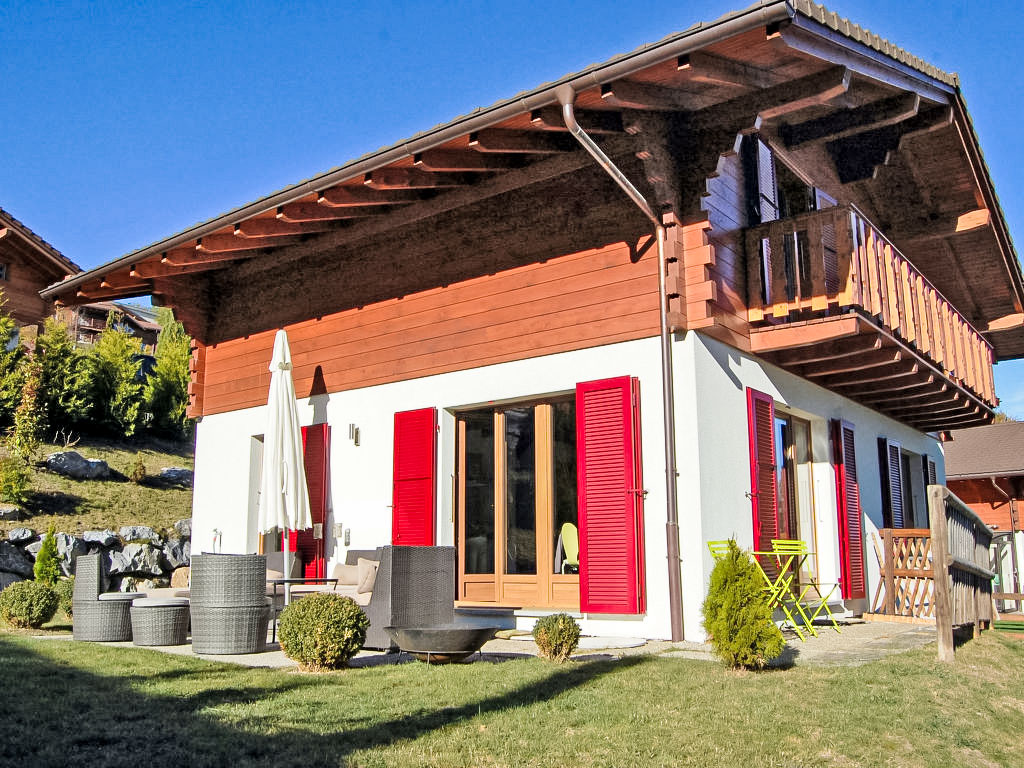 "Demi-Lune", 5-Zimmer-Chalet 150 m2. Geräumig und hell, komfortabel und geschmackvoll eingerichtet: Eingang. Wohn-/Esszimmer mit Kabel-TV. Ausgang zur Terrasse. Offene Küche (Backofen, Geschirrspüler, 4 Glaskeramikherd Platten, elektrische Kaffeemaschine, Kapseln für die Kaffeemaschine (nespresso) extra, Racletteofen, Fondue Set (Käse)) mit Bar. Dusche/WC. Fussbodenheizung. Unteres Geschoss: Spielzimmer mit Kabel-TV. Obergeschoss: 2 Zimmer, jedes Zimmer mit 1 franz. Bett (160 cm, Länge 200 cm). Ausgang zum Balkon, Richtung Osten. 1 Zimmer mit 1 franz. Bett (140 cm, Länge 200 cm). 1 Kinderzimmer mit 1 Bett (70 cm, Länge 170 cm), 1 Ausziehbett (2 x 90 cm, Länge 190 cm). Bad/Dusche/WC. Terrassenmöbel, Gartengrill, Liegestühle (2). Sehr schöne Sicht auf die Berge und das Tal. Zur Verfügung: Waschmaschine, Babybett. Internet (Wireless LAN, gratis). Parkplatz (2 Autos). Bitte beachten: Nichtraucher-Unterkunft.