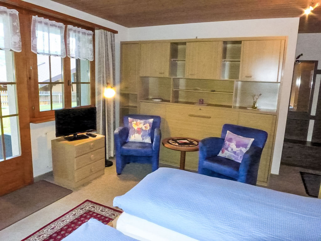 1-Zimmer-Wohnung 24 m2. Gemütlich eingerichtet: Wohn-/Schlafzimmer mit 2 Betten (90 cm, Länge 200 cm), Kabel-TV und Flachbildschirm. Ausgang zum Gartensitzplatz, Richtung Süden und Richtung Westen. Offene Küche (2 Kochplatten, Mikrowelle, elektrische Kaffeemaschine, Fondue Set (Käse)). Dusche/WC. Terrasse, Südlage und Westlage. Terrassenmöbel. Herrliche Sicht auf die Berge. Zur Verfügung: Internet (Wireless LAN, gratis). Parkplatz beim Haus. Bitte beachten: Nichtraucher-Unterkunft.