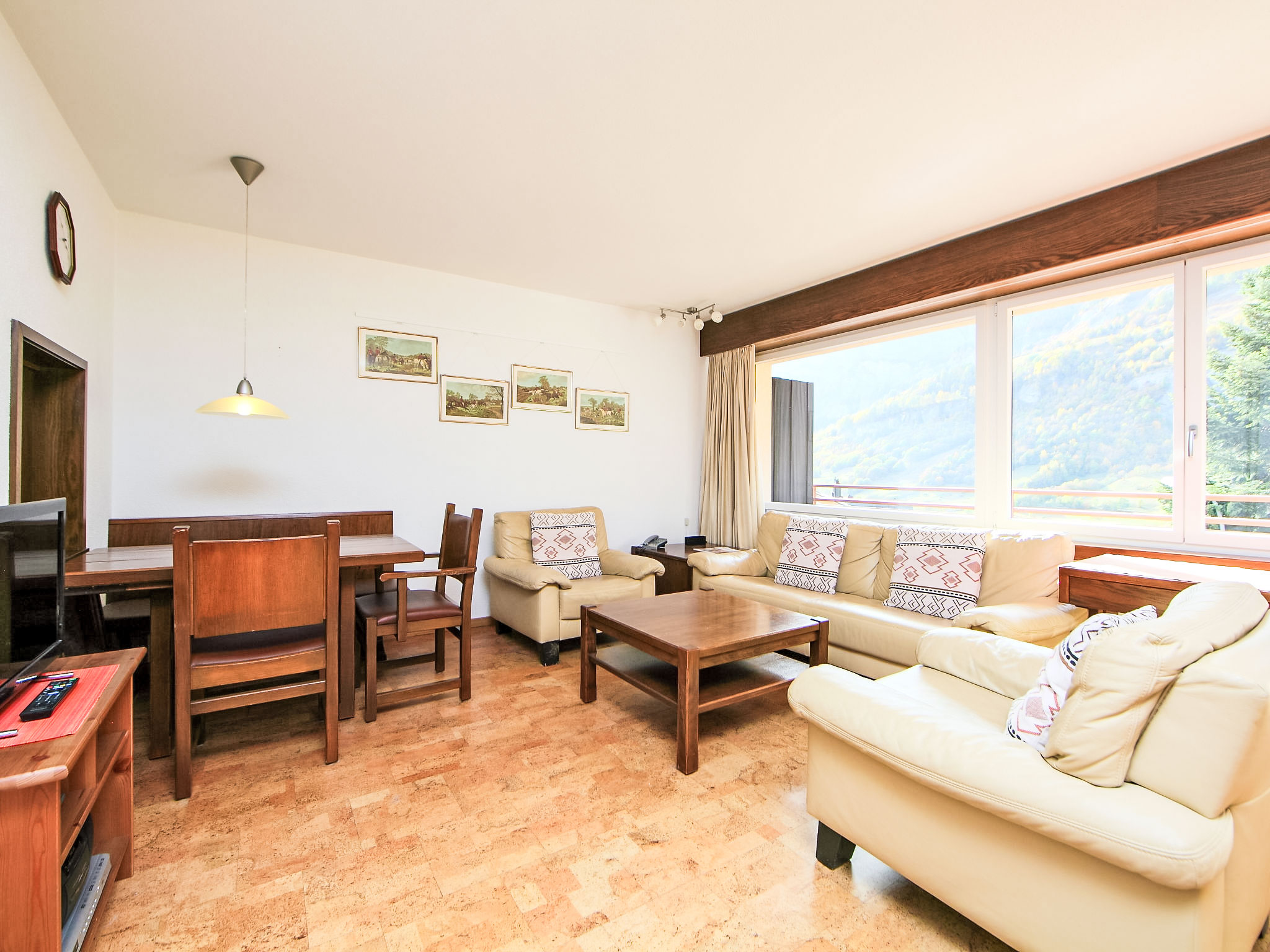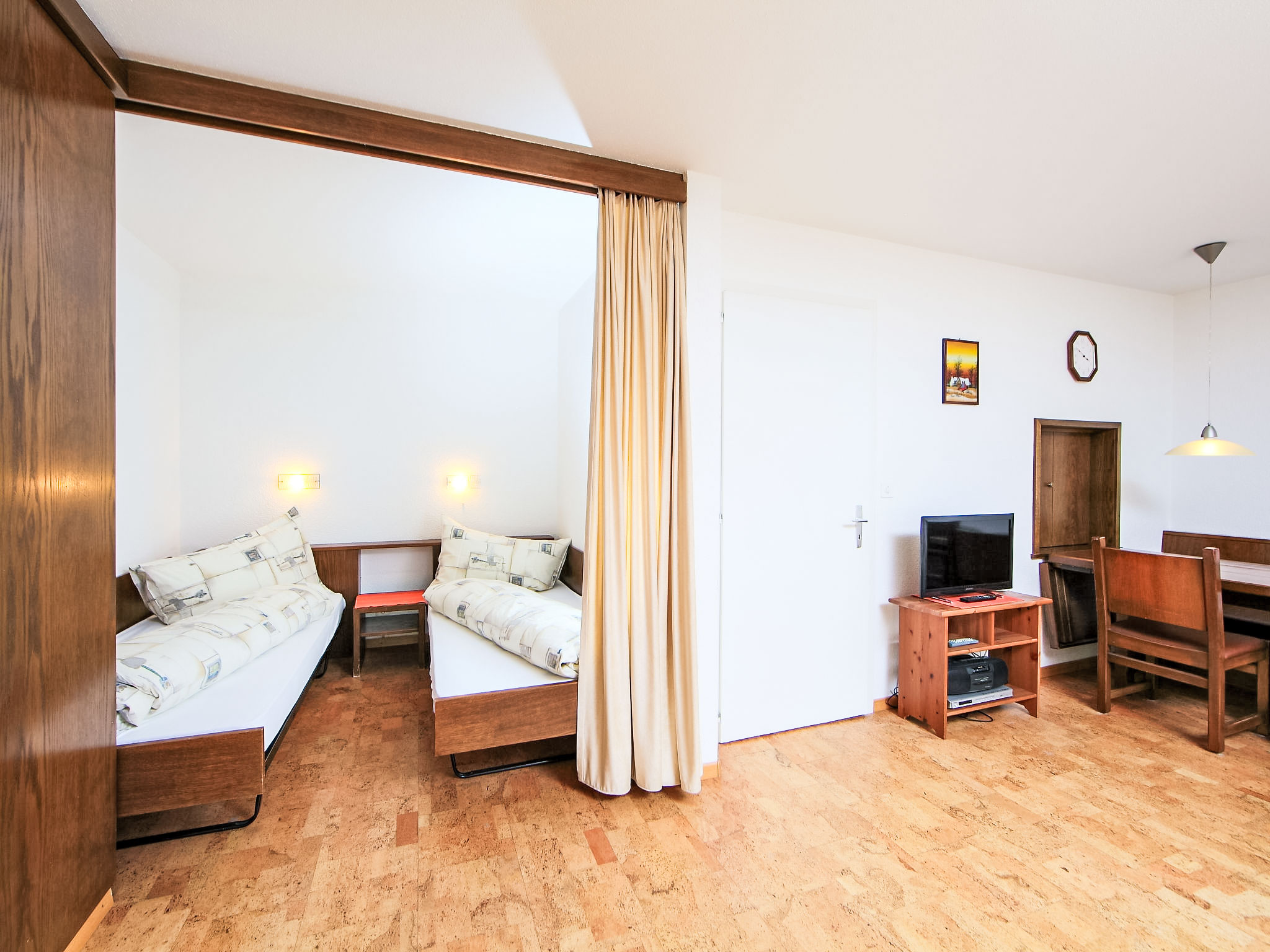1-Zimmer-Wohnung 50 m2 im 2. Stock. Zweckmässig eingerichtet: Wohn-/Esszimmer mit 2 Wandschrankbetten und Kabel-TV (Flachbildschirm), Radio. Schlafnische mit Vorhang mit 2 Betten. Küche (Backofen, Geschirrspüler, 4 Glaskeramikherd Platten, Mikrowelle, elektrische Kaffeemaschine). Bad/WC. Balkon. Terrassenmöbel. Sicht auf die Berge und das Tal. Zur Verfügung: Telefon. Internet (Wireless LAN, gratis). Bitte beachten: Nichtraucher-Unterkunft. Maximal 1 Haustier/Hund erlaubt.