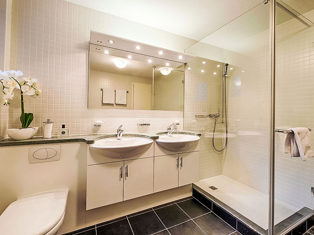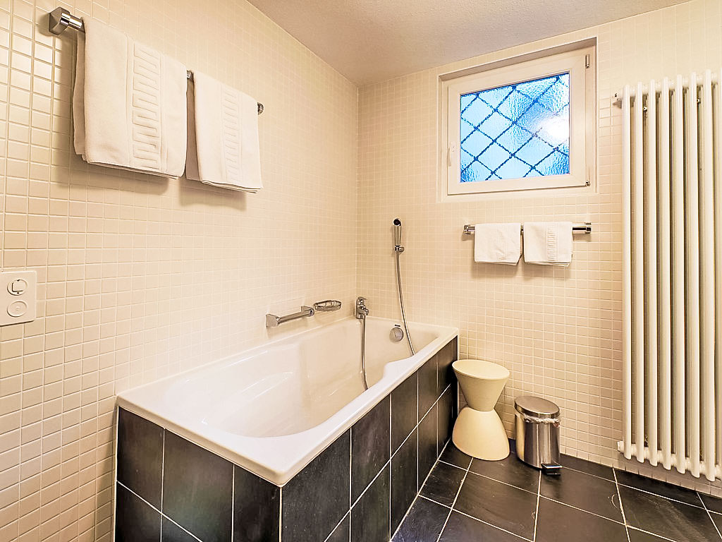 "Suite Classic", 2-Zimmer-Wohnung 90 m2 im 1. Stock, Südostlage. Wohn-/Esszimmer mit 1 Doppeldiwanbett, Sat-TV und Radio. 1 grosses Zimmer mit 2 Betten. Küche (Backofen, Geschirrspüler). Bad/WC. Balkon, Ostlage, kleiner Balkon. Schöne Sicht auf den See, die Berge und die Ortschaft. Maximal 1 Haustier/Hund erlaubt.