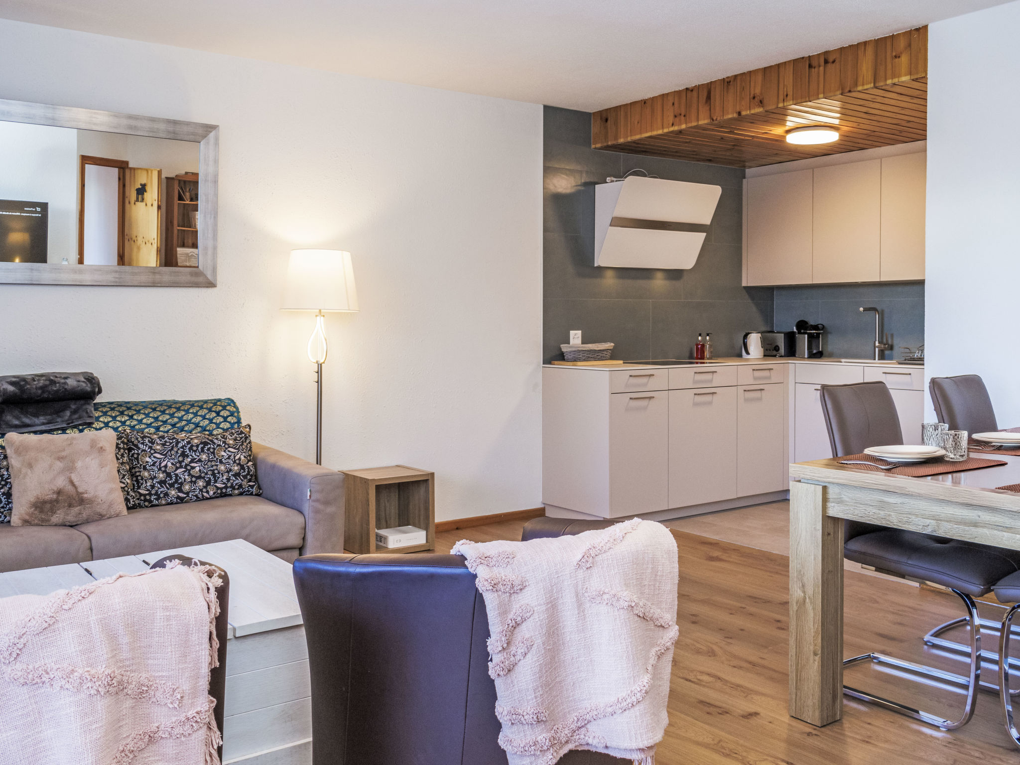 "Chaedoz 36", 2-Zimmer-Wohnung 45 m2 im 3. Stock, Westlage. Hell, renoviert im Jahre 2018, schön und geschmackvoll eingerichtet: Wohn-/Esszimmer mit 1 Doppeldiwanbett (1 x 140 cm, Länge 200 cm), Kabel-TV. Ausgang zum Balkon, Richtung Westen. 1 Zimmer mit 1 franz. Bett (160 cm, Länge 200 cm). Offene Küche (4 Kochplatten, Backofen, elektrische Kaffeemaschine, Kapseln für die Kaffeemaschine (nespresso) extra, Racletteofen, Fondue Set (Käse)). Dusche/WC. Balkon, Westlage. Balkonmöbel. Schöne Sicht auf die Berge. Zur Verfügung: Internet (Wireless LAN, gratis). Bitte beachten: Nichtraucher-Unterkunft. 1 Haustier/Hund erlaubt.