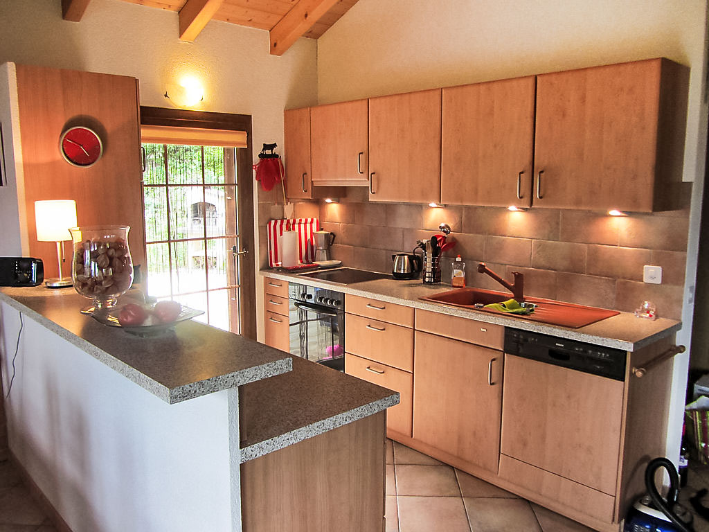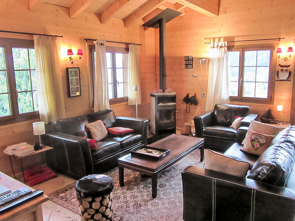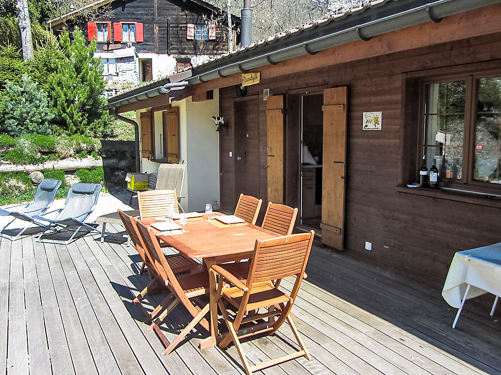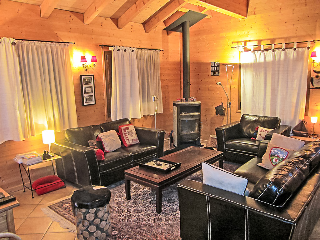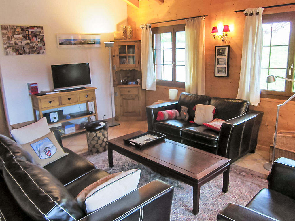 "Mamakylé", 3-Zimmer-Chalet 120 m2, Südlage. Geräumig, schön und modern eingerichtet: Eingang. Grosses Wohn-/Esszimmer mit Sat-TV, Flachbildschirm, Radio, Stereoanlage, DVD und Holzofen. Ausgang zum Balkon, zur Terrasse. 1 Zimmer mit 1 franz. Bett (1 x 160 cm, Länge 200 cm). Offene Küche (Backofen, Geschirrspüler, 4 Glaskeramikherd Platten, elektrische Kaffeemaschine, Racletteofen, Fondue Set (Chinoise, Käse)). Bad/WC. Unteres Geschoss: Eingang. 1 Zimmer mit 2 Betten (80 cm, Länge 200 cm). Dusche/WC. Ölheizung, Bodenheizung. Balkon 8 m2, grosse Terrasse 36 m2. Terrassenmöbel, Gartengrill, Liegestühle. Sehr schöne Panoramasicht auf die Berge und das Tal. Zur Verfügung: Waschmaschine, Wäschetrockner, Bügeleisen, Babybett bis 3 Jahre, Haartrockner. Internet (Wireless LAN, gratis). IPod docking station. Bitte beachten: Nichtraucher-Unterkunft.