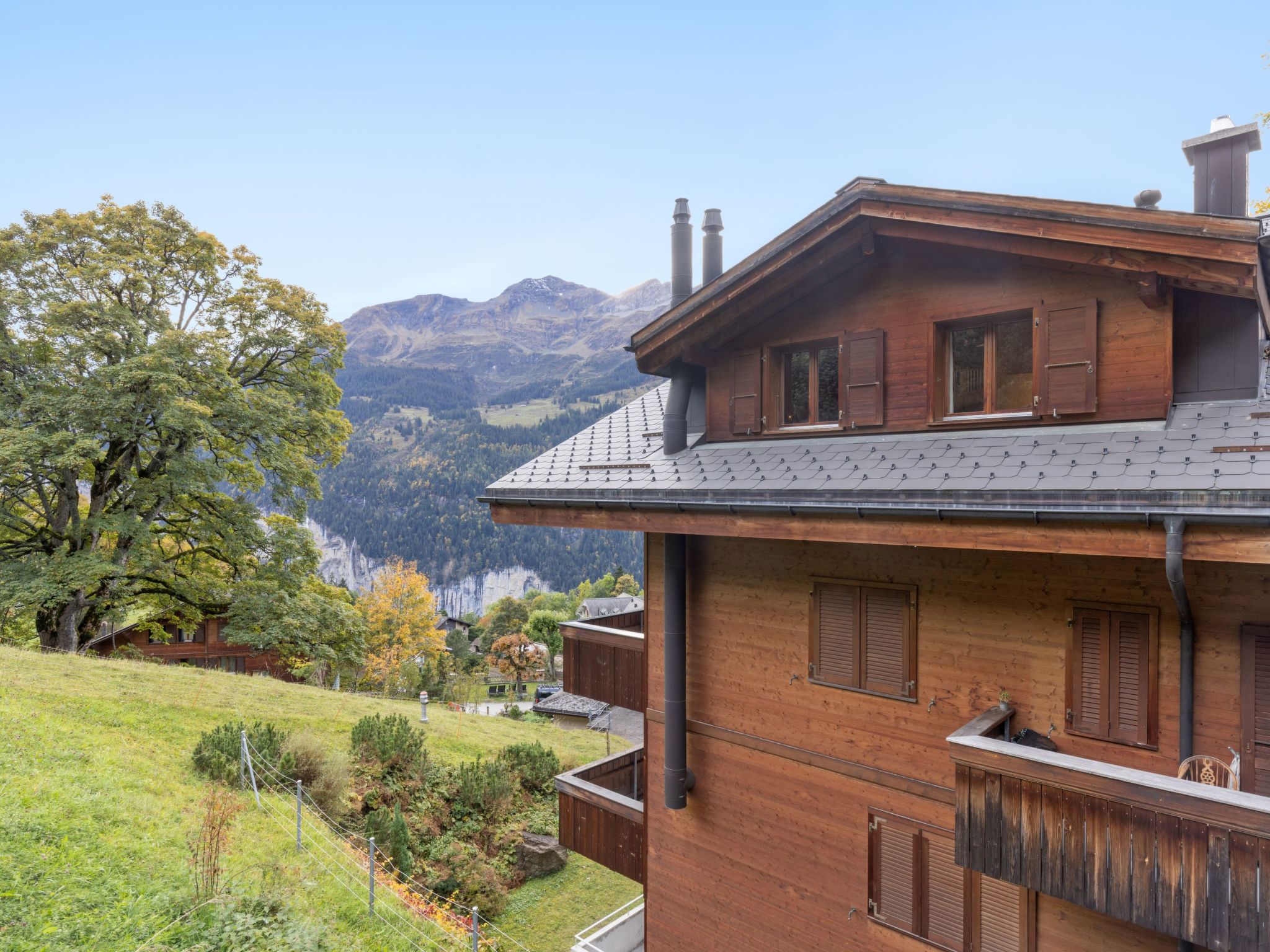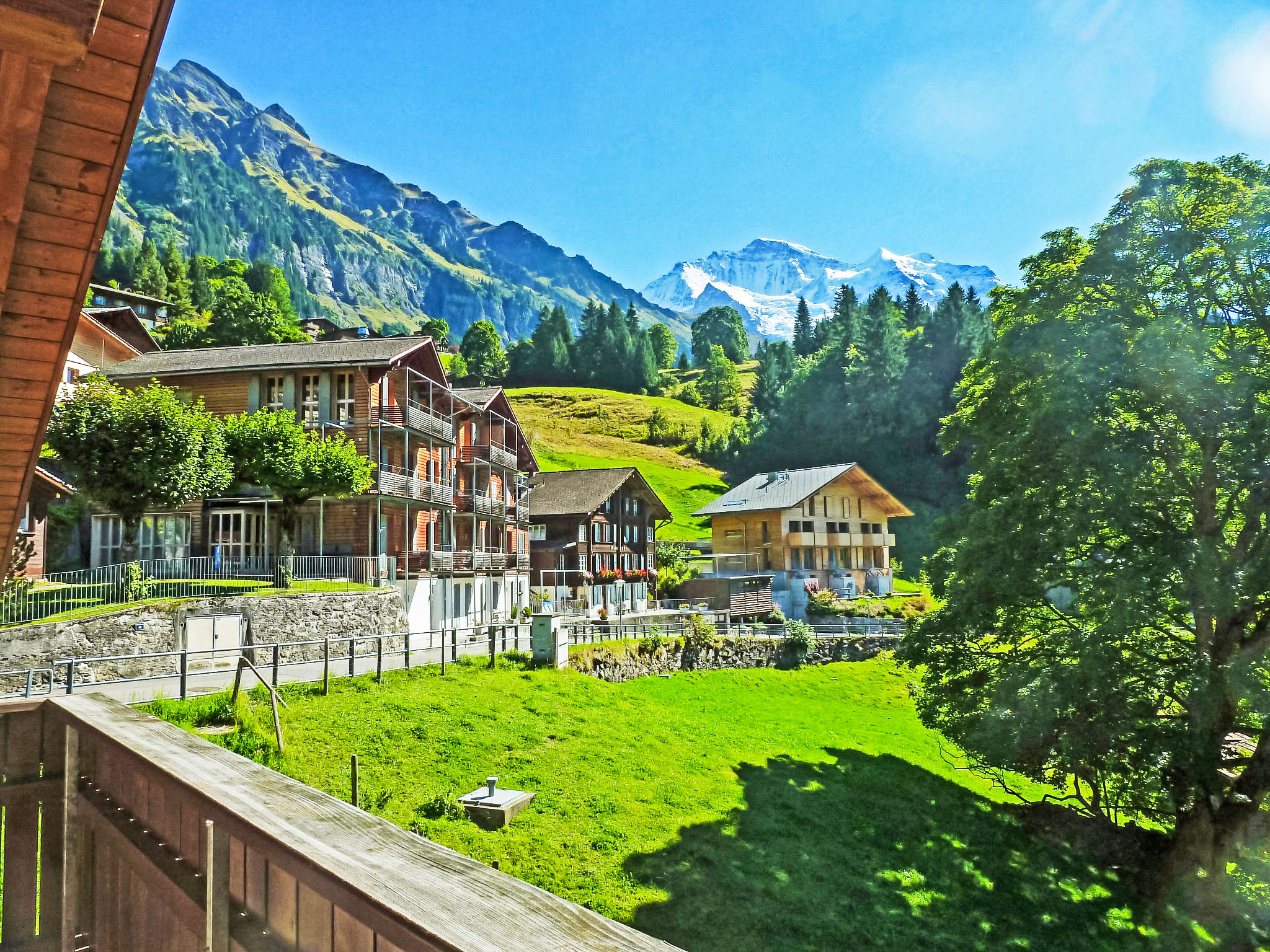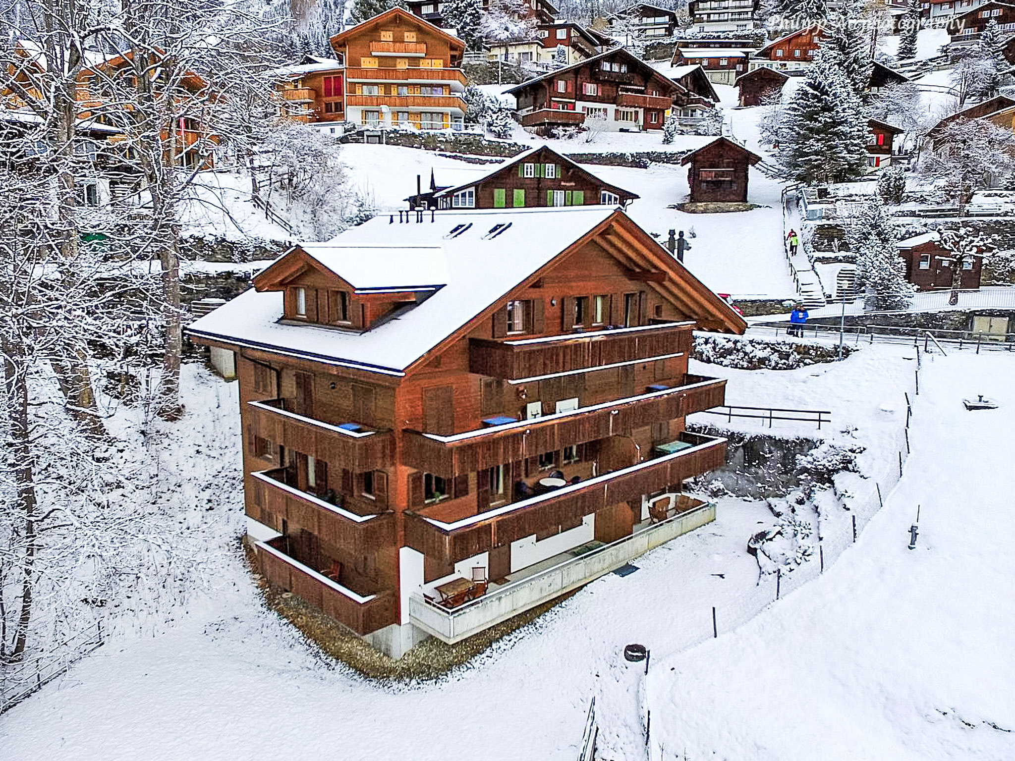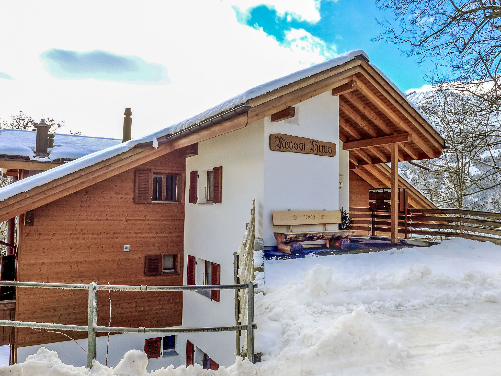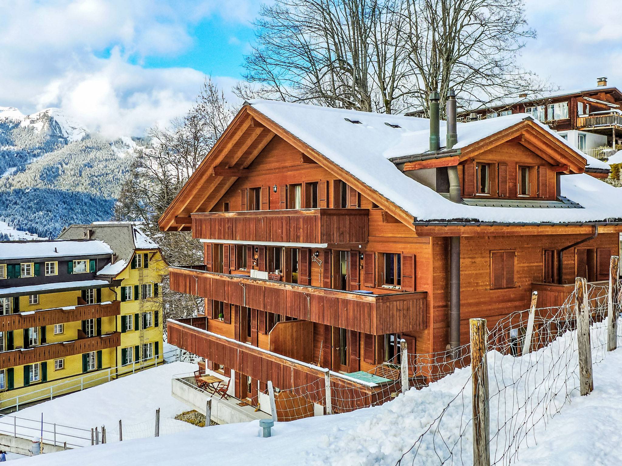 Appartementhaus "Roossihuus", Baujahr 2003. 400 m vom Zentrum von Wengen, exzellente Lage: Absolut zentral und dennoch ruhig. Im Hause: Zentralheizung. Einkaufsservice vor Anreise möglich. Einkaufsgeschäft, Supermarkt 400 m, Restaurant 100 m, Bar, Bäckerei 400 m, Zentrum zu Fuss in 5 Minuten erreichbar, Bahnstation "Wengen" 400 m, Freibad 700 m. Luftseilbahn, Skisportanlagen 400 m, Kinderspielplatz 150 m. Bitte beachten: autofreie Ferienanlage. Die Anreise erfolgt mit der Bergbahn. Anreise ist nur mit dem Zug ab Lauterbrunnen möglich – 14 Min. Fahrzeit.