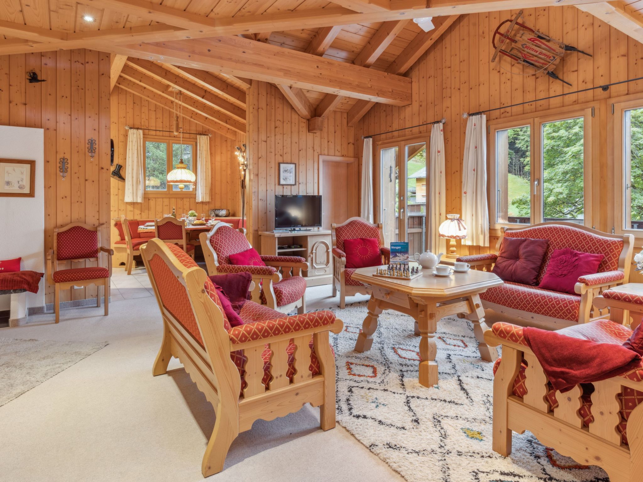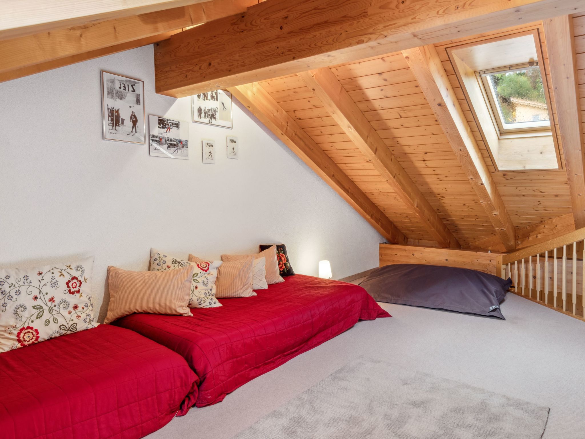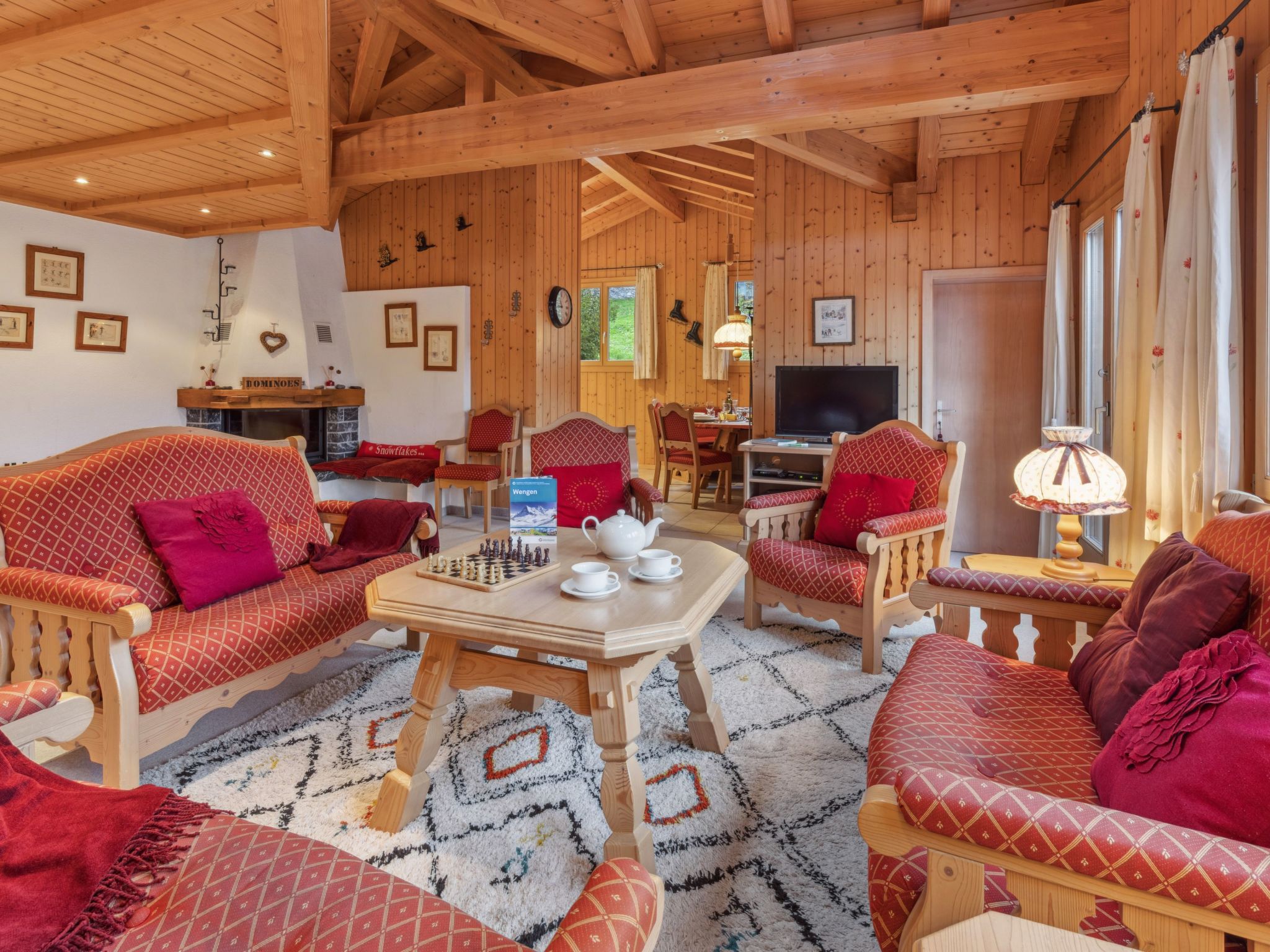 4-Zimmer-Wohnung 120 m2, im Dachgeschoss. Geräumig, rustikal und stilvoll eingerichtet: Wohn-/Esszimmer mit offenem Kamin, Kabel-TV, Radio, CD und DVD. 2 Zimmer, jedes Zimmer mit 1 Doppelbett (2 x 90 cm, Länge 200 cm). 1 Zimmer mit 2 Betten (90 cm, Länge 200 cm). Offene Küche (Backofen, Geschirrspüler, 4 Glaskeramikherd Platten, Toaster, Wasserkocher, elektrische Kaffeemaschine, Kapseln für die Kaffeemaschine (Nespresso) extra, Racletteofen, Fondue Set (Käse)). Dusche/WC, 2 Bäder/Duschen/WC. Grosser Balkon. Balkonmöbel. Sehr schöne Panoramasicht auf die Berge. Zur Verfügung: Bügeleisen, Haartrockner, Holz (extra). Internet (Wireless LAN, gratis). Bitte beachten: Nichtraucher-Unterkunft.