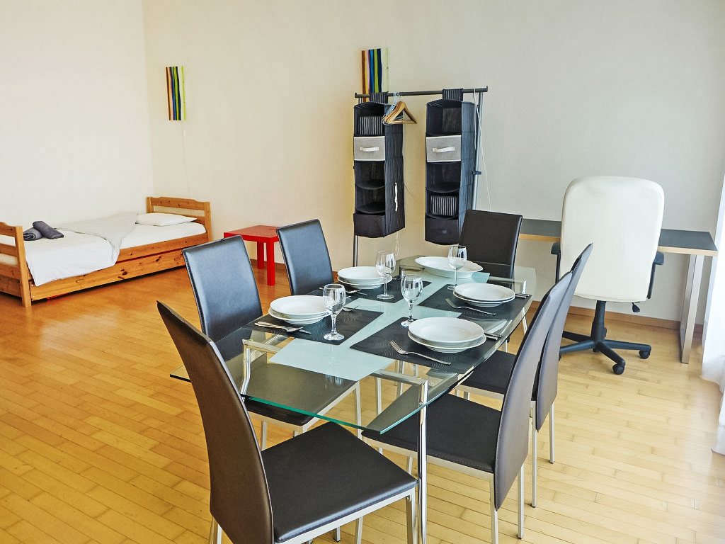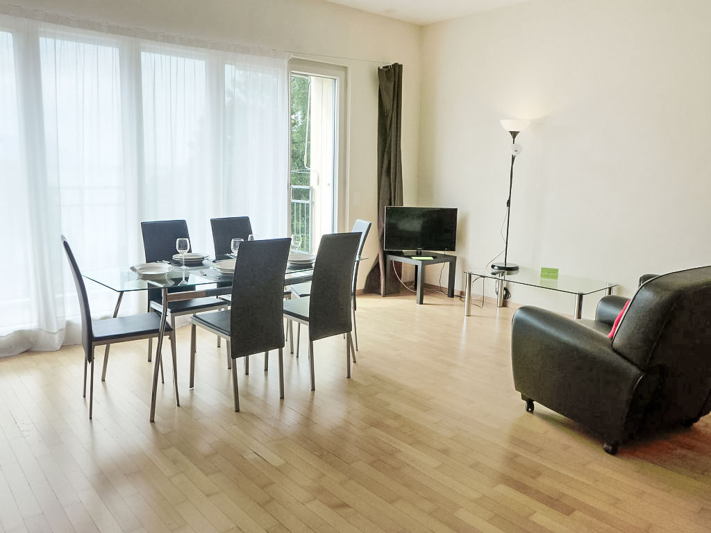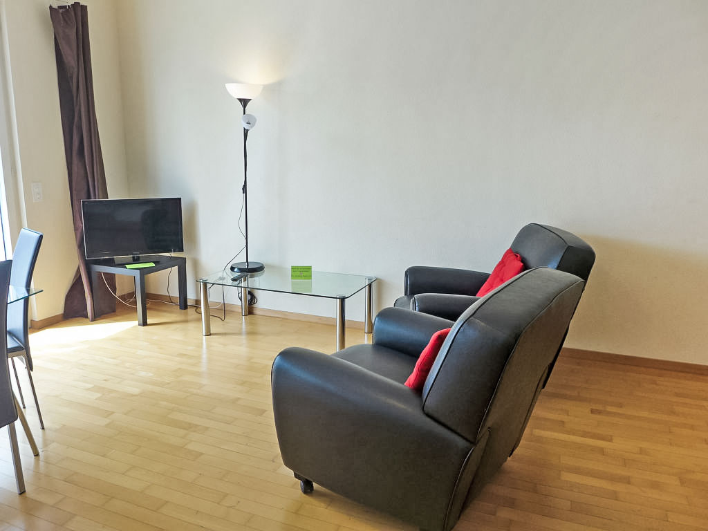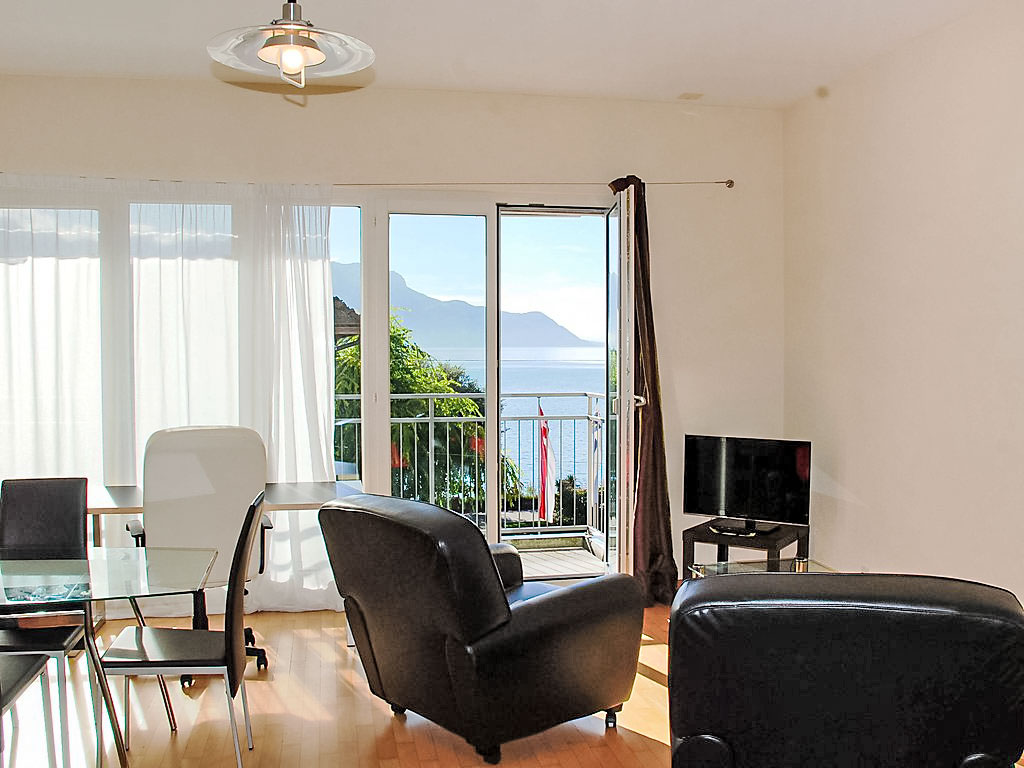 "Appt. 203", 2-Zimmer-Wohnung 90 m2 im 2. Stock. Zweckmässig und gemütlich eingerichtet: Wohn-/Schlafzimmer mit 1 Ausziehbett (2 Pers.), Esstisch und TV (Flachbildschirm). Ausgang zum Balkon, Richtung Süden und Richtung Westen. 1 Zimmer mit 2 Betten und Bad/WC. Offene Küche (Backofen, Geschirrspüler, 4 Glaskeramikherd Platten, Wasserkocher, Mikrowelle, elektrische Kaffeemaschine, Kapseln für die Kaffeemaschine (Nespresso) extra). Sep. WC. Bodenheizung. Balkon. Balkonmöbel, Abstellkammer. Sehr schöne Sicht auf den See. Zur Verfügung: Bügeleisen, Haartrockner. Internet (Wireless LAN). Parkplatz Nr. 59 (extra). Bitte beachten: Nichtraucher-Unterkunft.