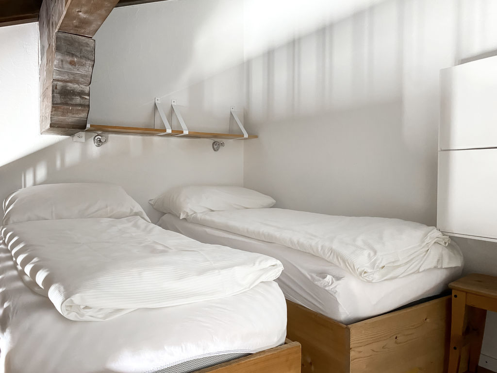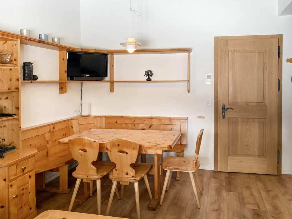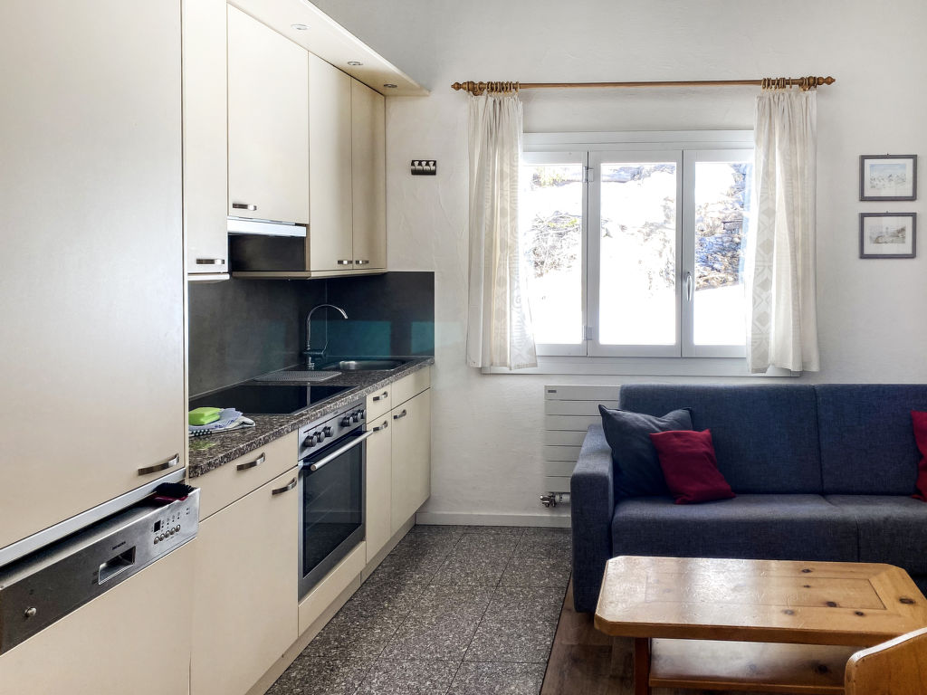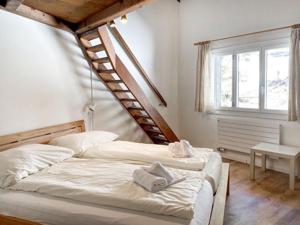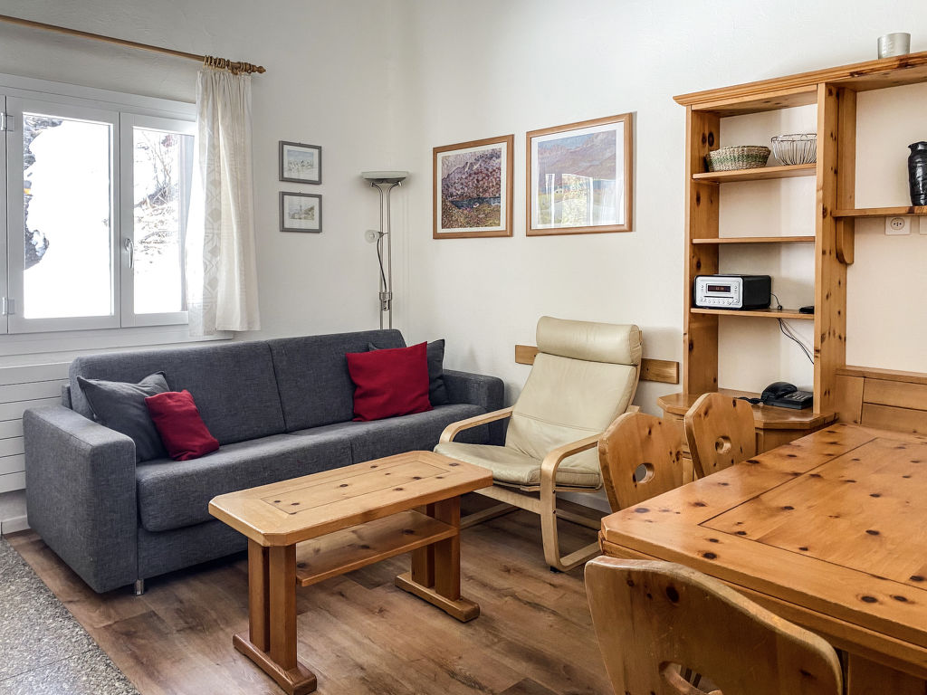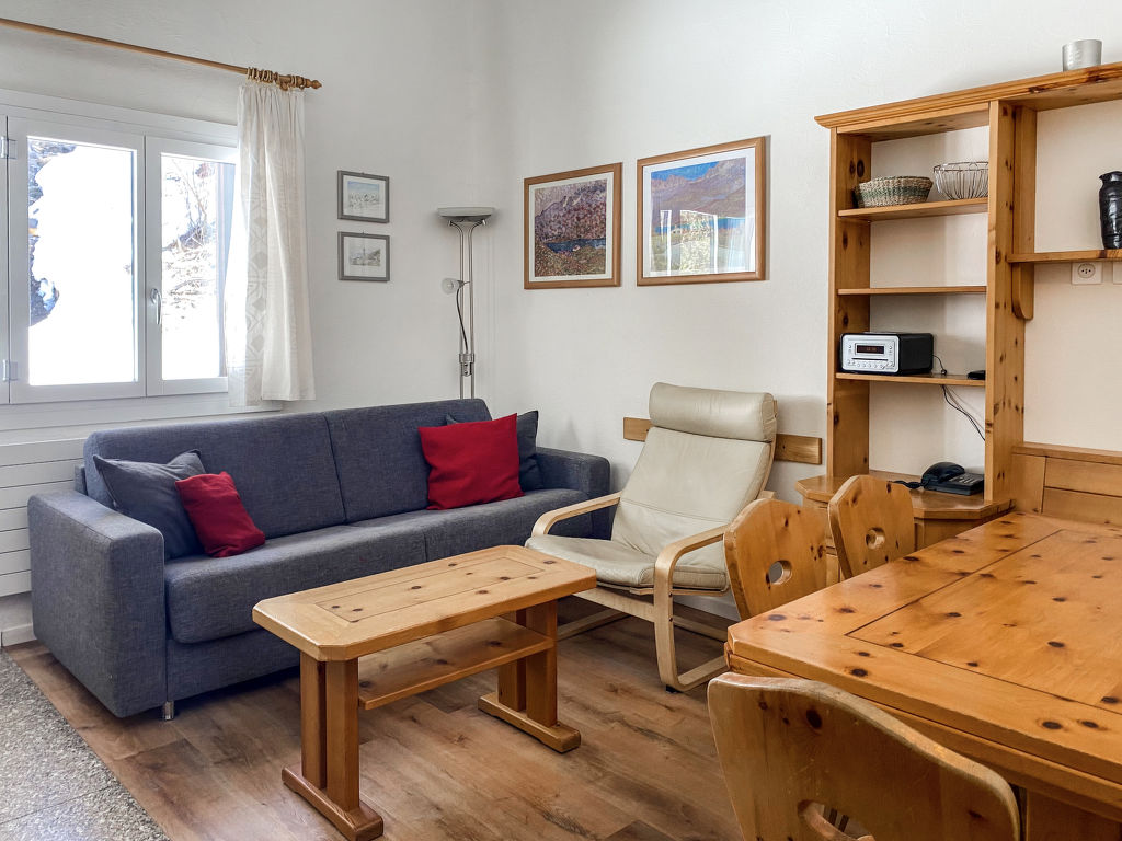 "59-3", 2-Zimmer-Wohnung 40 m2, Nordlage. Teilweise renoviert, schön und gemütlich eingerichtet: Wohn-/Esszimmer mit Essecke, Flachbildschirm, Radio und E-Heizung. Offene Galerie mit 2 Betten. 1 Zimmer mit 1 Doppelbett (2 x 100 cm, Länge 200 cm). Offene Küche (Backofen, Geschirrspüler, 4 Glaskeramikherd Platten, elektrische Kaffeemaschine). Bad/WC. Parkettböden. Sicht auf den Wald.