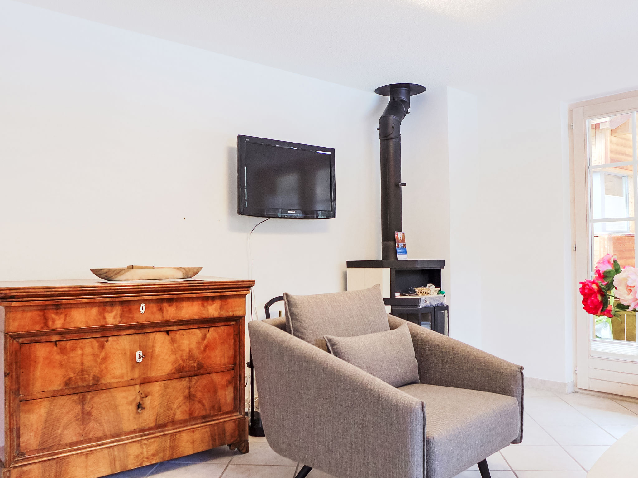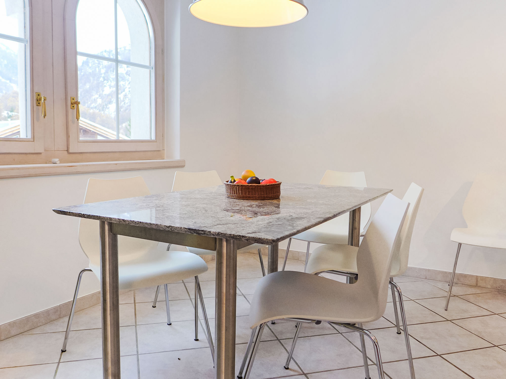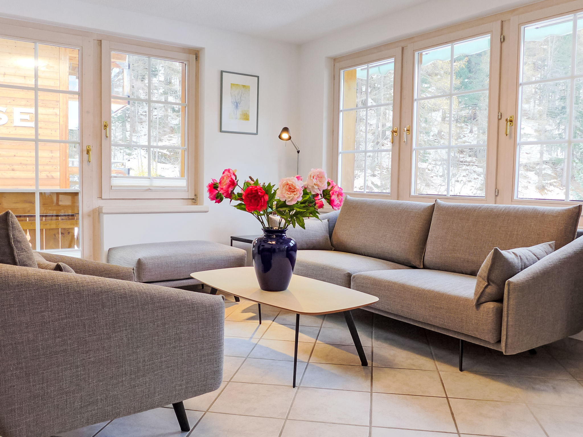 3-Zimmer-Wohnung 88 m2 im 3. Stock, Südlage. Sehr komfortabel und stilvoll eingerichtet: Wohn-/Esszimmer mit Esstisch und Kabel-TV. Ausgang zum Balkon. 1 Doppelzimmer mit 1 Doppelbett und Bad/WC. 1 Doppelzimmer mit 2 Betten. Offene Küche (4 Kochplatten, Backofen, Geschirrspüler, Toaster, Wasserkocher, Mikrowelle, Tiefkühler, elektrische Kaffeemaschine, Racletteofen, Fondue Set (Käse)). Dusche/WC. Balkon, Südlage. Balkonmöbel. Sehr schöne Panoramasicht auf die Berge. Zur Verfügung: Haartrockner. Internet (Wireless LAN, gratis). Bitte beachten: Nichtraucher-Unterkunft.