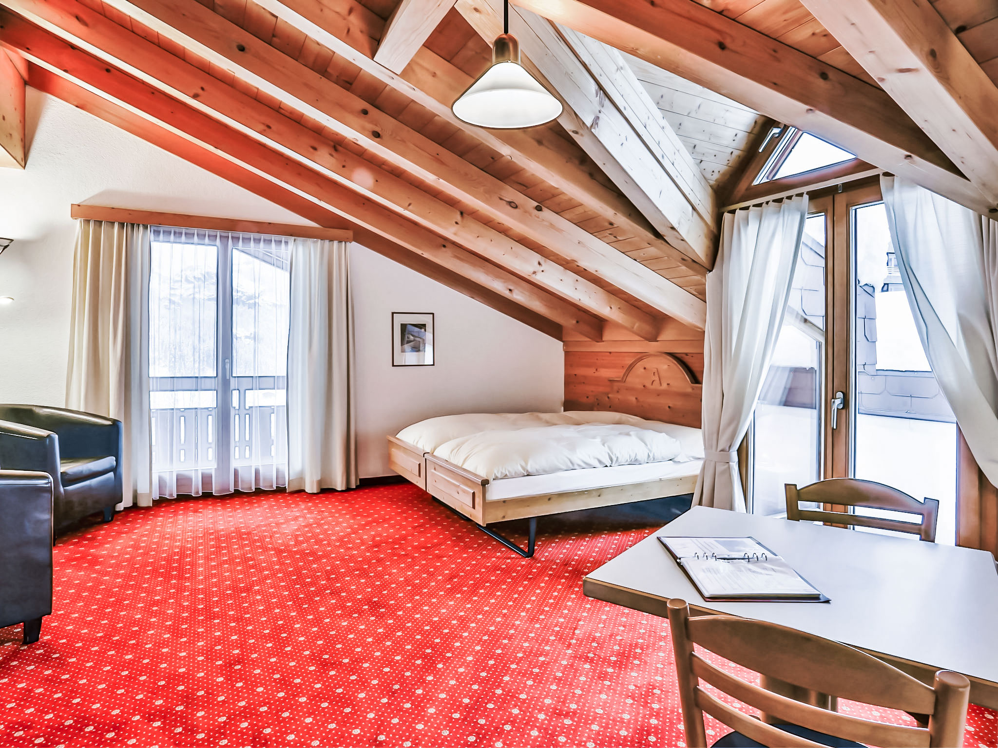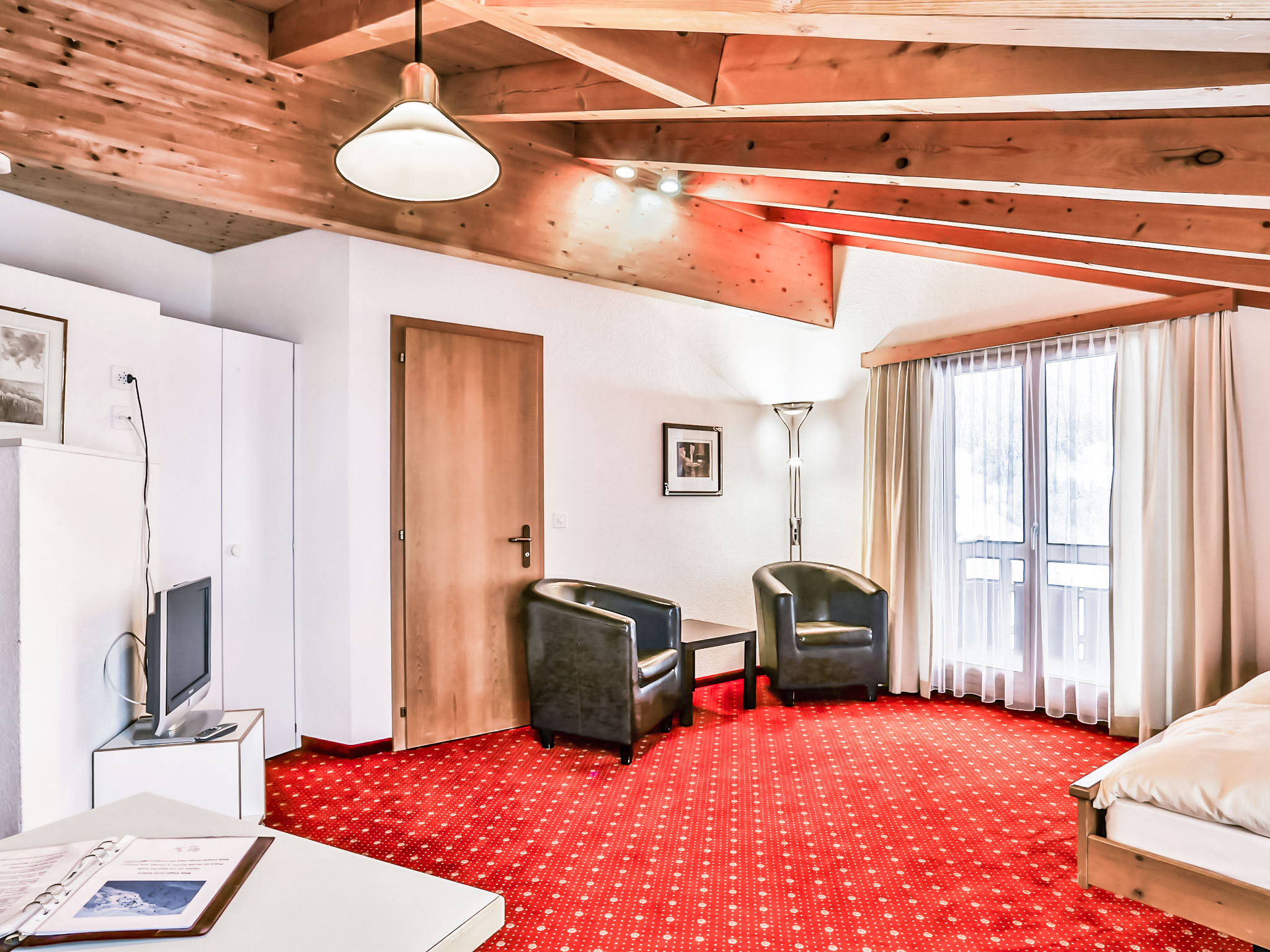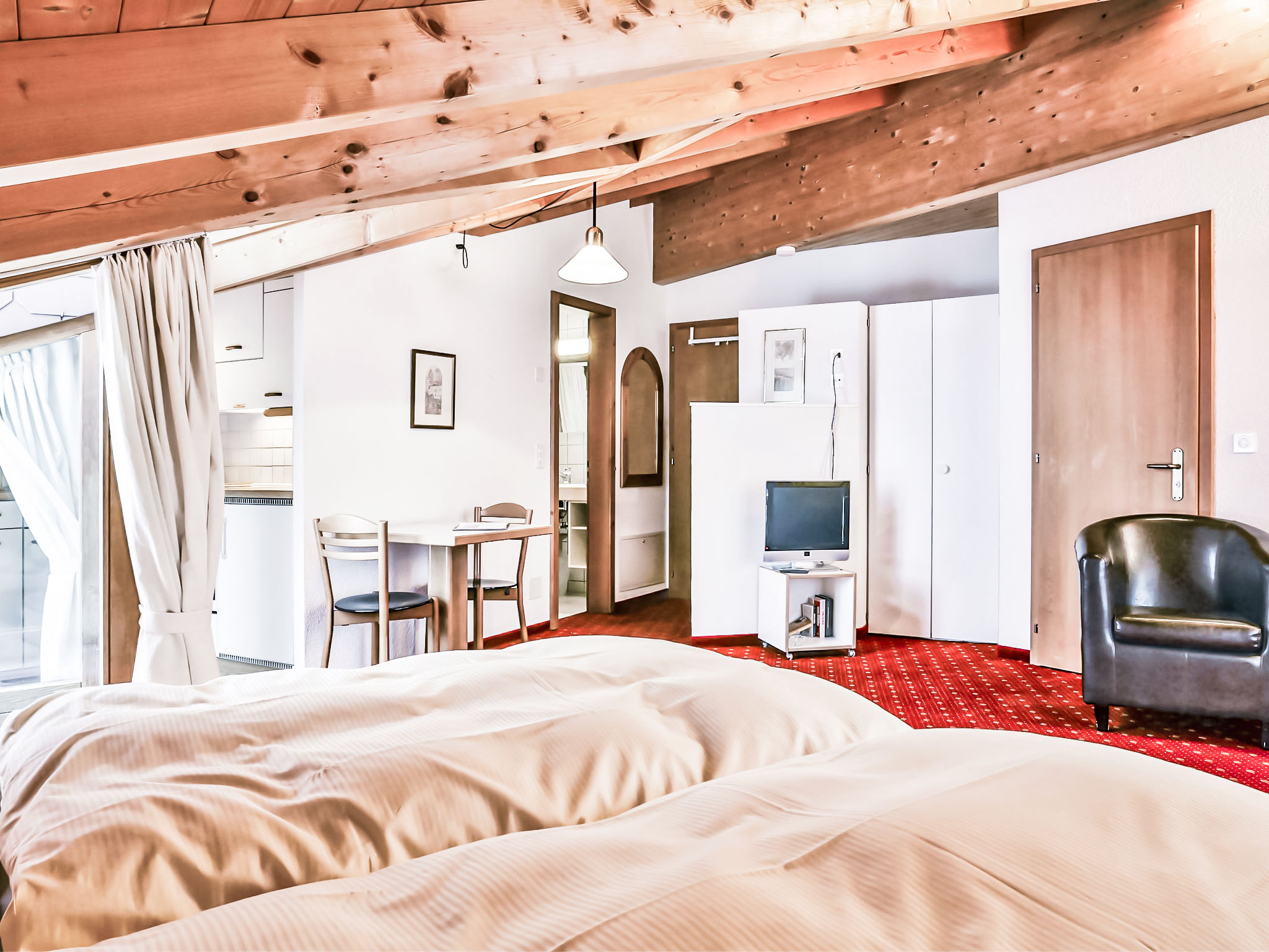 1-Zimmer-Wohnung 29 m2 im 4. Stock, Südlage. Wohn-/Schlafzimmer mit 2 Betten und Kabel-TV (Flachbildschirm). Offene Küche (Backofen, Toaster, Wasserkocher, elektrische Kaffeemaschine) mit Esstisch. Bad/WC. Balkon, Südlage Balkon, Westlage. Terrassenmöbel. Sicht auf die Berge. Zur Verfügung: Haartrockner. Internet (Wireless LAN, gratis). Bitte beachten: Nichtraucher-Unterkunft. Maximal 1 Haustier/Hund erlaubt. Ein Fondue Set (Fleisch oder Käse) sowie ein Raclette Ofen kann an der Rezeption ausgeliehen werden.